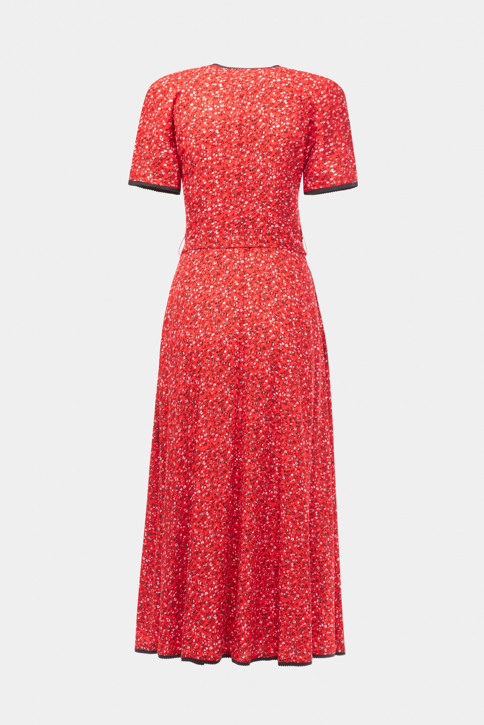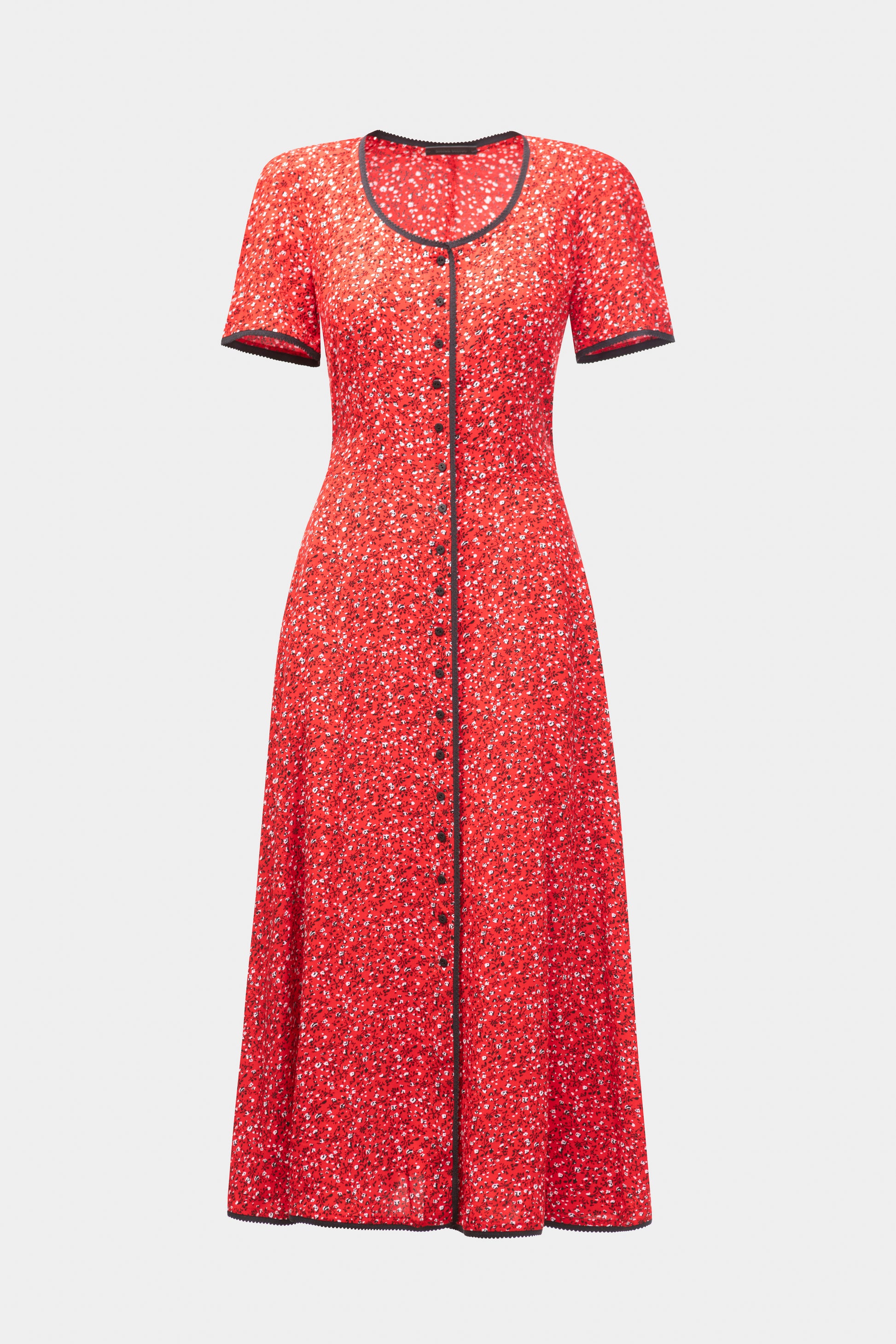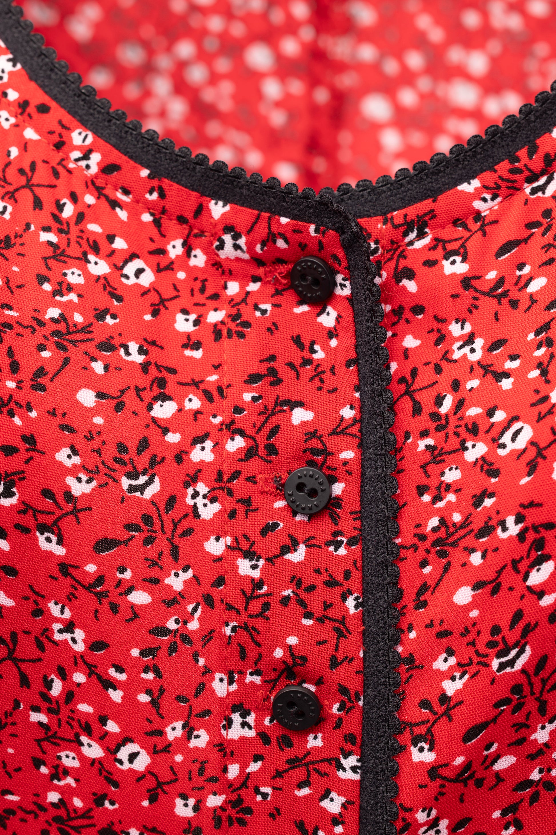 Leichtes, feminines Kleid für alltägliche und sommerliche Anlässe. Der Stoff des Kleides besteht aus einem kleinen Blumenmuster. Ein tailliertes Oberteil mit rundem Ausschnitt, ausdrucksstarken runden Raglanschleifen, wird vorne mit Marken-Metallknöpfen geschlossen, formt die Silhouette schön, ein nach unten leicht ausgestellter Rock sorgt für Bewegung und Leichtigkeit, es gibt Seitentaschen. Kurze Ärmel. Die Kanten sind mit einem Zierband zart gesäumt. An den Seiten der Taille befinden sich Schlaufen und ein dünner Einziehriemen ist eingenäht, mit dem Sie die Taille anpassen können. Er kann vorne oder hinten gebunden werden, ebenso wie jeder andere Ledergürtel. Der Stoff ist dünn, fließend, angenehm am Körper – perfekt für die warme Jahreszeit.