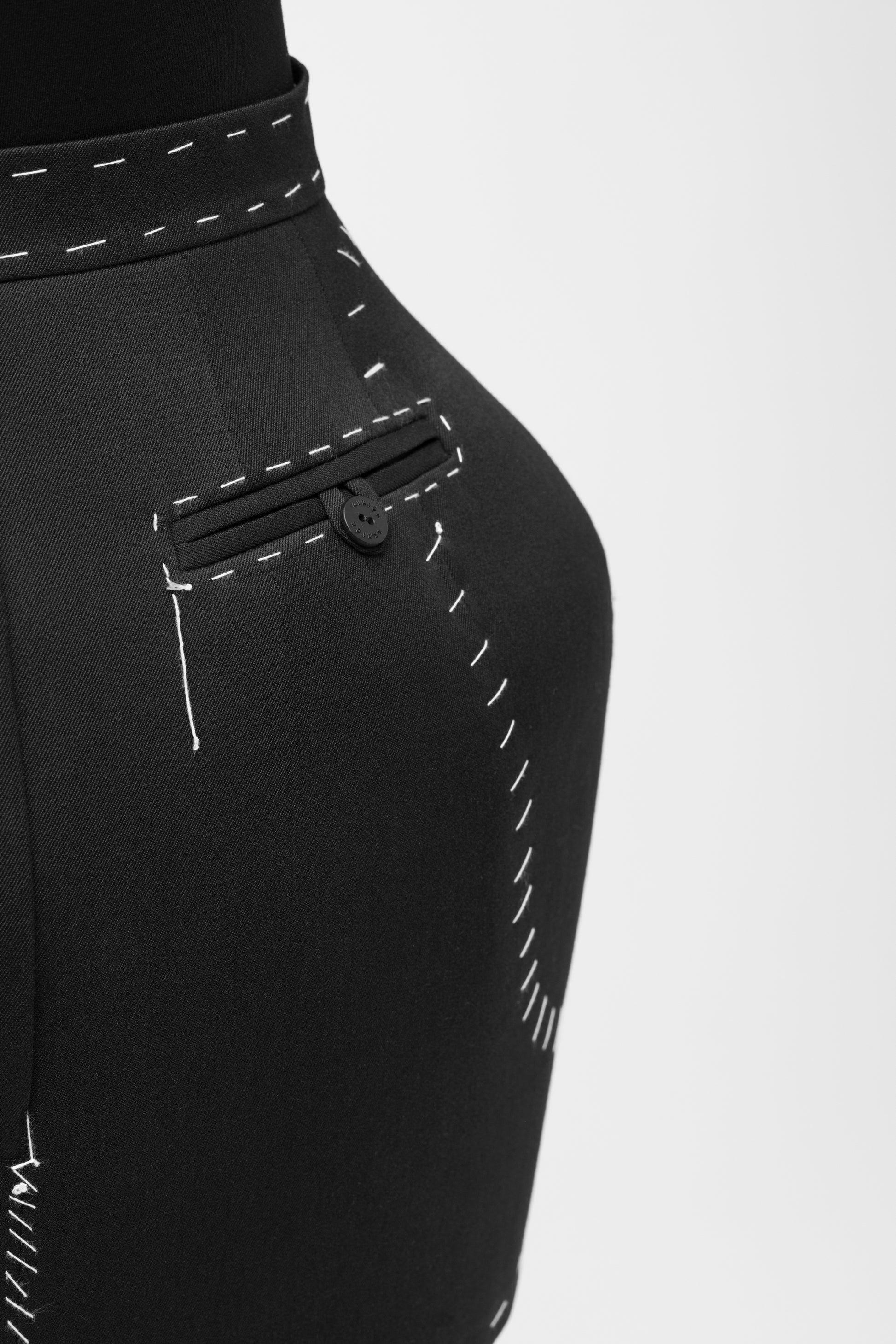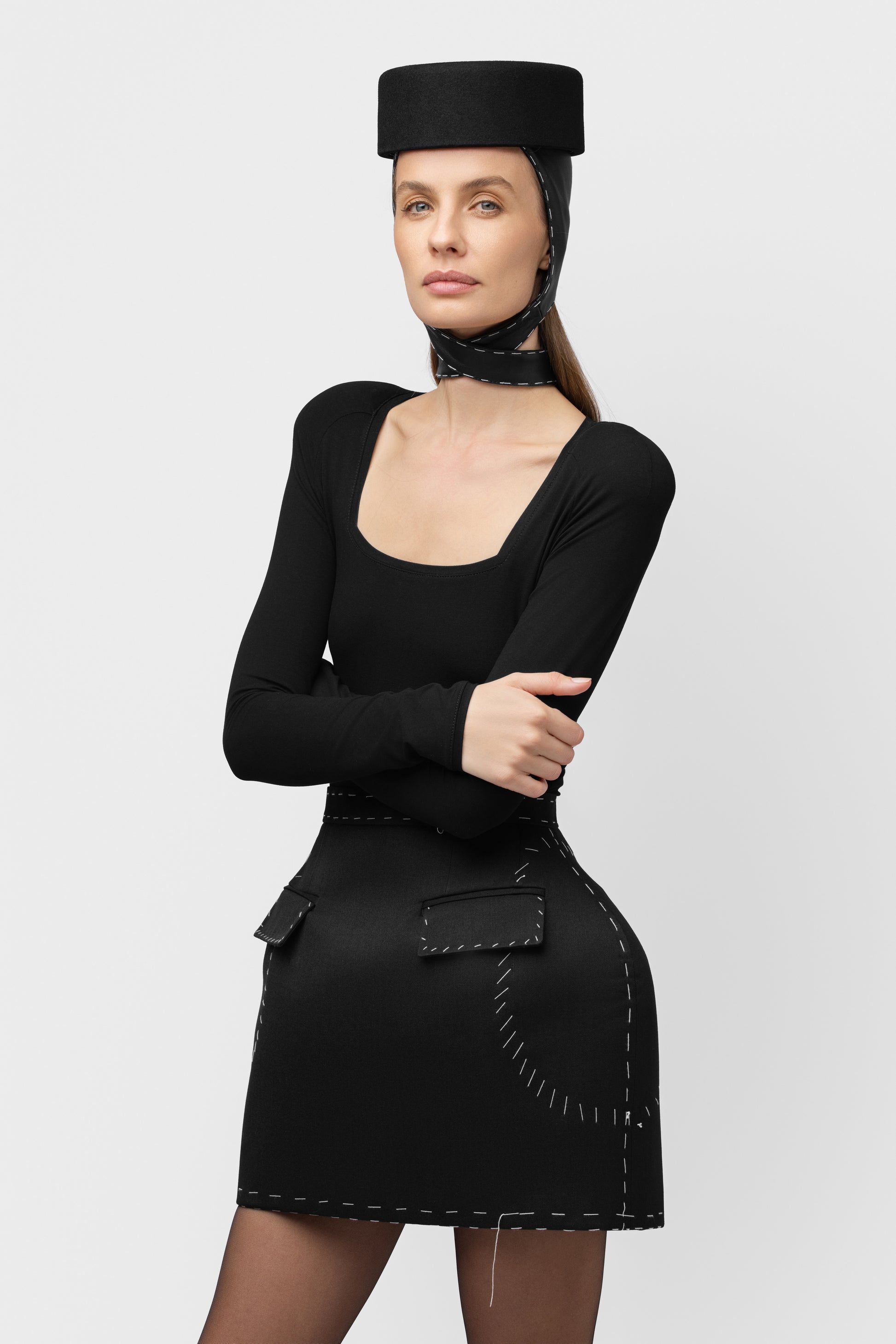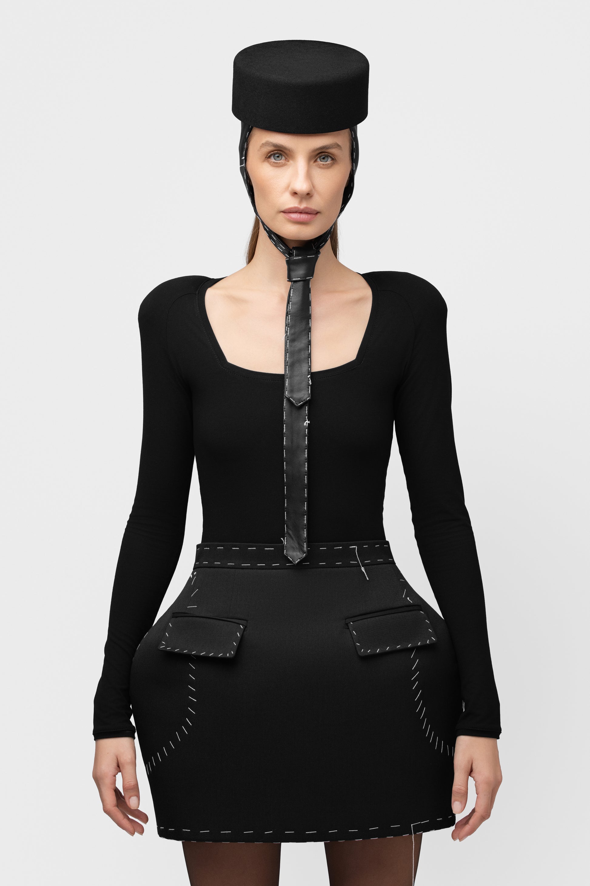 A sculptural, voluminous skirt crafted from stiffened, fused wool with structural inserts that preserve its shape while worn. Visible white stitching highlights the construction lines and reflects the aesthetics of the tailoring process. The skirt visually elongates the silhouette, accentuates the waist, and flatters various body types.