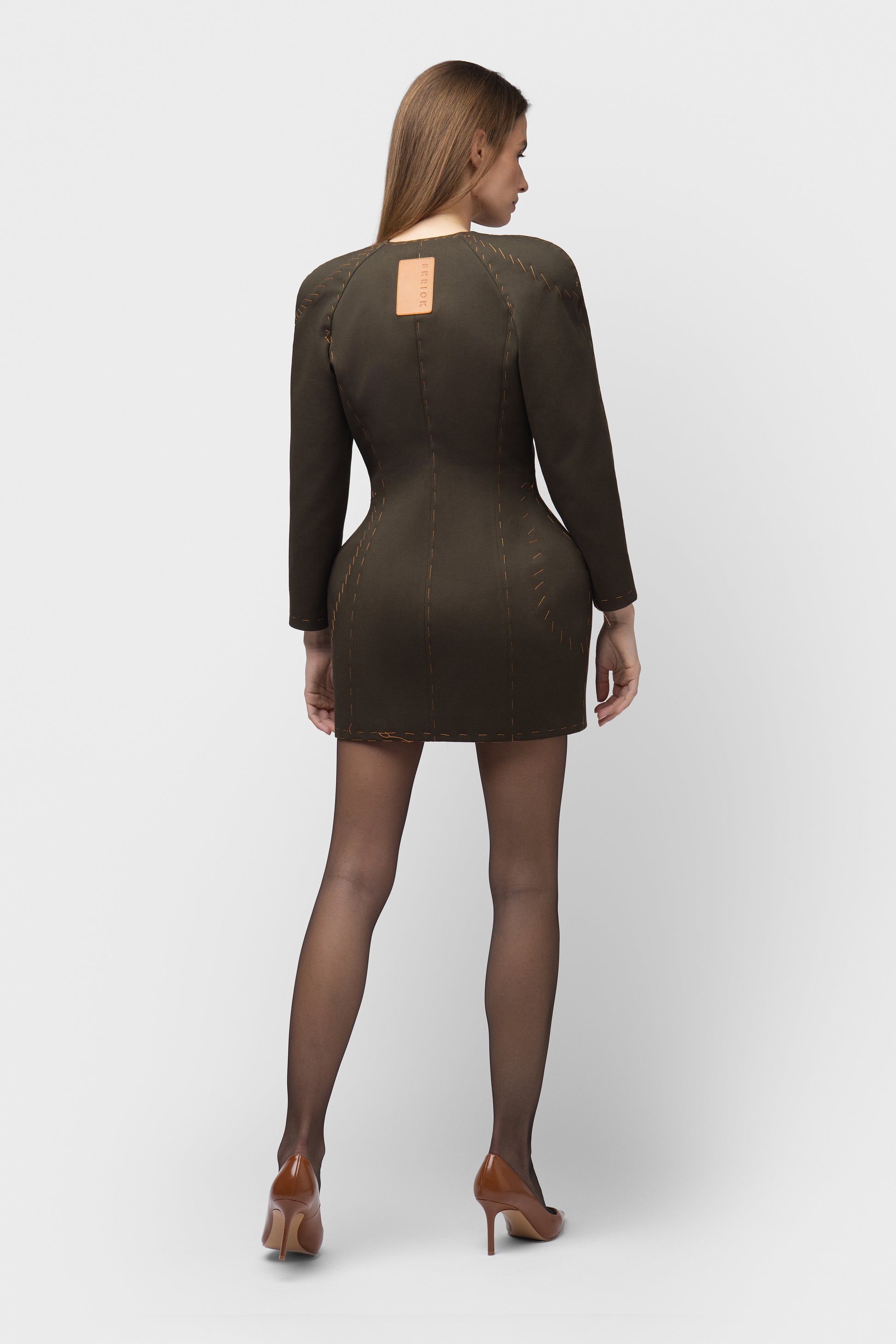 The fitted bodice with a square open neckline highlights the shoulders and neckline. Long raglan sleeves with accentuated shoulder seams create a modern, powerful silhouette. Two deep front slits allow for ease of movement, while the pronounced seams boldly reveal the collection’s core idea – a piece where construction becomes aesthetic.