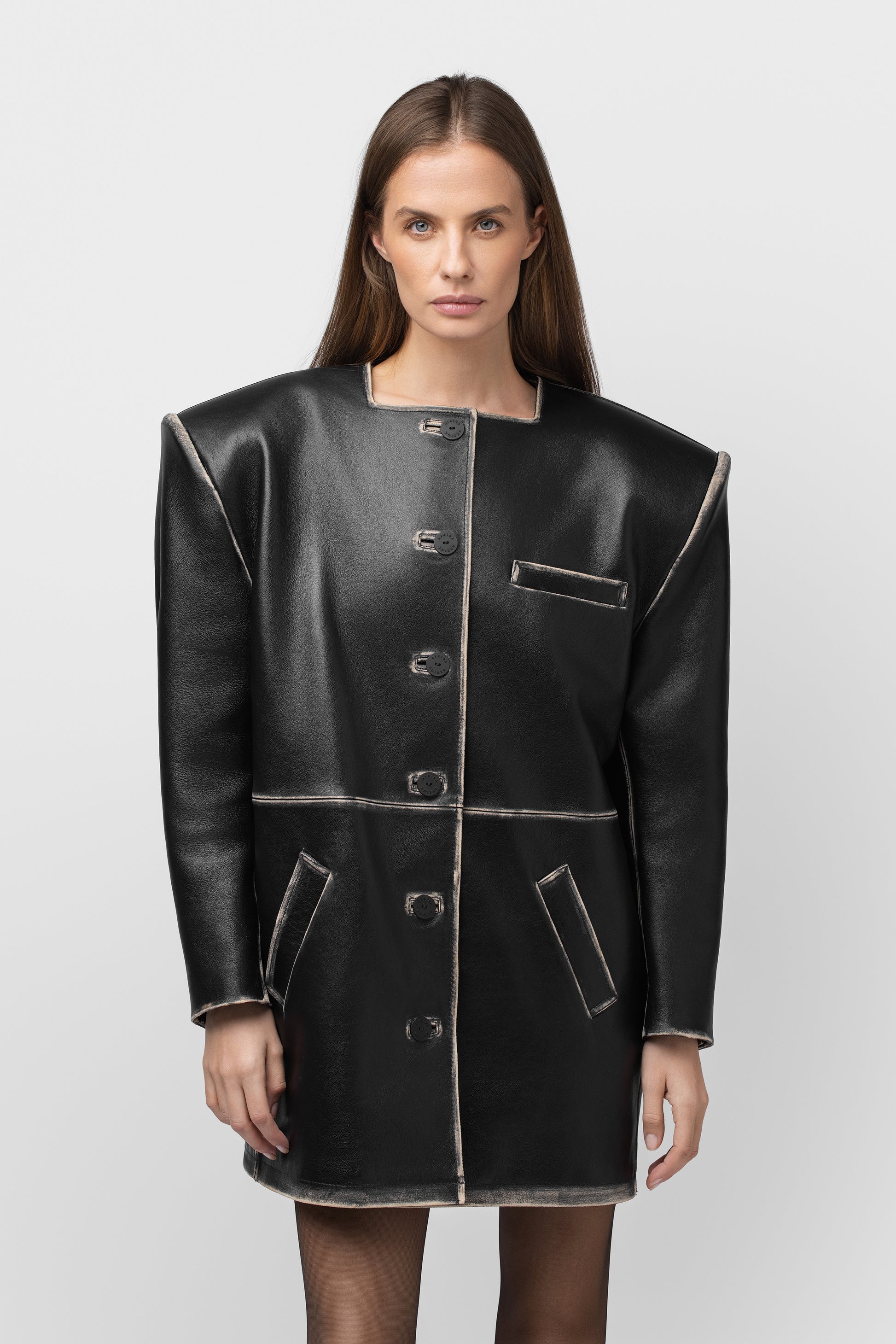 Oversized silhouette blazer made from natural soft leather – a contemporary balance of strength and softness. The sculptural shape is formed through constructional techniques, while the leather adds a subtle sheen and natural creasing.