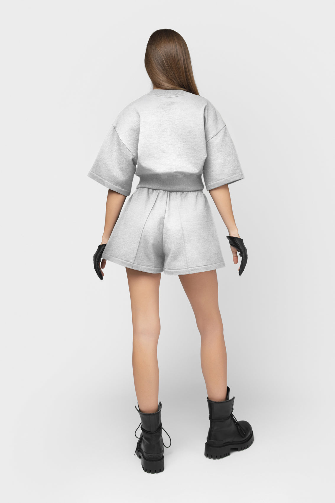 The set includes an oversized sweatshirt with shortened sleeves and an elastic waistband with a drawstring, paired with flared high-waisted shorts featuring a functional adjustable drawstring and elastic in the waist.