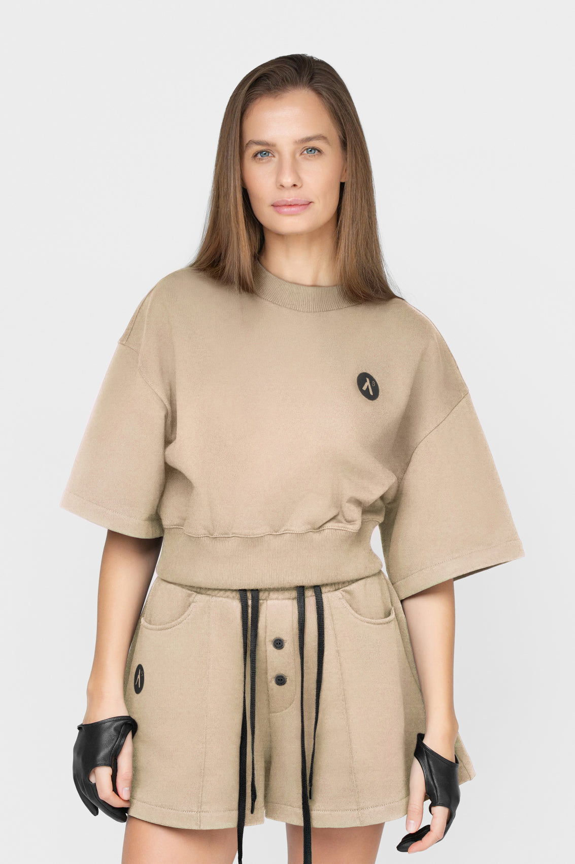 A minimalist, sporty two-piece set made of soft, skin-friendly loopback jersey without fleece. The set includes an oversized sweatshirt with shortened sleeves, an elastic waistband with a drawstring, and high-waisted flared shorts with an adjustable drawstring and elastic at the waist. Both pieces are decorated with black 3D-effect transfers – a subtle yet striking design detail. A perfect choice for city life or travel – pair it with chunky footwear or sporty sneakers.