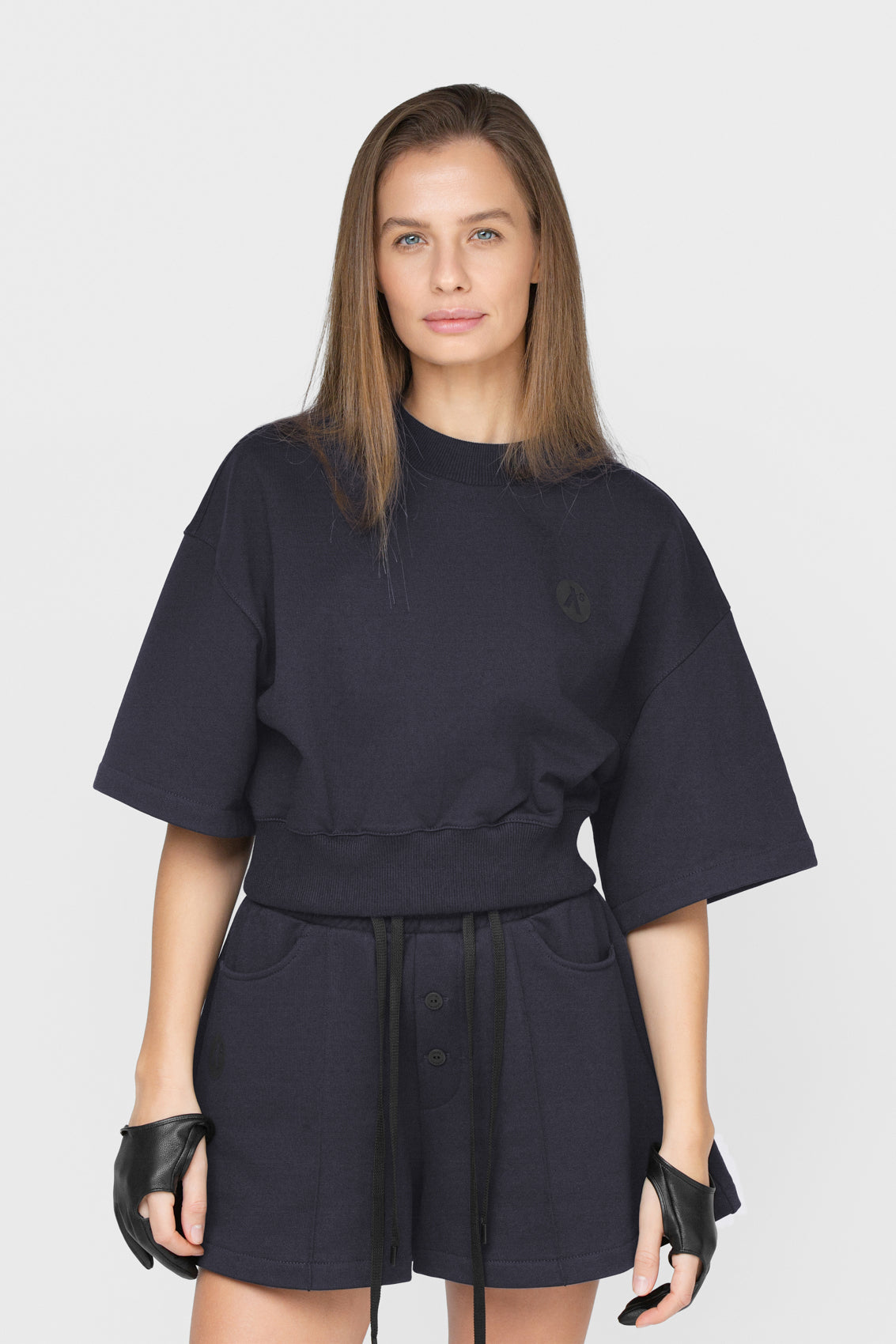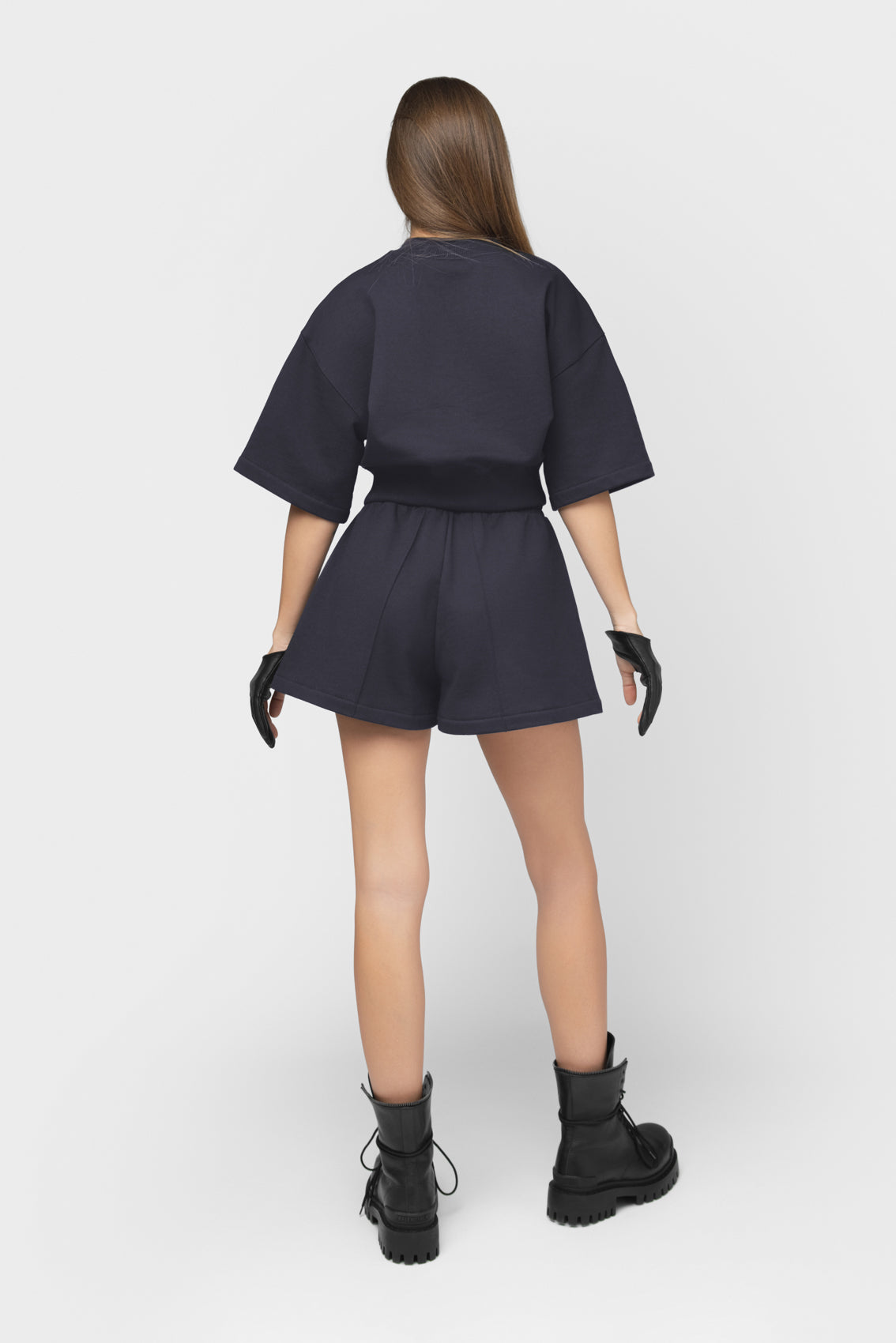 The set includes an oversized sweatshirt with shortened sleeves and an elastic waistband with a drawstring, paired with flared high-waisted shorts featuring a functional adjustable drawstring and elastic in the waist.