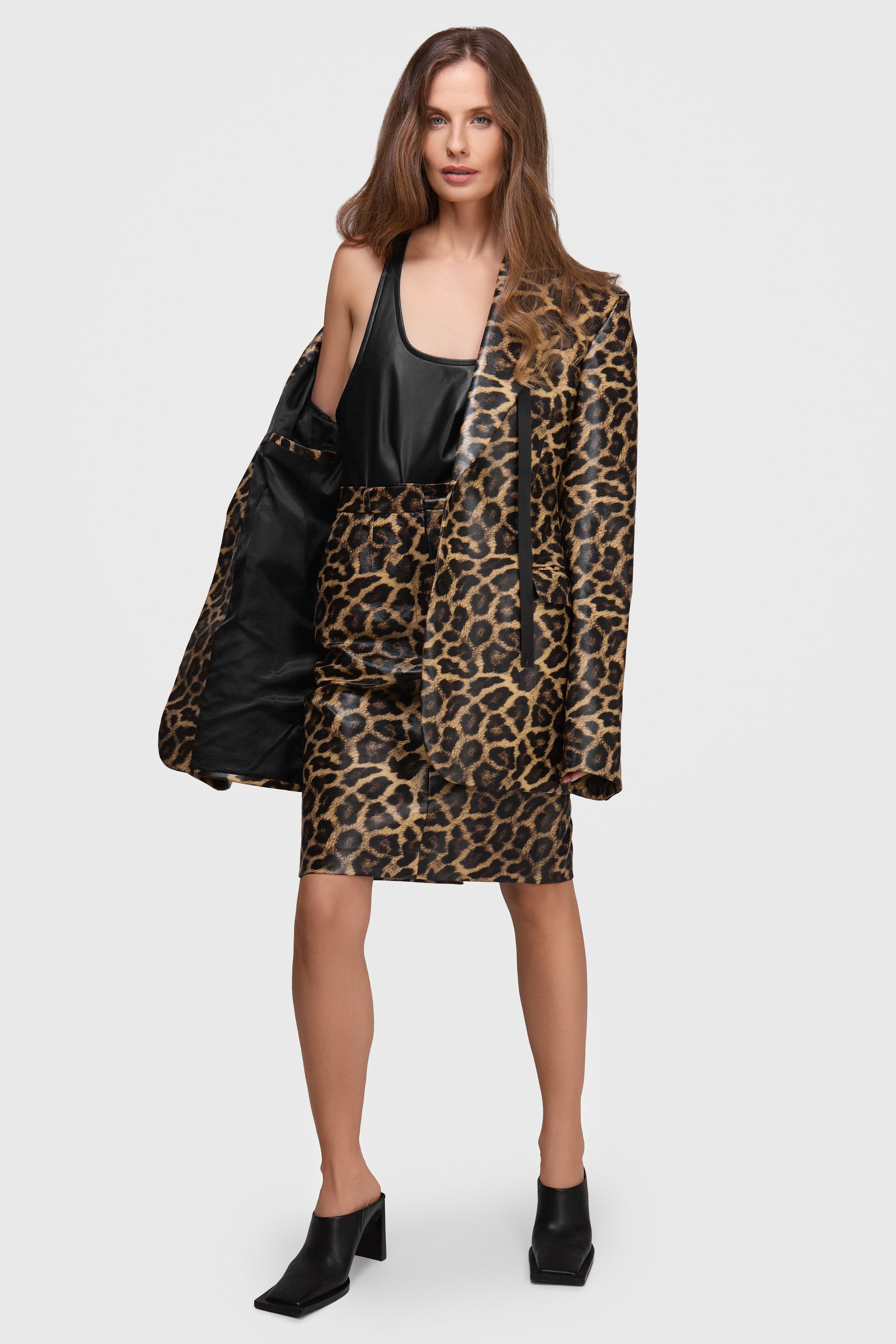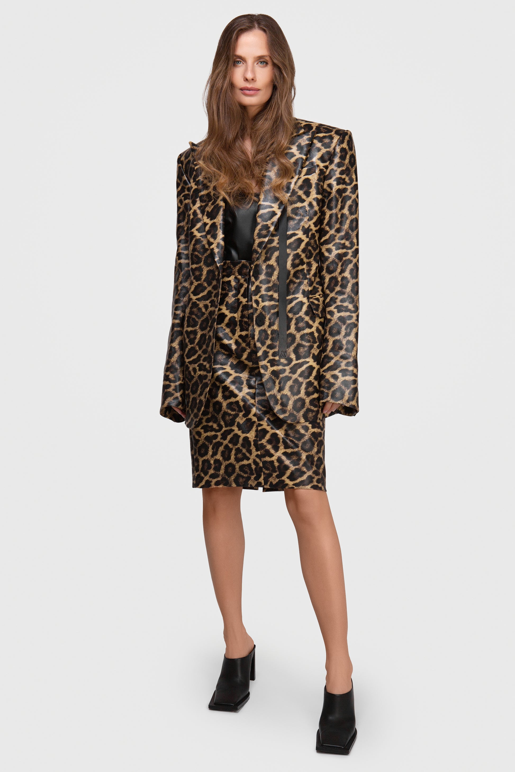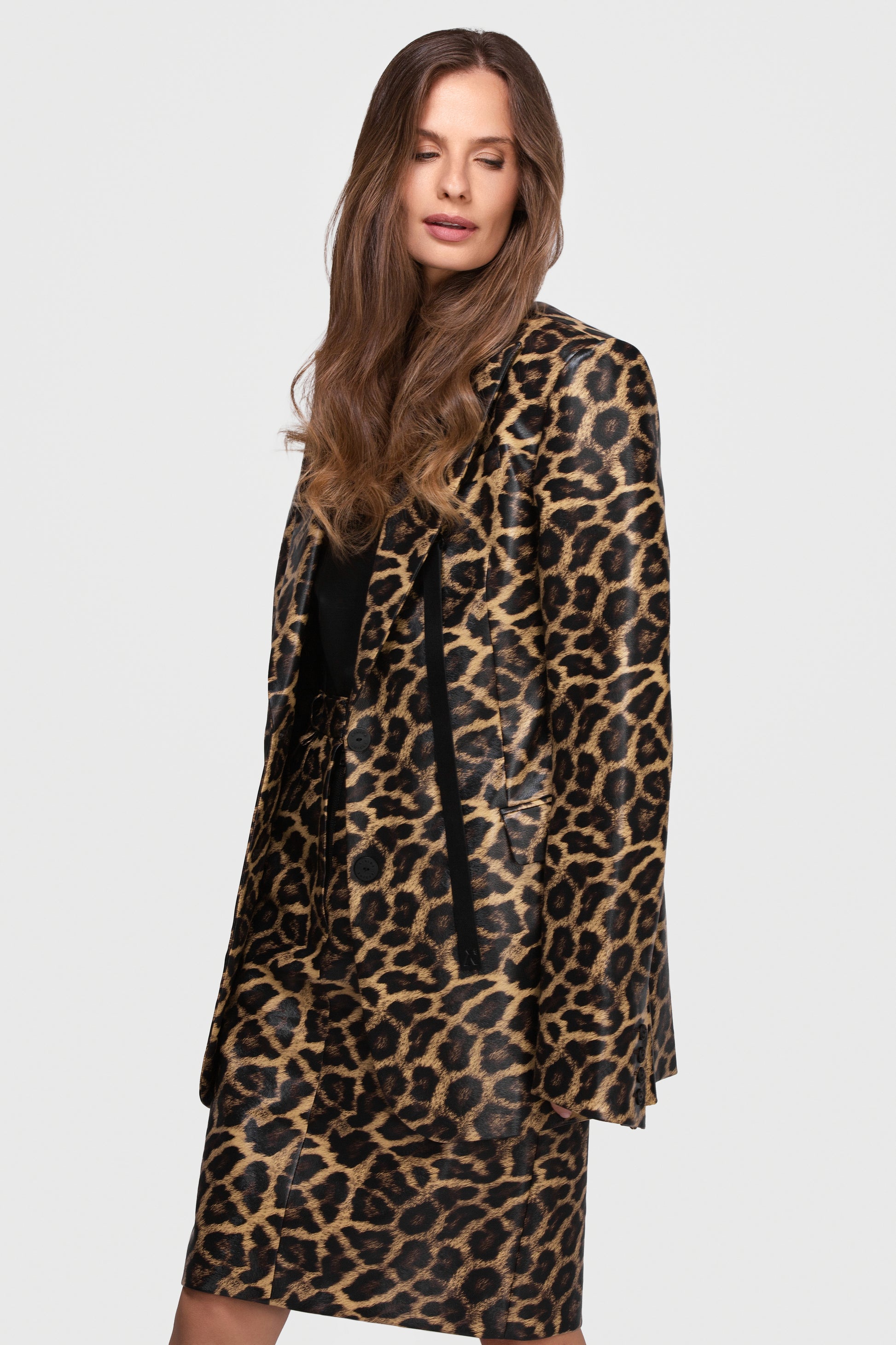 Oversized, minimally fitted cut, single-breasted fastening with two blackened metal name buttons. Stand-up, wide collar lapels. Two front pockets with flaps in the hip area. Leather emblem with logo engraved on the bottom of the right side. Sewn-in pocket/strip on the left side, in the chest area. The jacket has inside pockets. The sleeves are set, with stand-up shoulder straps, imitation slits with four buttons sewn into the cuffs. 2 slits on the back.