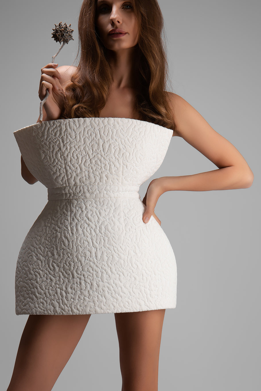 A distinctive, conceptual look where the boldness of sculptural forms meets delicate romance. The main highlight is the mini-length dress, reminiscent in shape of the KONE skirt. Bonded for structure, it maintains an architectural silhouette and is crafted from natural silk with a subtle embossed leopard pattern. At the back – a concealed zipper.