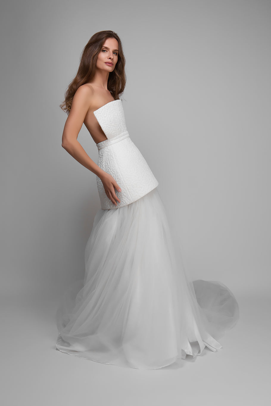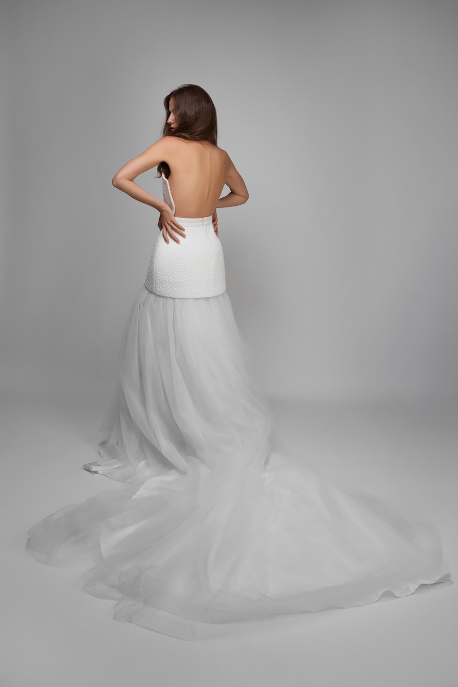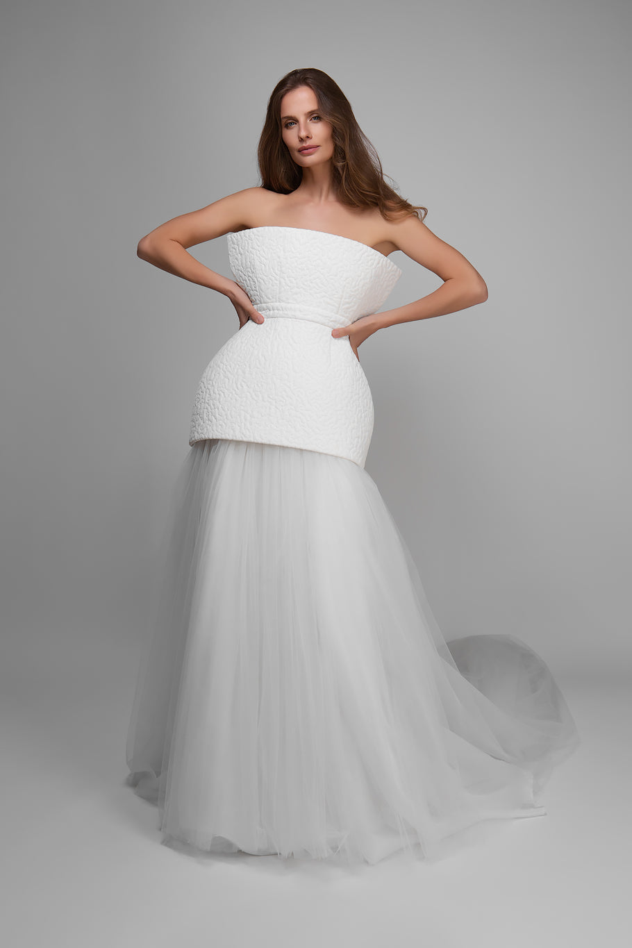 The long tulle skirt is worn over the dress, extending the silhouette and adding a romantic, festive effect. This look is perfectly suited both for a modern bride and for anyone seeking a unique eveningwear solution.