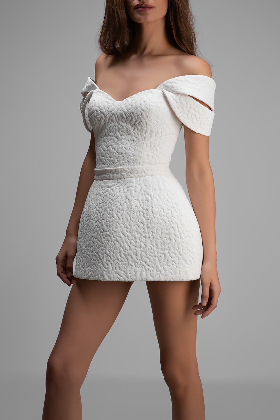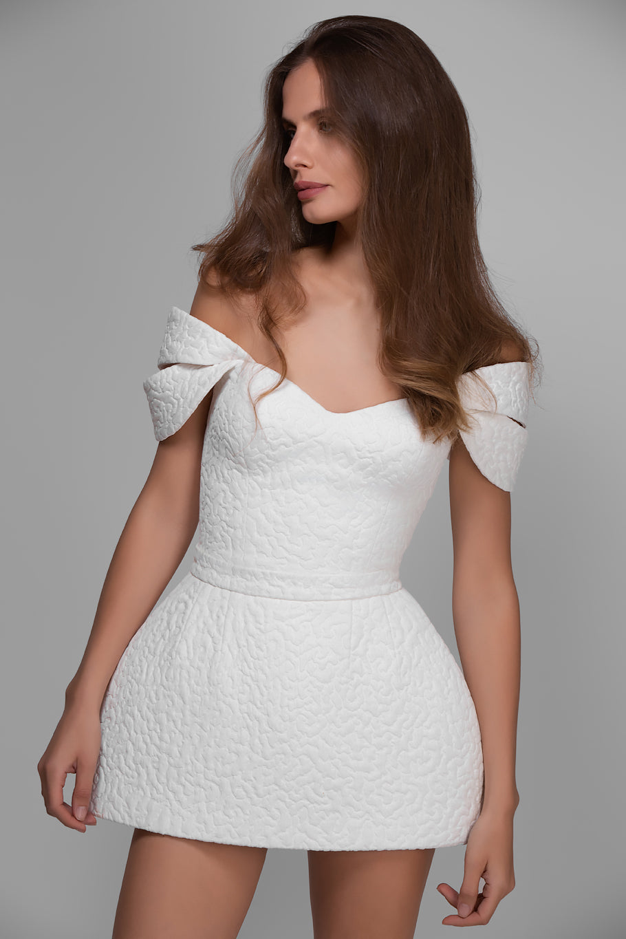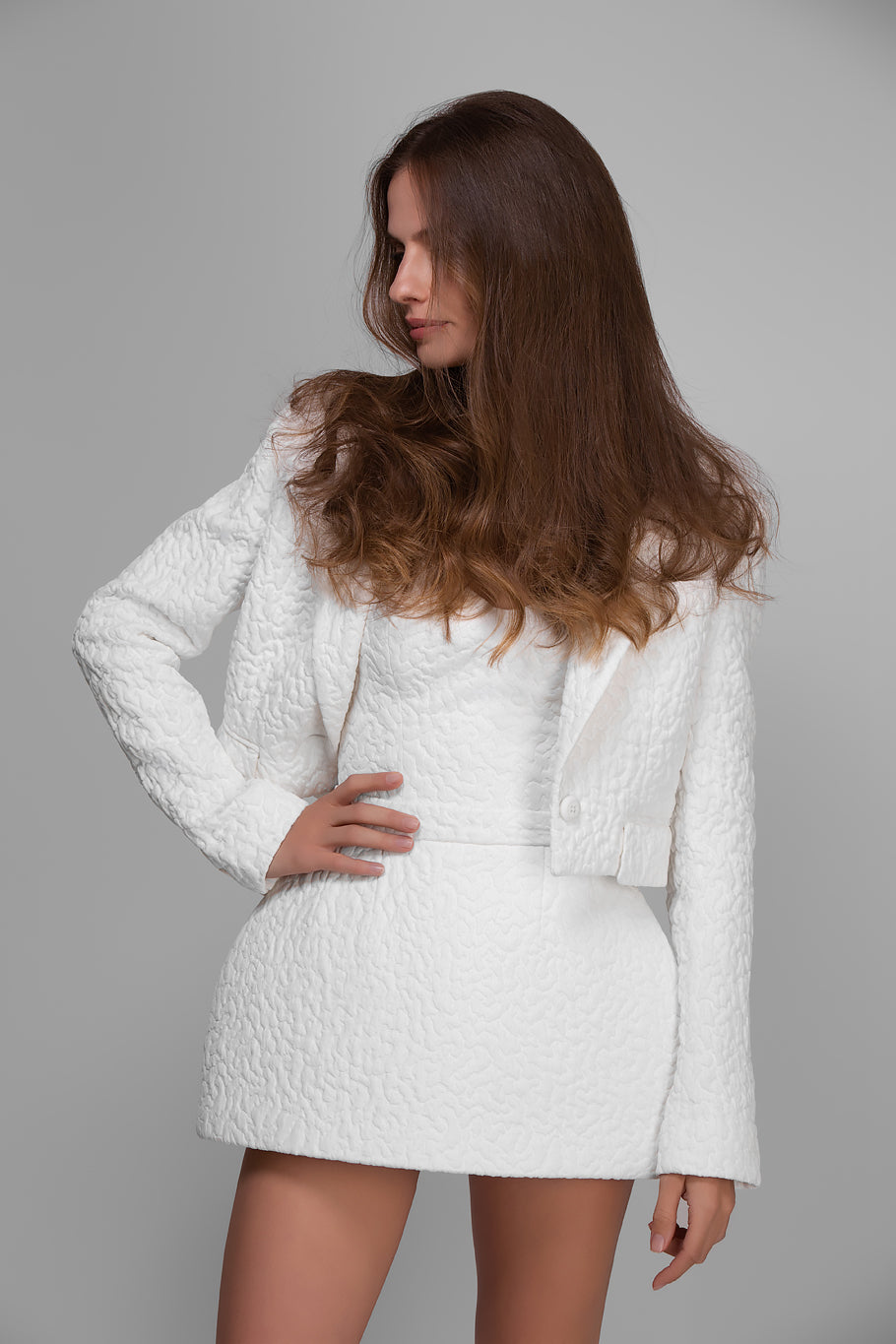 A short jacket (LOOK 11) made of the same fabric can be purchased separately – it subtly completes the look, adding structure and additional coverage.