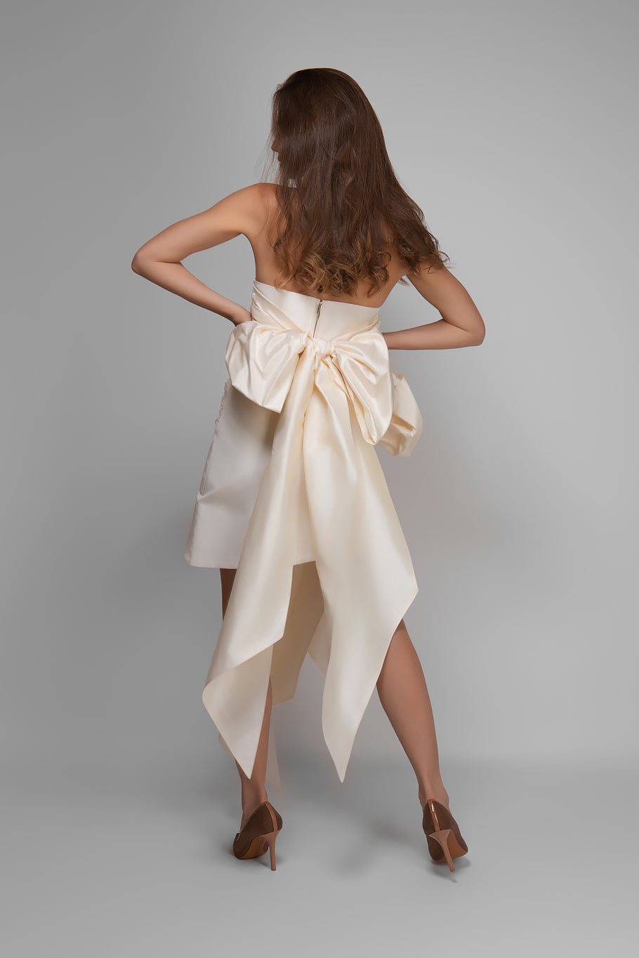 Crafted from 100% natural bonded silk in champagne color, this 3-piece ensemble – corset, mini skirt, and ribbons – allows for dozens of different stylizations.
