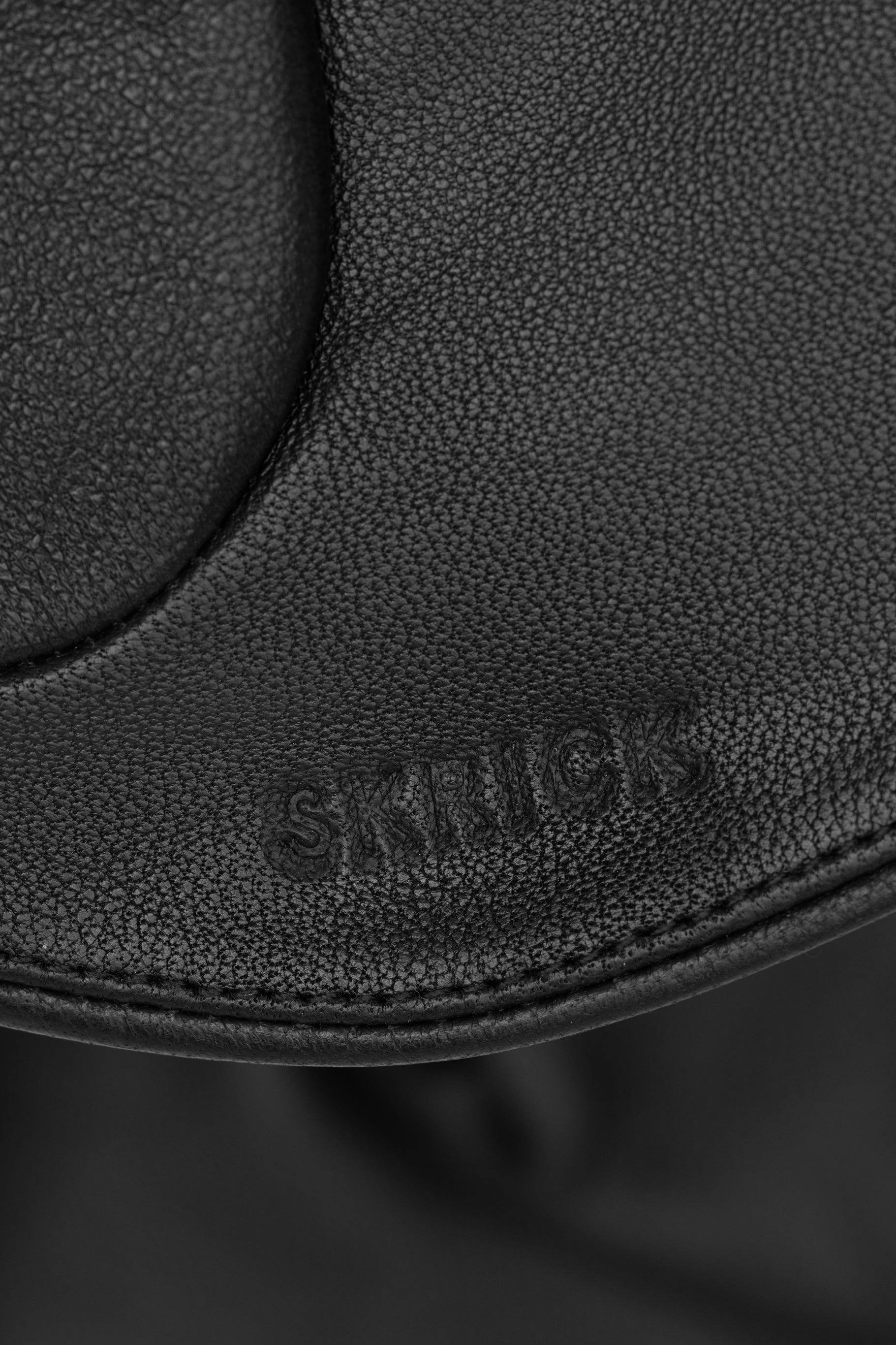 Gloves featuring a distinctive flared cuff and a unique four-finger construction. On one glove’s wrist side, a subtle SKRICK embossing adds a minimalist yet powerful style detail.