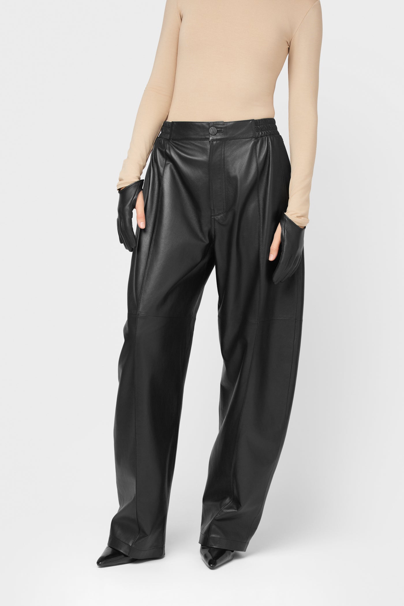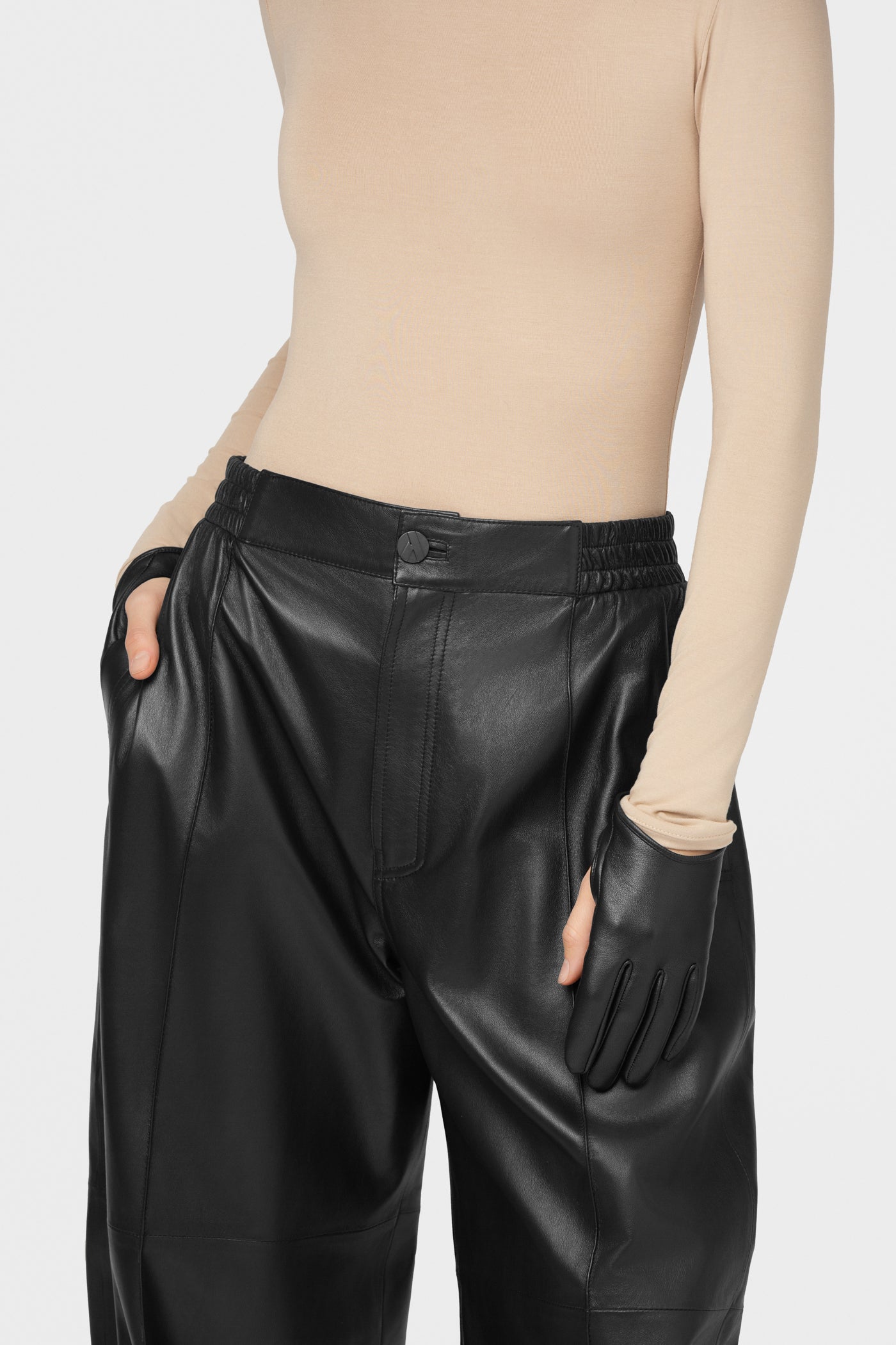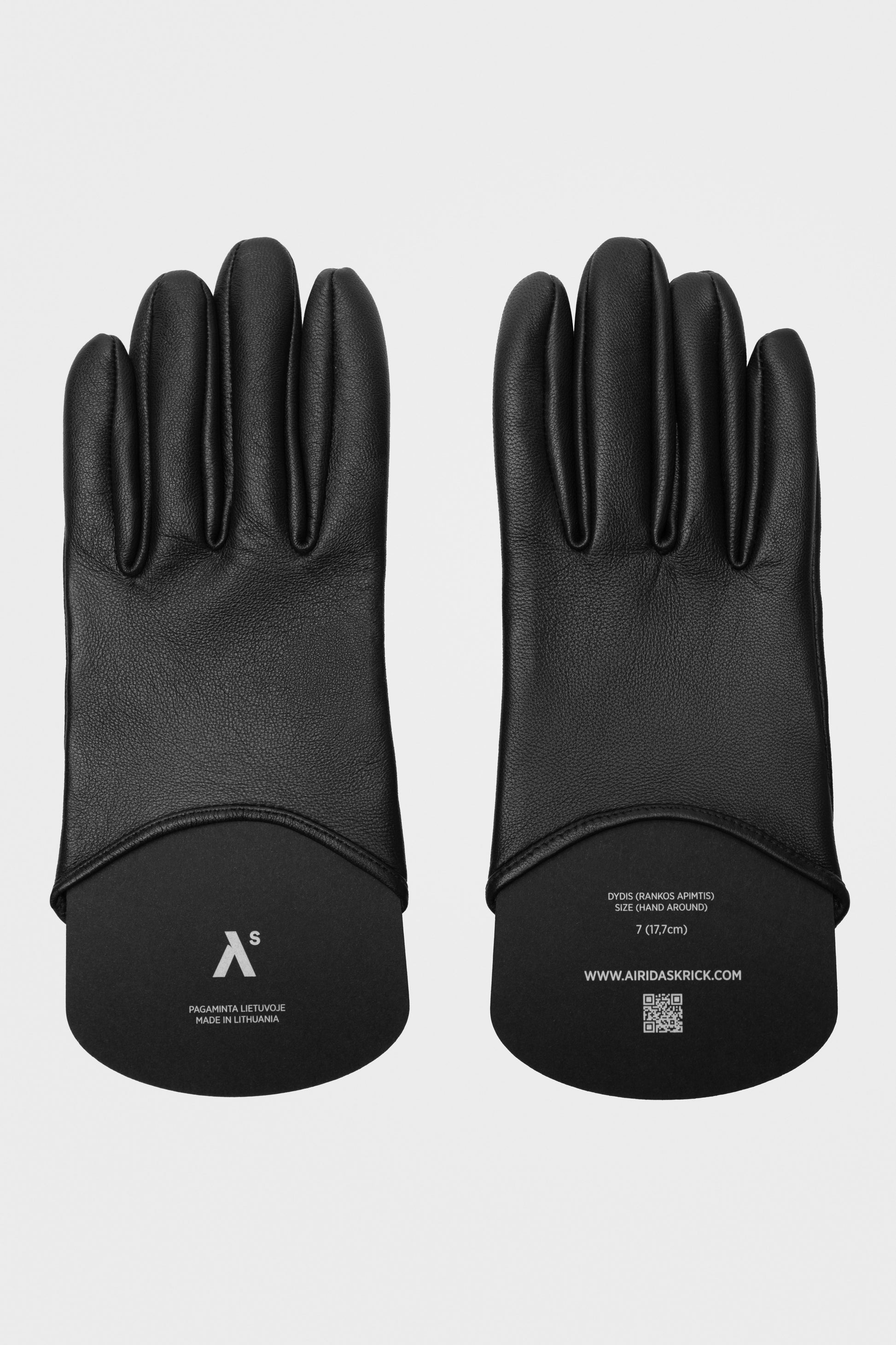 Gloves featuring a distinctive flared cuff and a unique four-finger construction. On one glove’s wrist side, a subtle SKRICK embossing adds a minimalist yet powerful style detail.