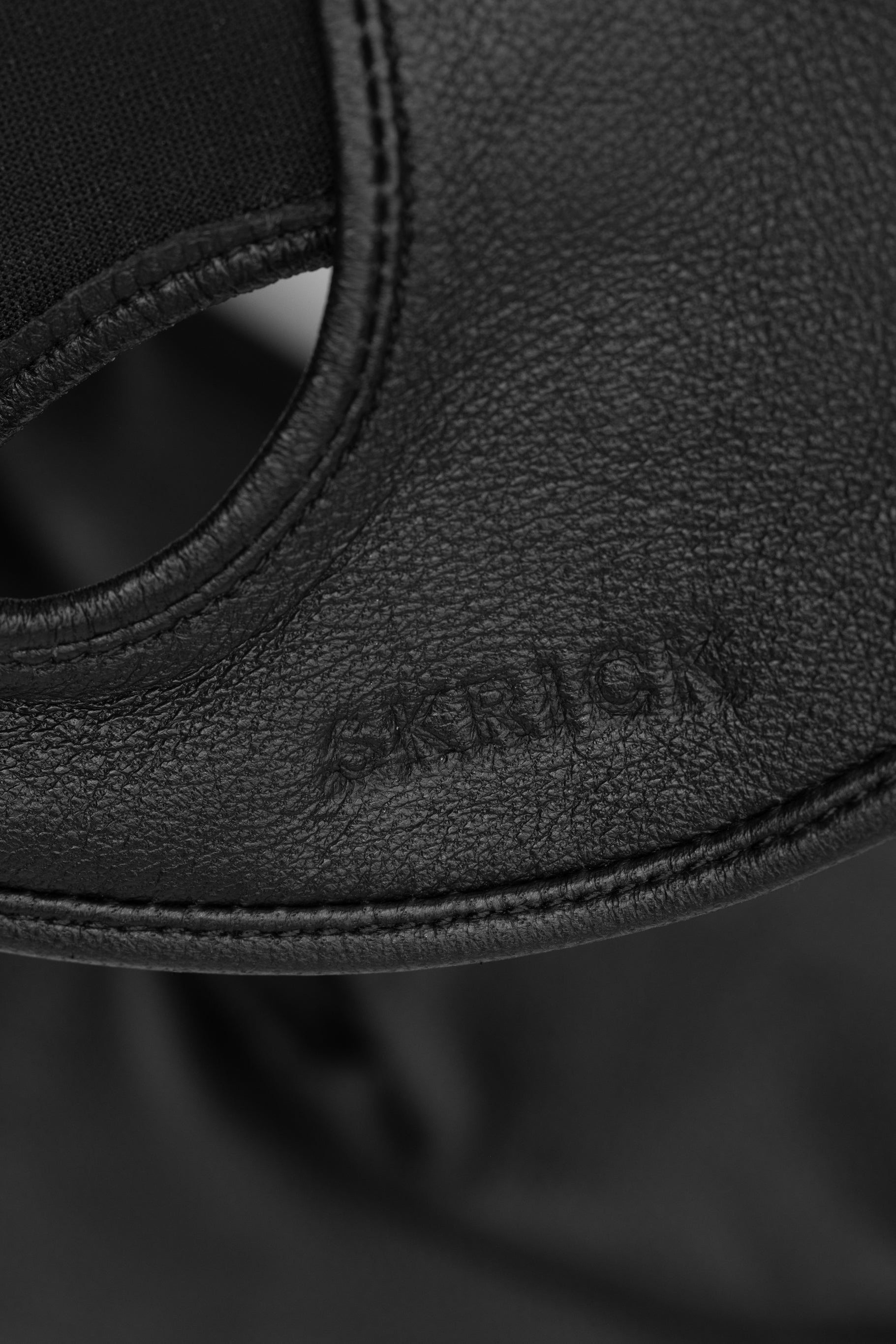 Gloves featuring a distinctive flared cuff and a unique four-finger construction. On one glove’s wrist side, a subtle SKRICK embossing adds a minimalist yet powerful style detail.