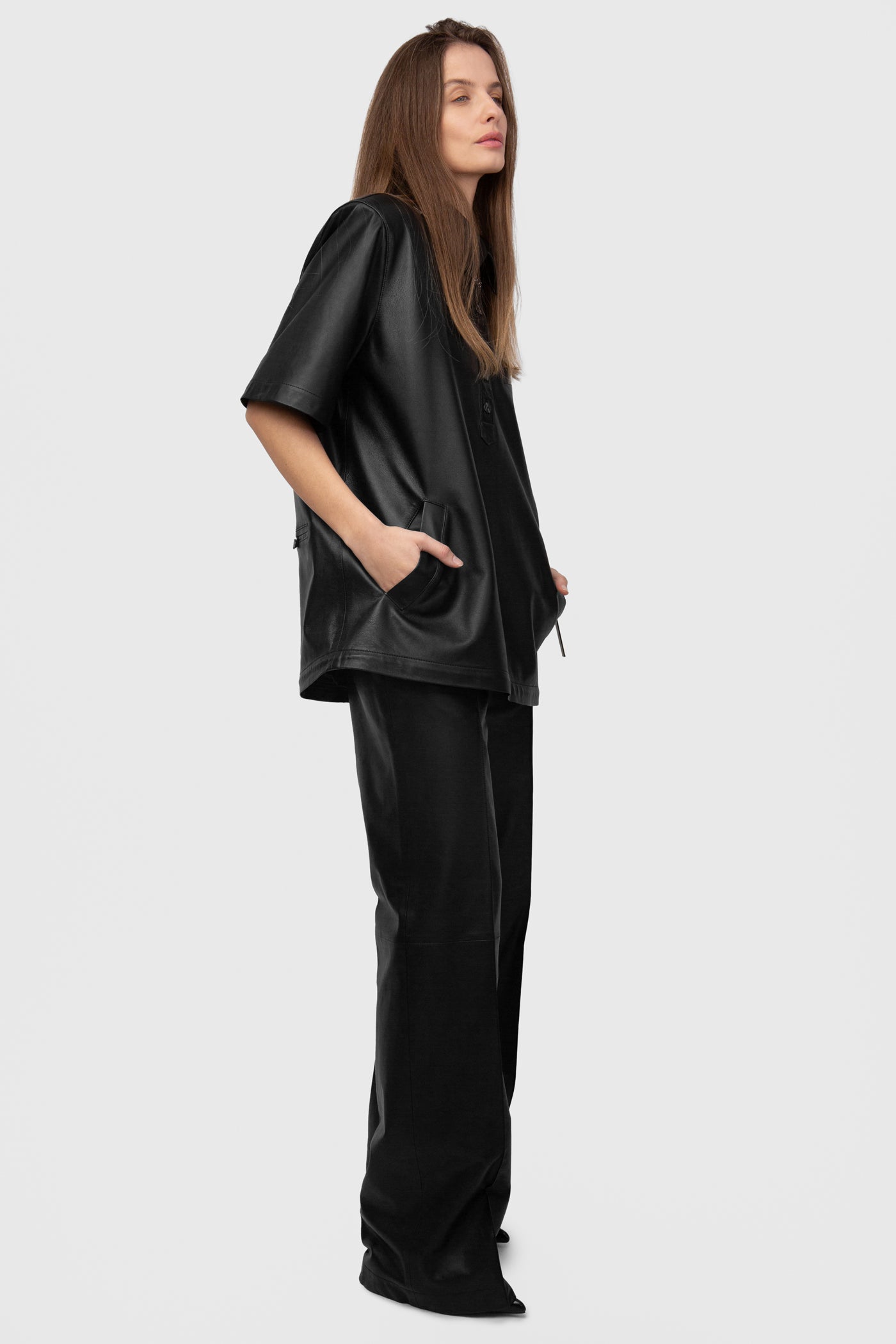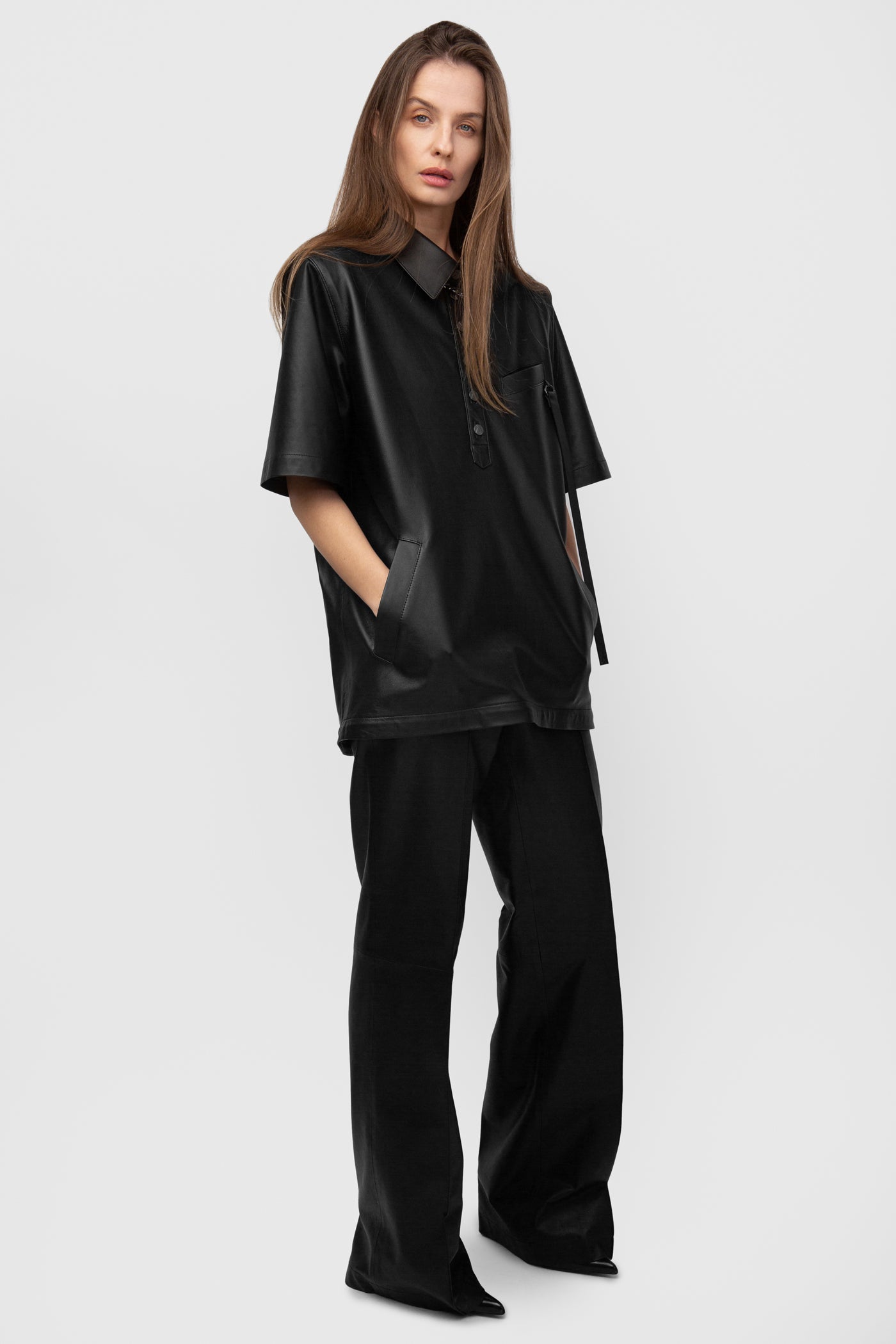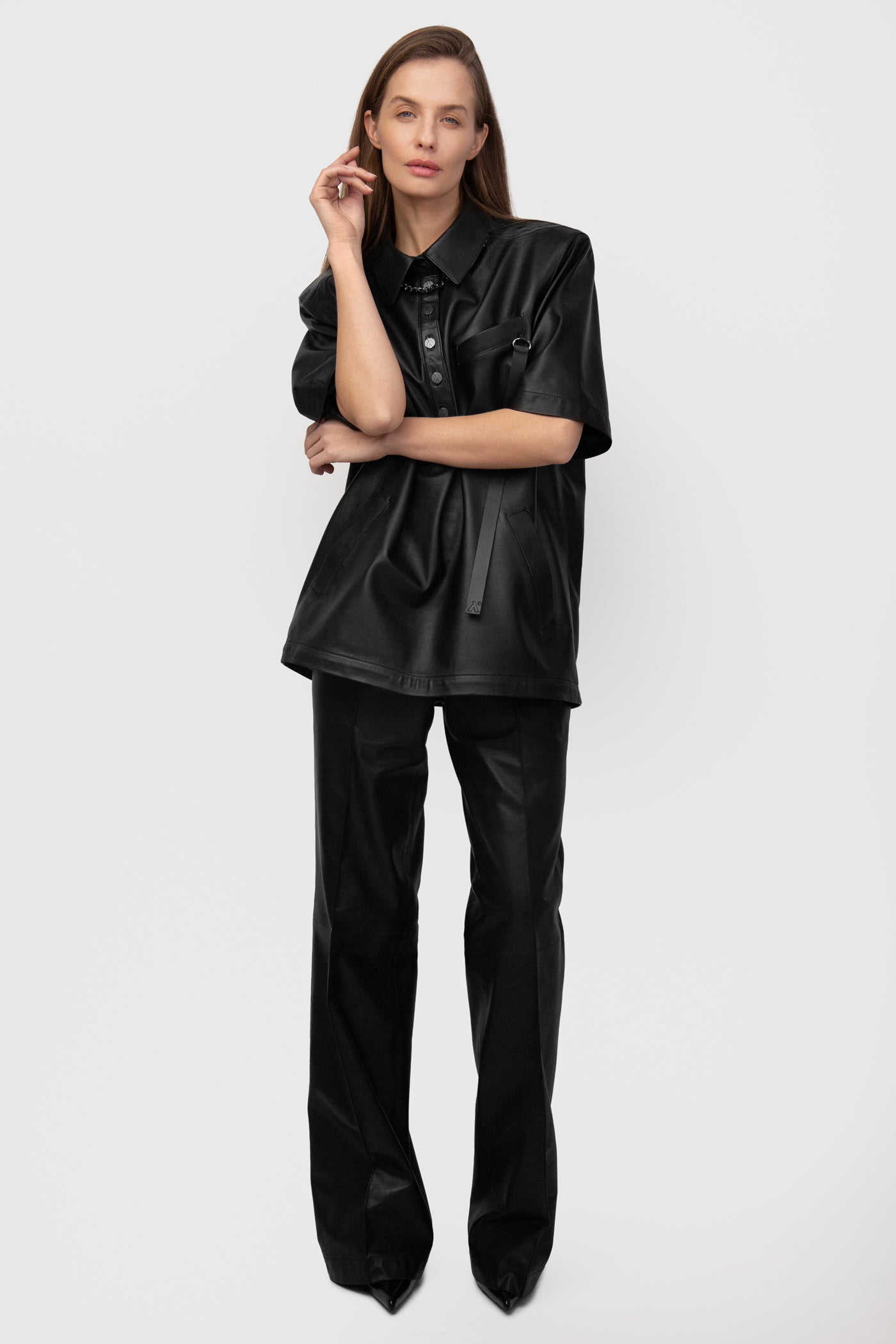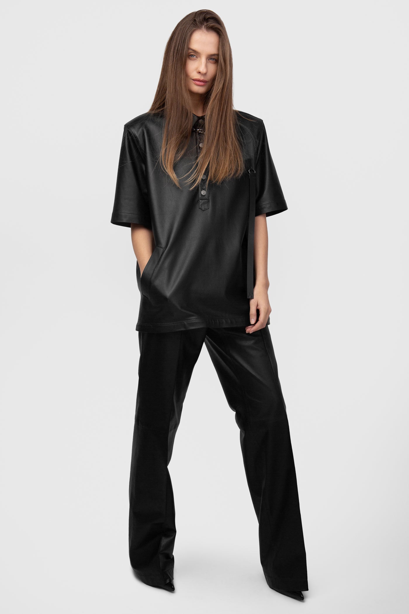 Black, genuine leather, straight-cut trousers with a low waist. Lined, with a button and zipper closure in the middle of the front. The waist has belt loops and loops for attaching accessories. Two side pockets, two back pockets with a frame with a darkened nickel name button.