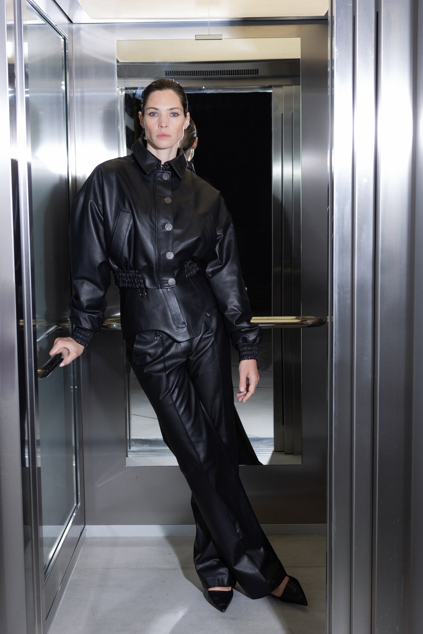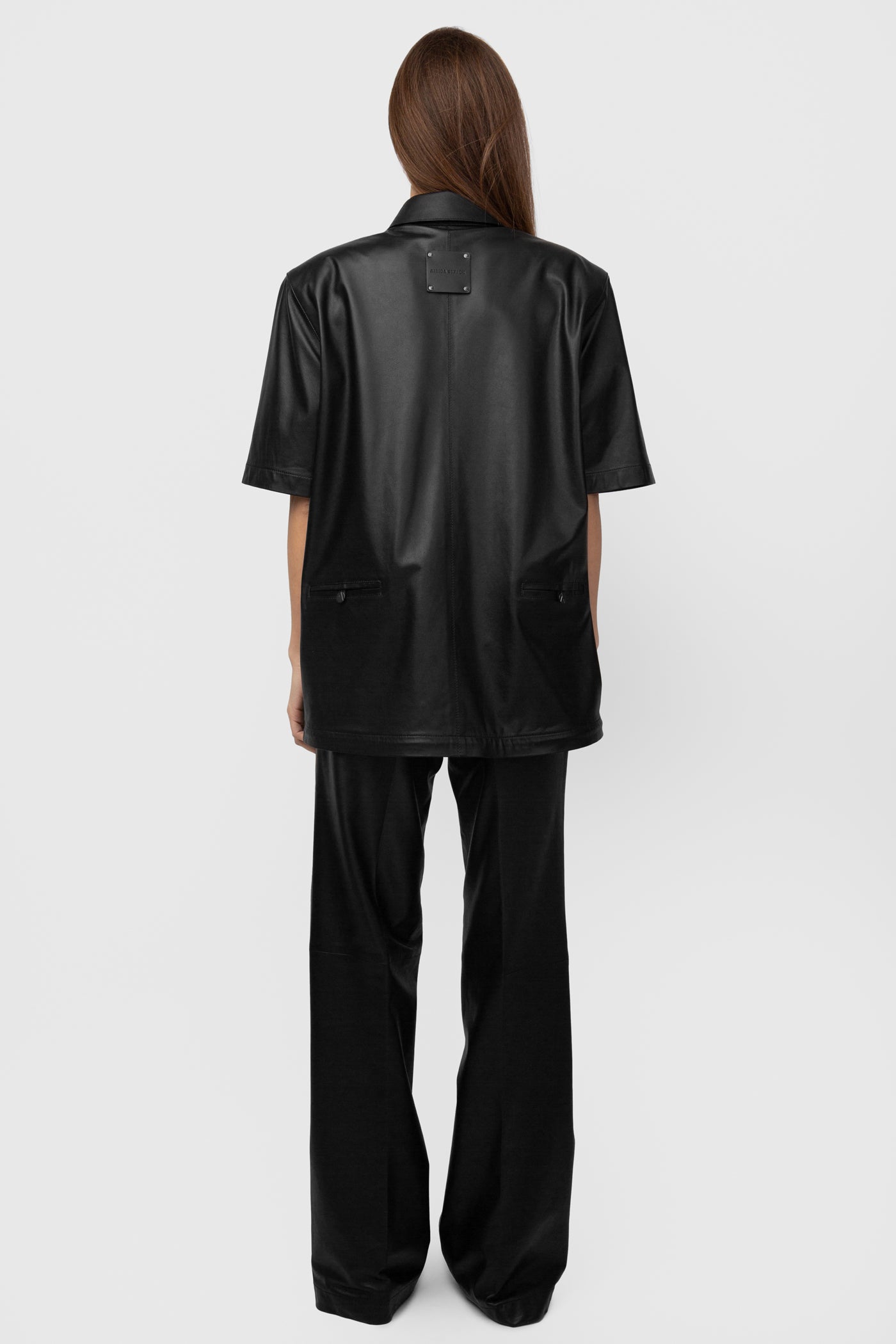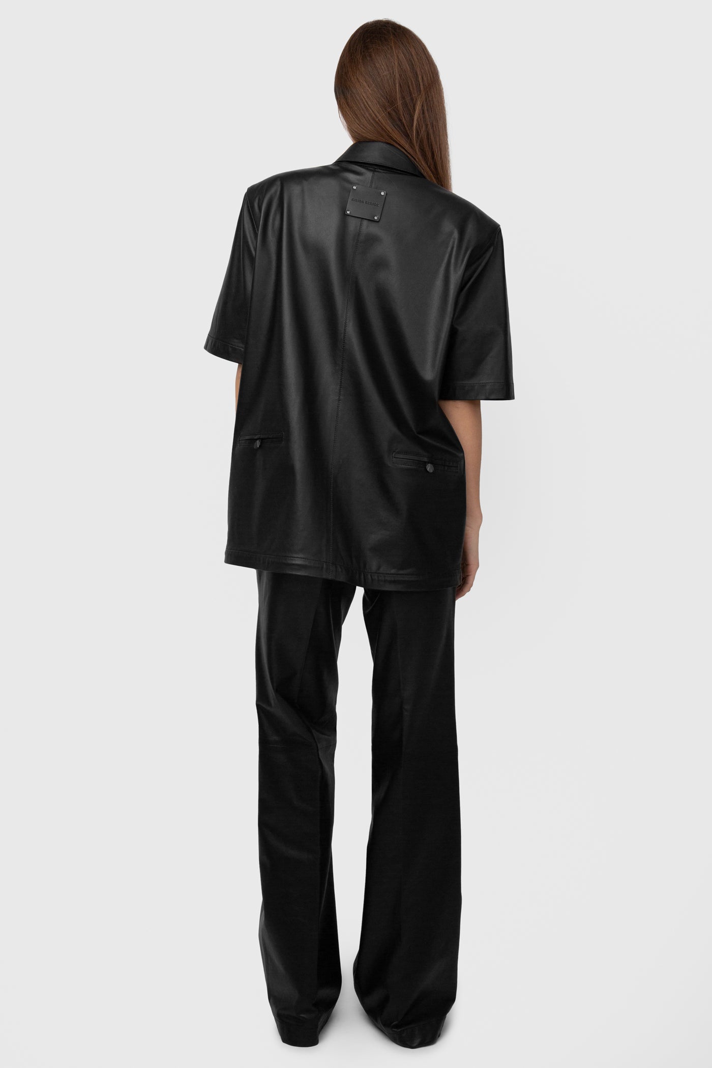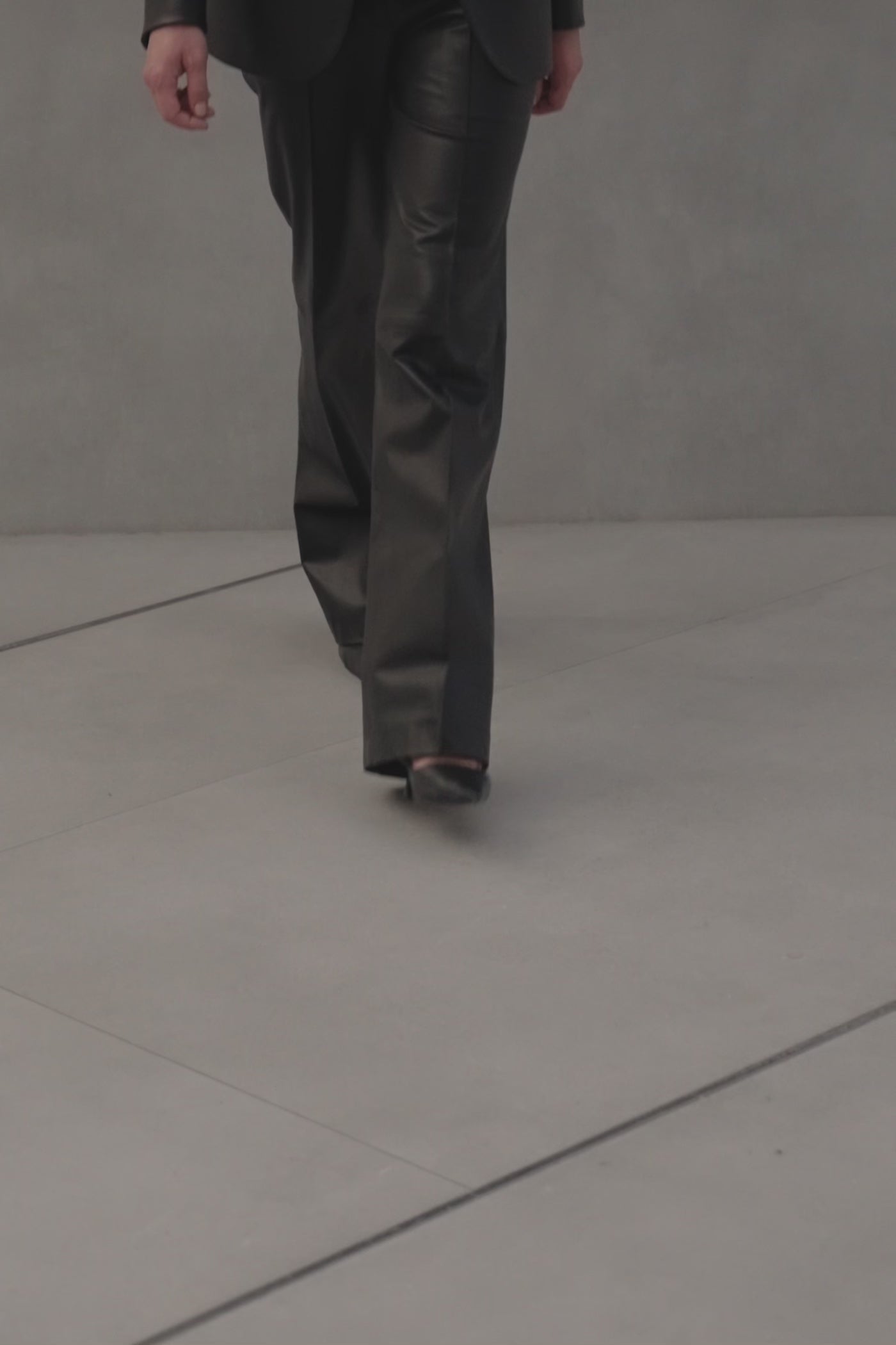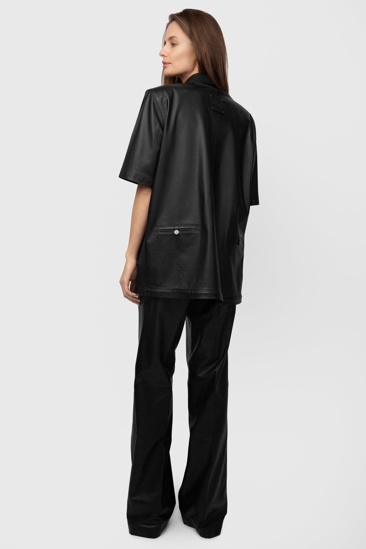 Black, genuine leather, straight-cut trousers with a low waist. Lined, with a button and zipper closure in the middle of the front. The waist has belt loops and loops for attaching accessories. Two side pockets, two back pockets with a frame with a darkened nickel name button.