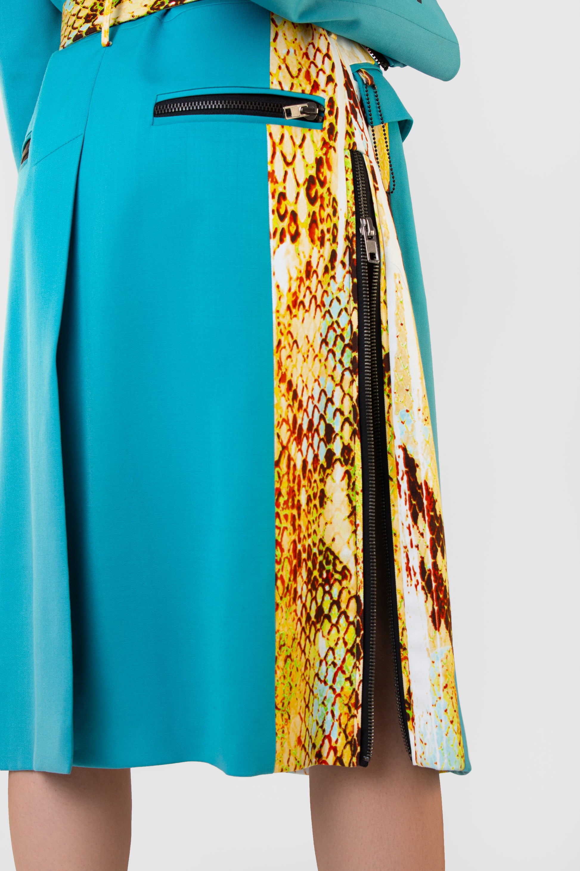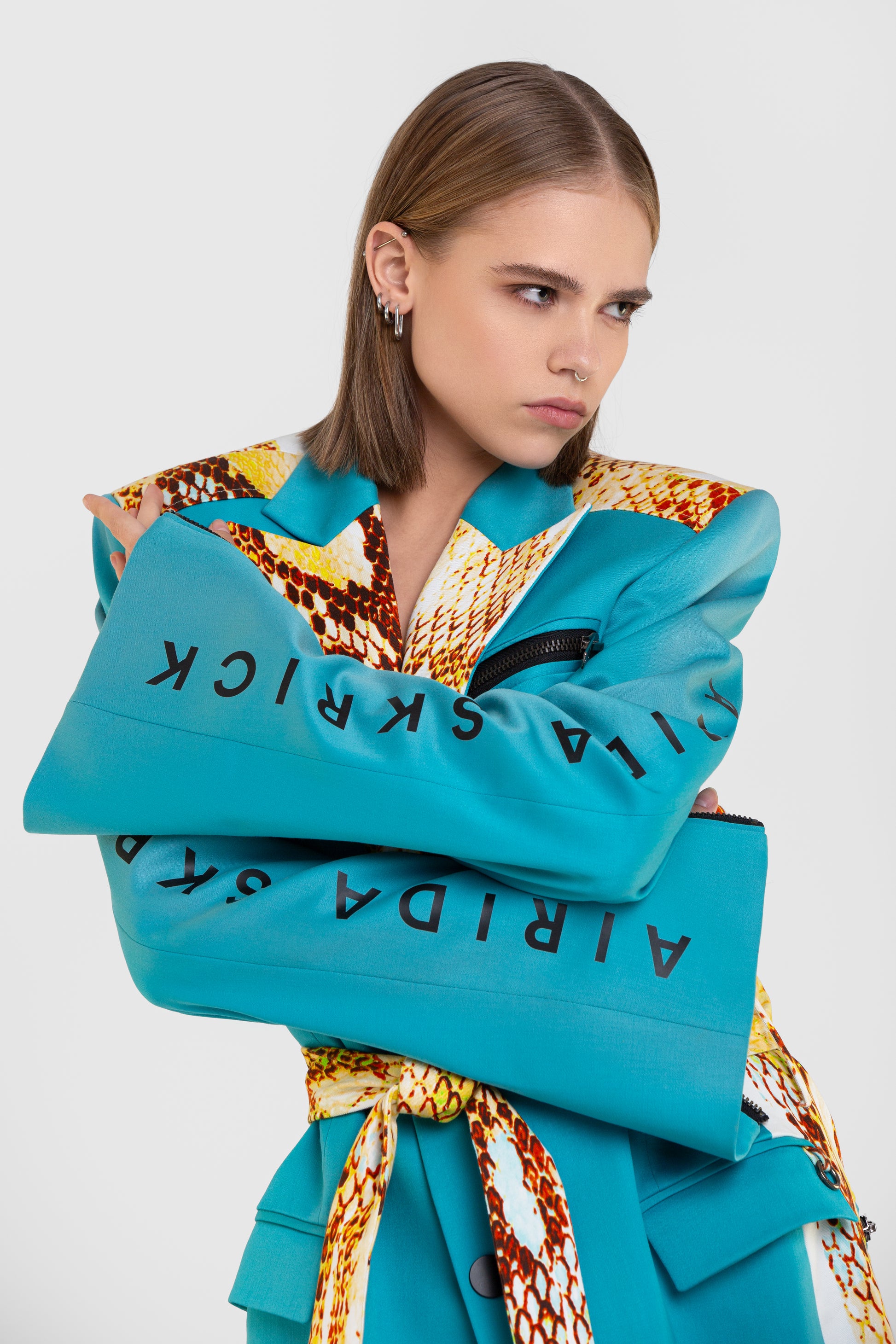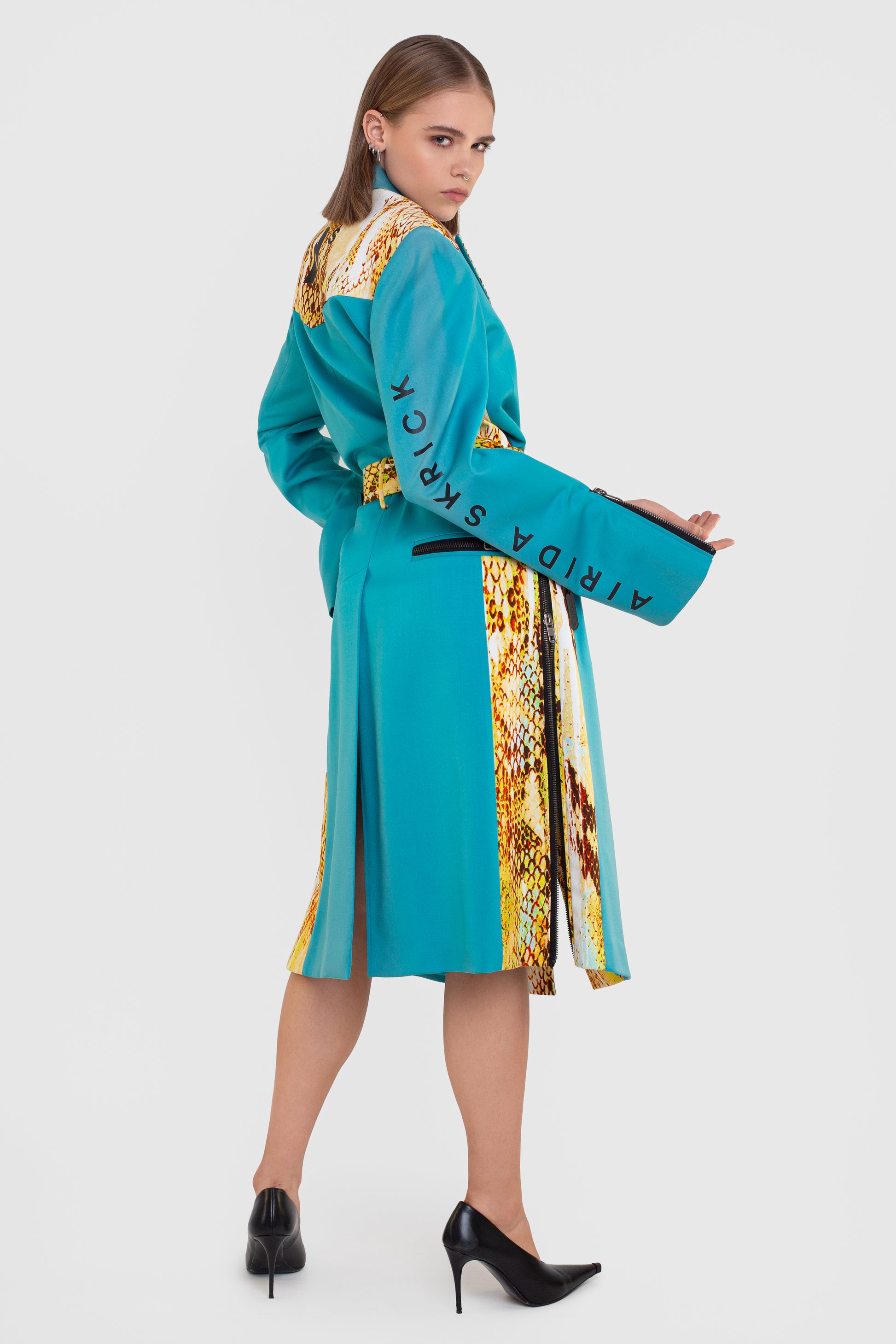 Turquoise long wool jacket made of suit fabric, lined with yellow python patterned cotton. With lining. Minimally fitted cut, single-breasted closure with 2 dark metal buttons with logo. Wide stand-up collar. Stand-up sleeves with buttonholes. 2 front pockets with flaps, one pocket/panel with zipper at the top. Deep slits on the sides and cuffs, opened with metal zippers. Black glued transfer at the back of the sleeves. 1 slit at the back, a neck flap with a black logo transfer.