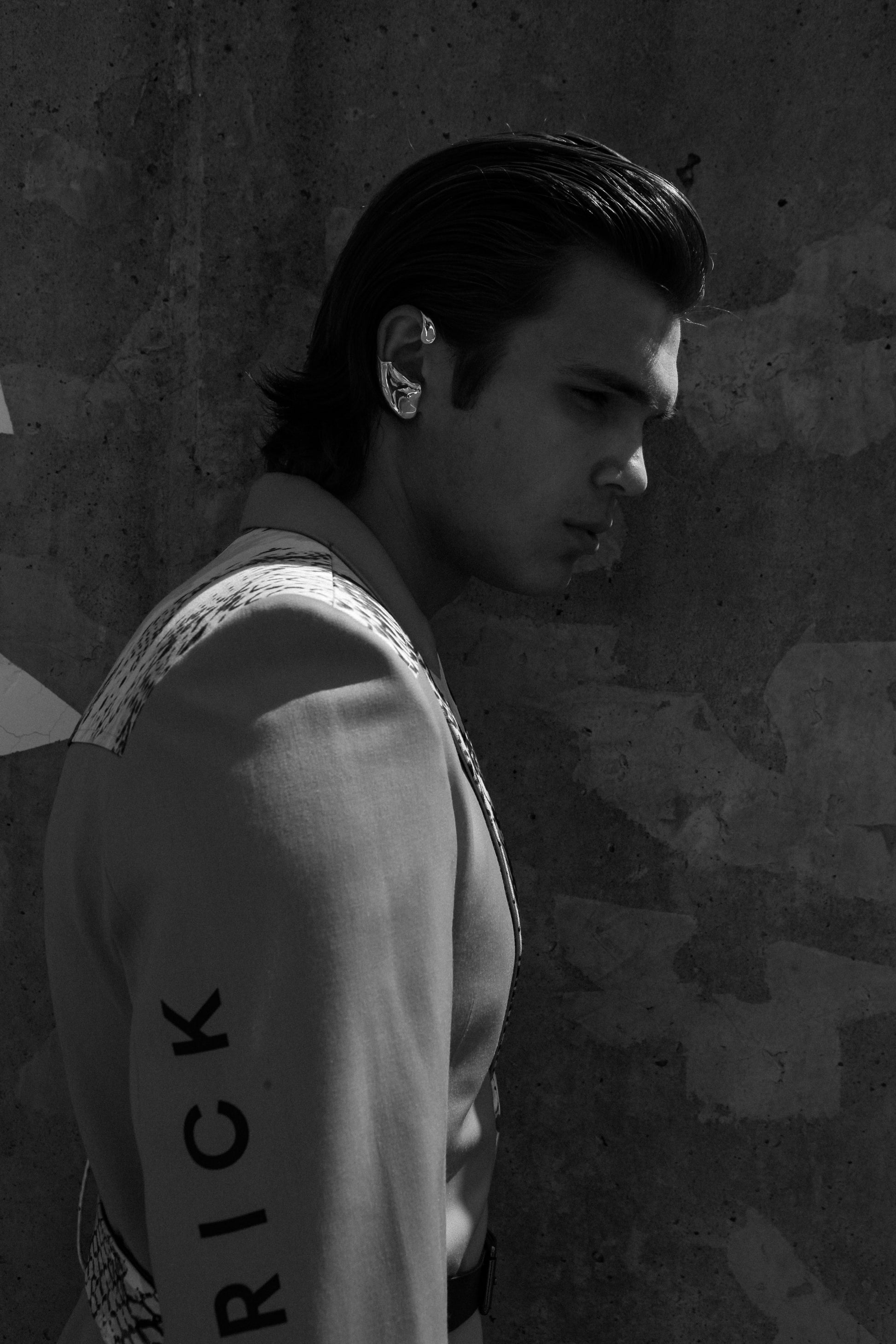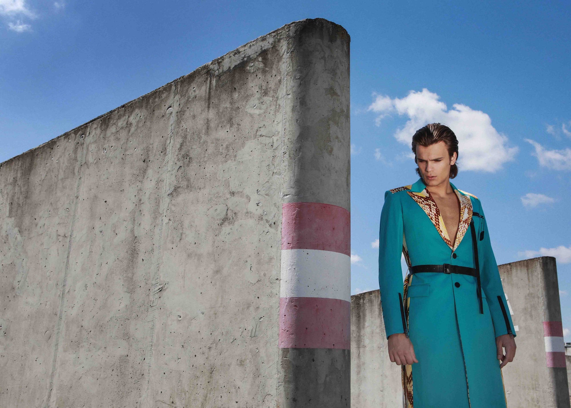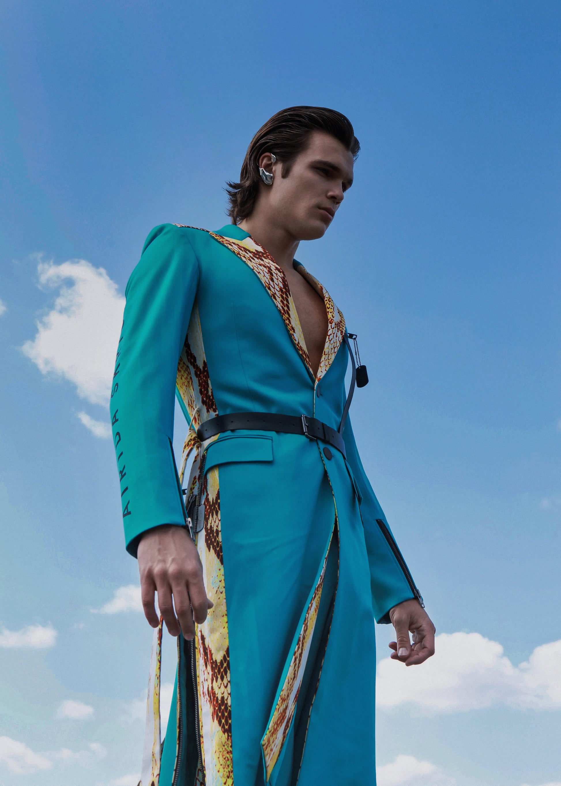 Turquoise long wool jacket made of suit fabric, lined with yellow python patterned cotton. With lining. Minimally fitted cut, single-breasted closure with 2 dark metal buttons with logo. Wide stand-up collar. Stand-up sleeves with buttonholes. 2 front pockets with flaps, one pocket/panel with zipper at the top. Deep slits on the sides and cuffs, opened with metal zippers. Black glued transfer at the back of the sleeves. 1 slit at the back, a neck flap with a black logo transfer.