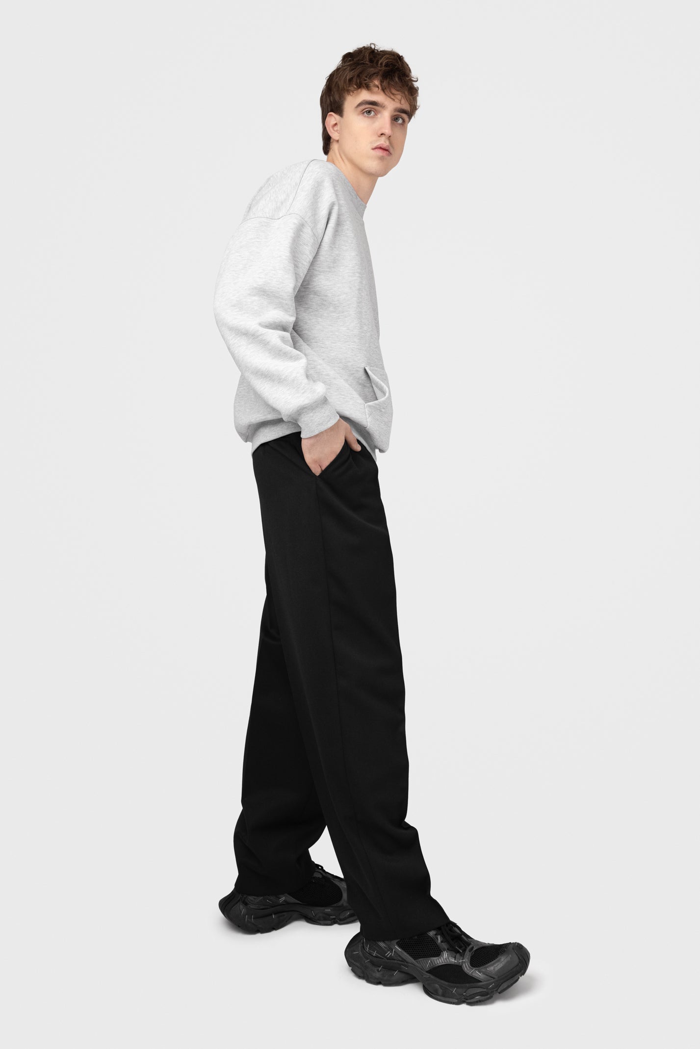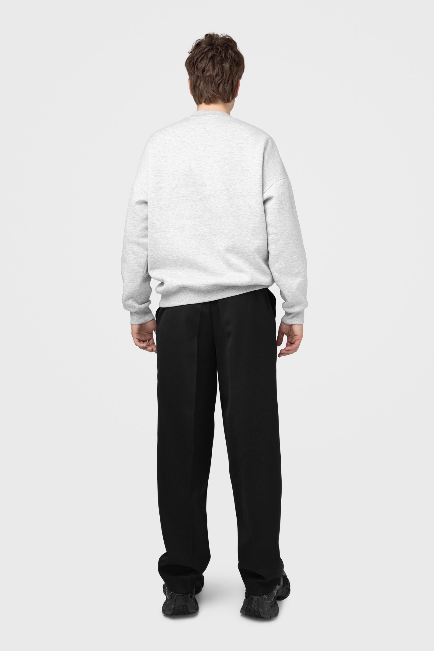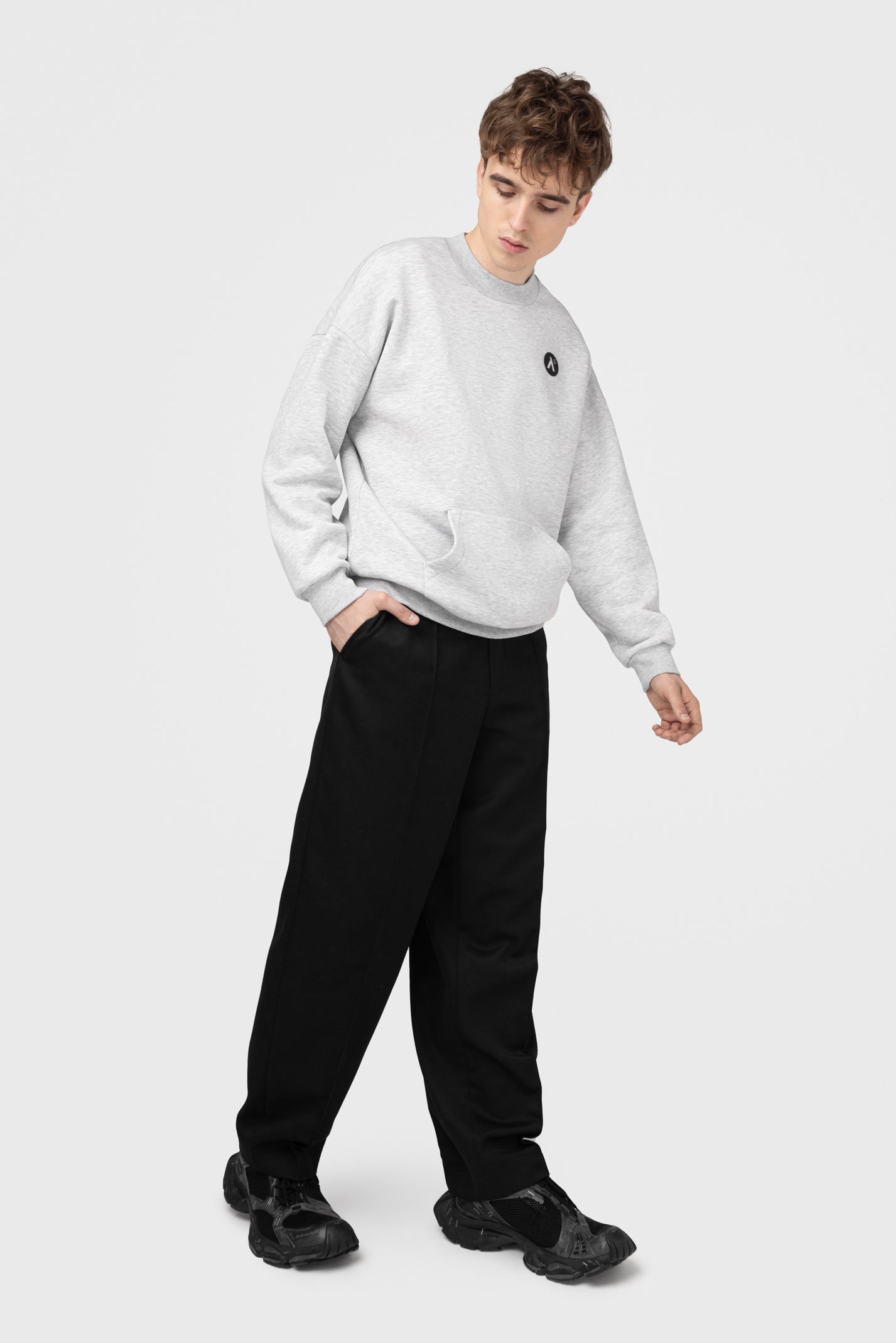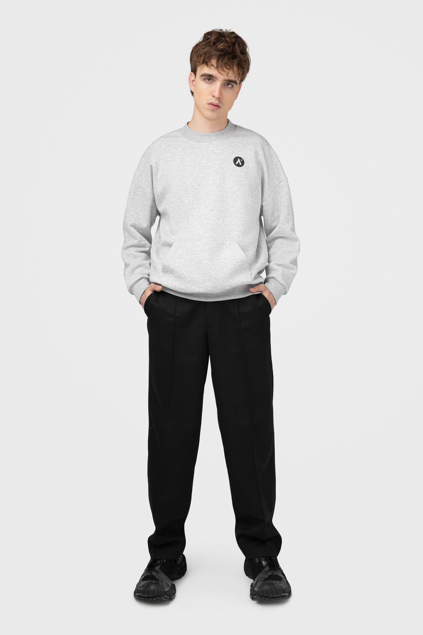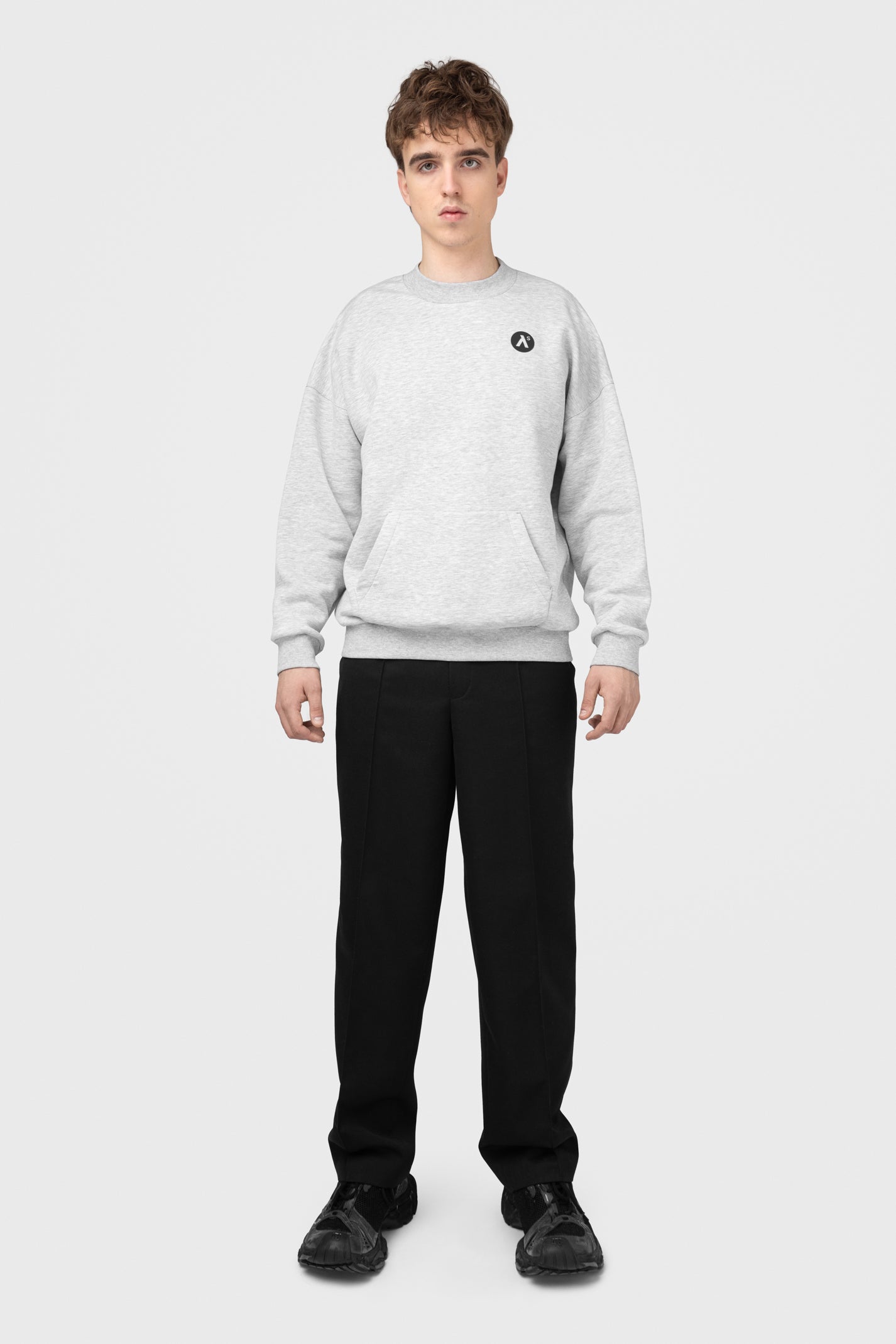 Light gray oversized sweatshirt with long dropped sleeves, knitted cuffs, and waistband. It features a kangaroo pocket sewn in at the front. The garment is made from soft fabric with fleece lining. The front of the sweatshirt, on the left side, is decorated with a black 3D logo. This model allows for free movement and is suitable for both passive and active relaxation.