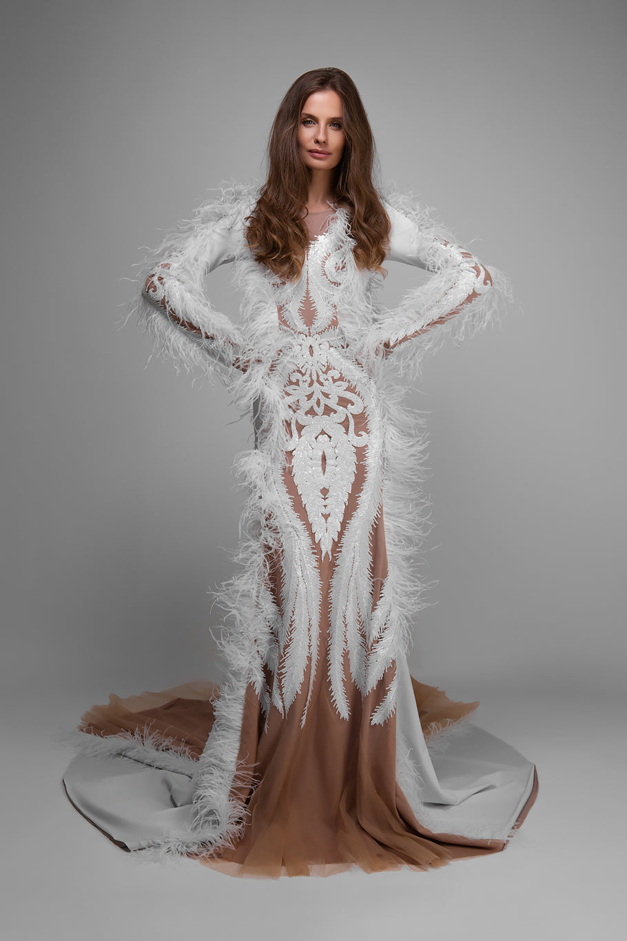 A luxurious, eye-catching gown perfect for a special occasion or a non-traditional wedding celebration. This design combines three fabrics – soft, sheer nude tulle, and stretchy jersey with Lycra – to subtly accentuate the silhouette and create a refined, modern look. Intricate sequin embroidery forms bold, baroque-inspired patterns, while natural ostrich feathers add movement and a touch of theatrical elegance.