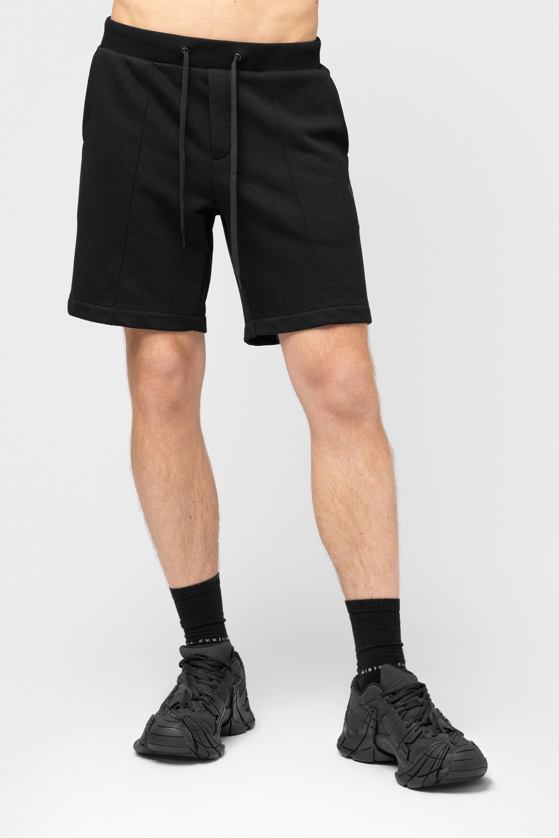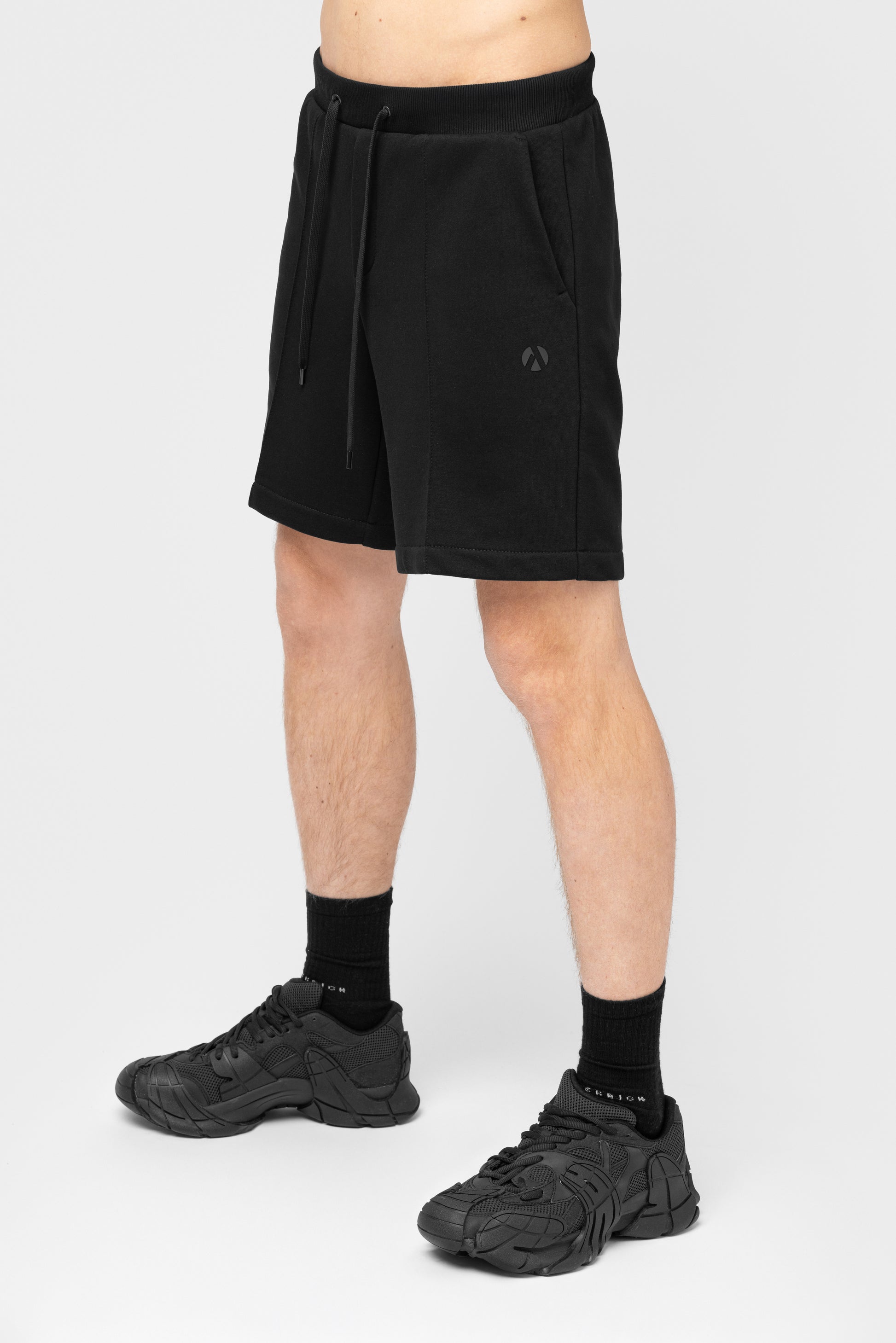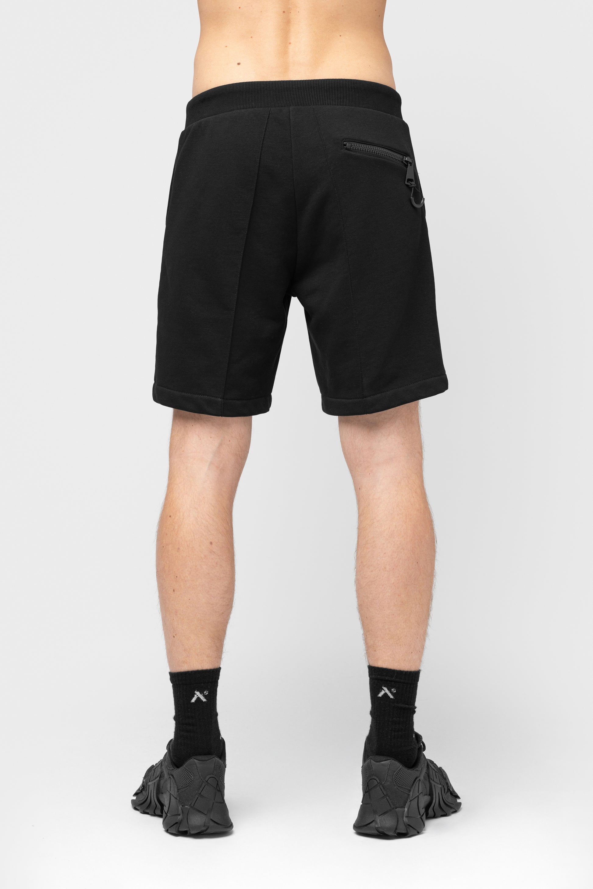 The shorts have a straight, slightly fitted silhouette with stitched pleats at the front and back, and a back pocket with a zipper. The waistband is ribbed with elastic and drawstrings for width adjustment, featuring two side pockets. Decorated with a black 3D logo on the right front side below the pocket.