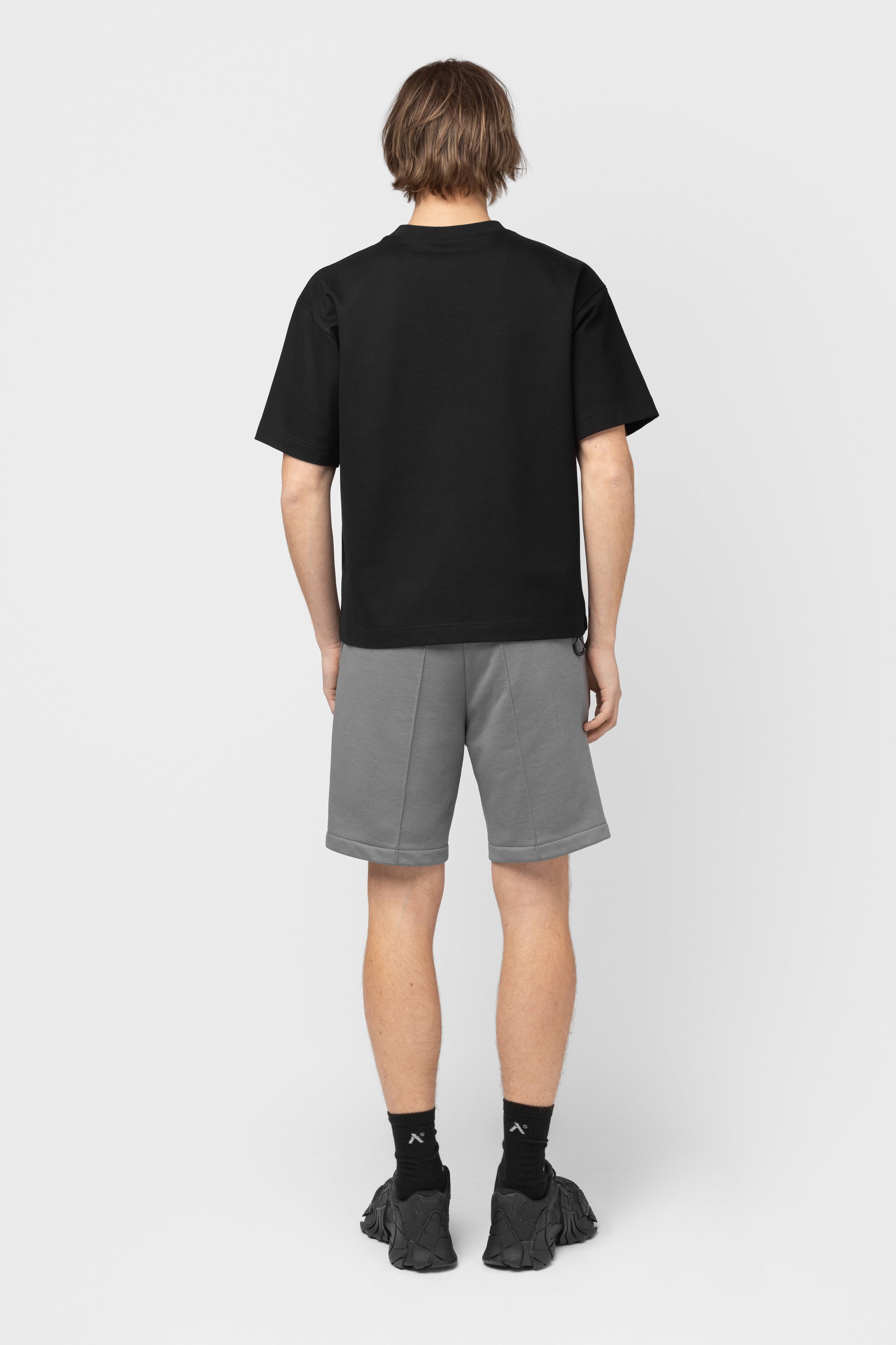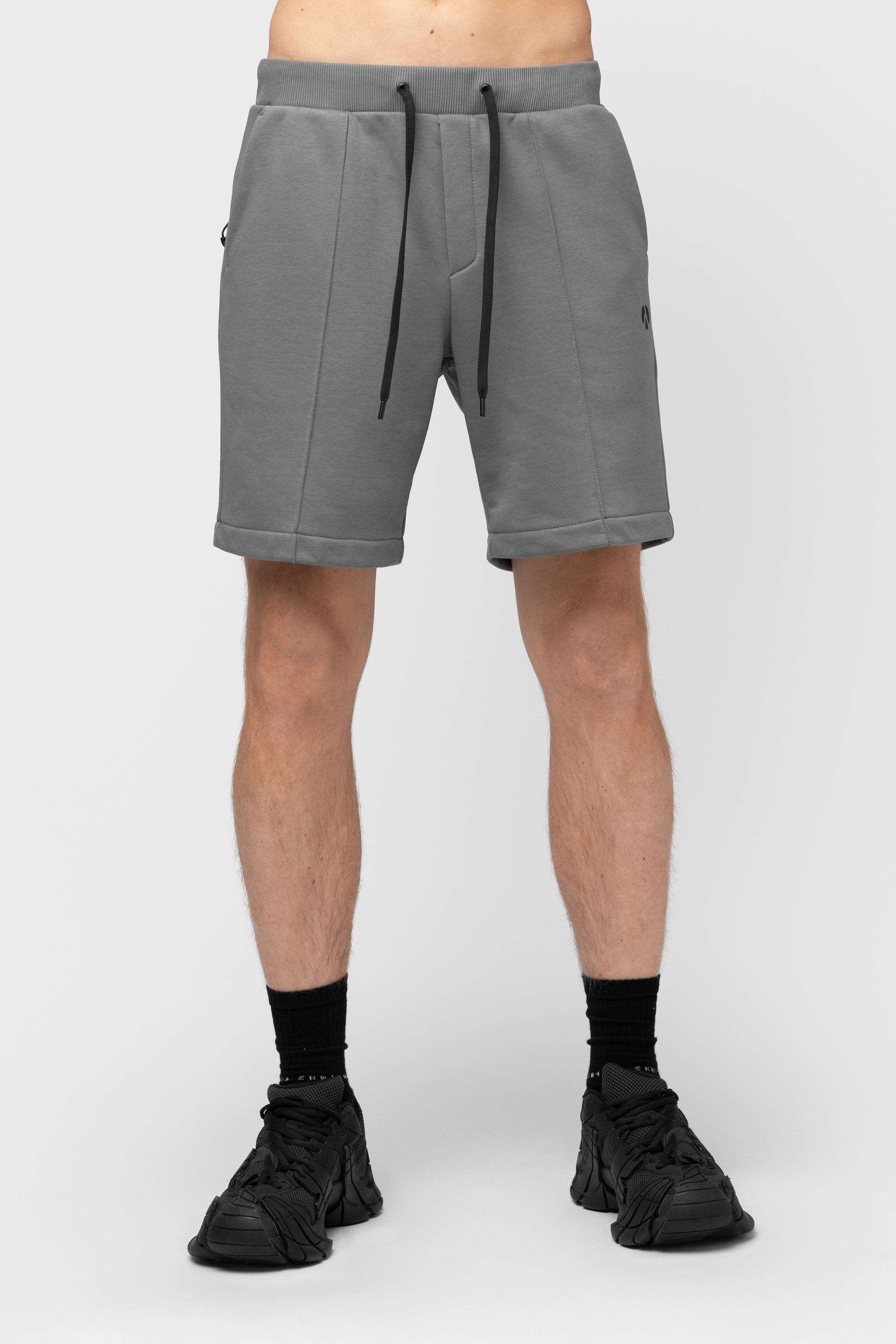 The shorts have a straight, slightly fitted silhouette with stitched pleats at the front and back, and a back pocket with a zipper. The waistband is ribbed with elastic and drawstrings for width adjustment, featuring two side pockets. Decorated with a black 3D logo on the right front side below the pocket.