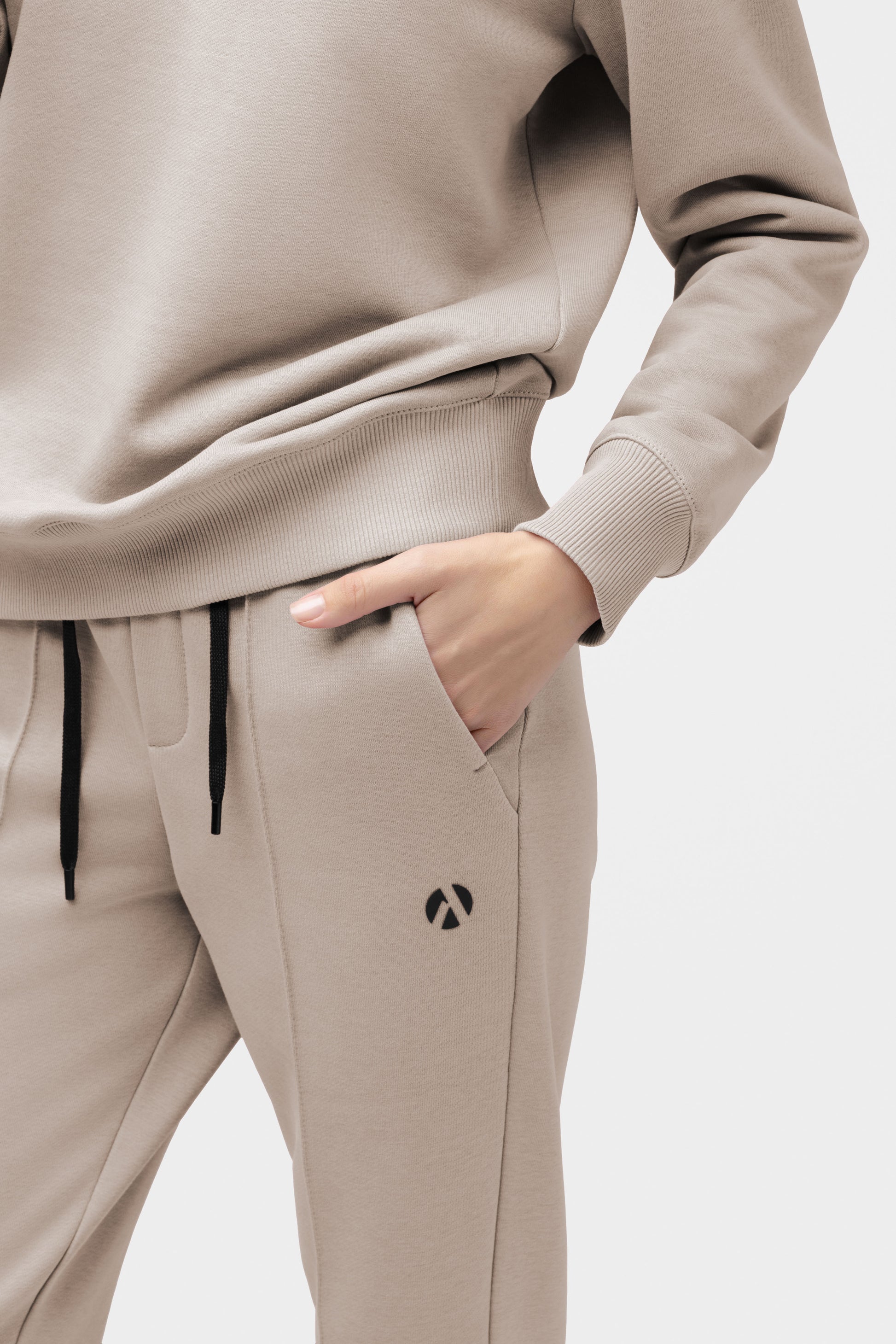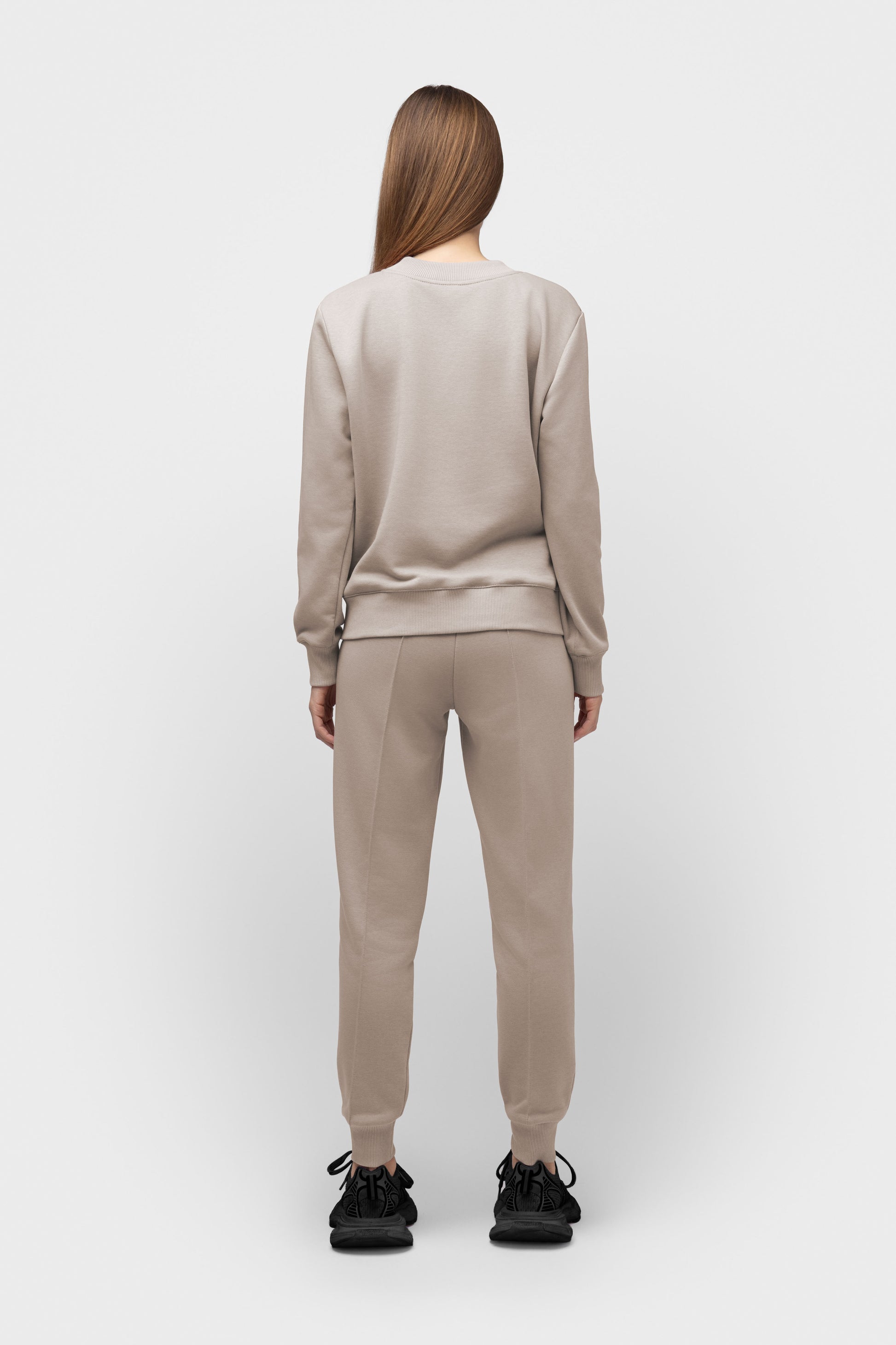 Dviejų dalių laisvalaikio kostiumas, šviesiai pilkos spalvos, dekoruotas juodais 3D logotipo transferais.