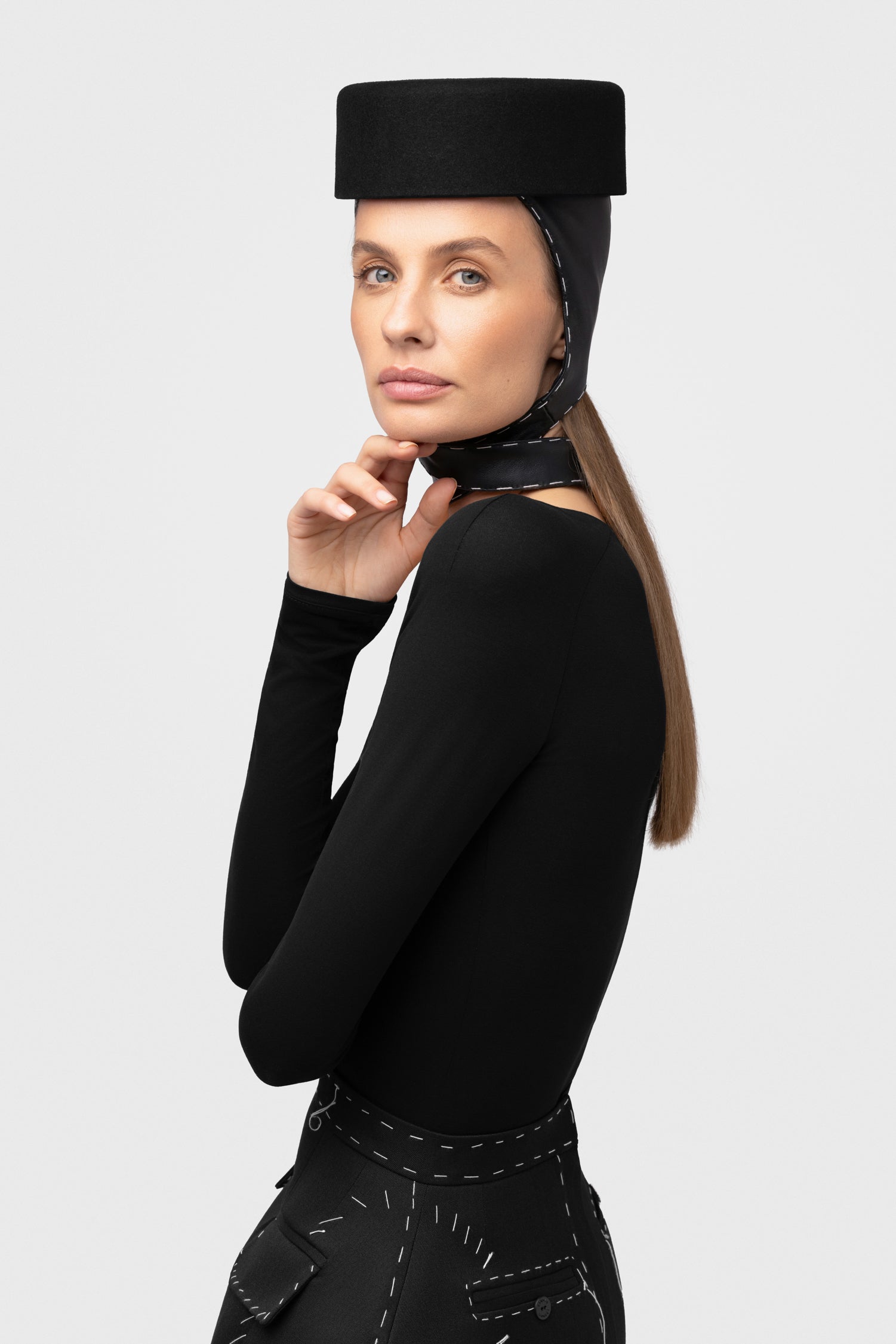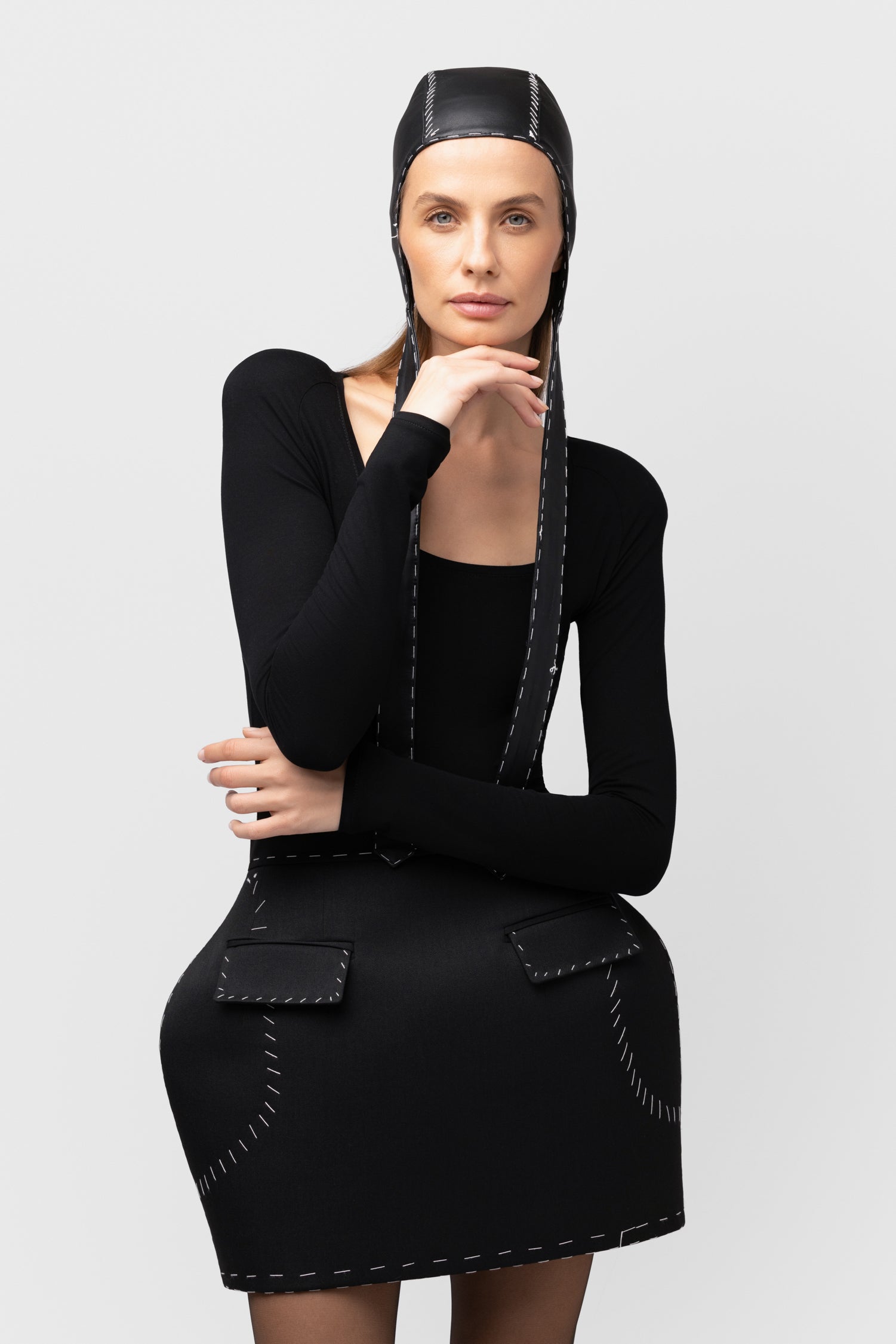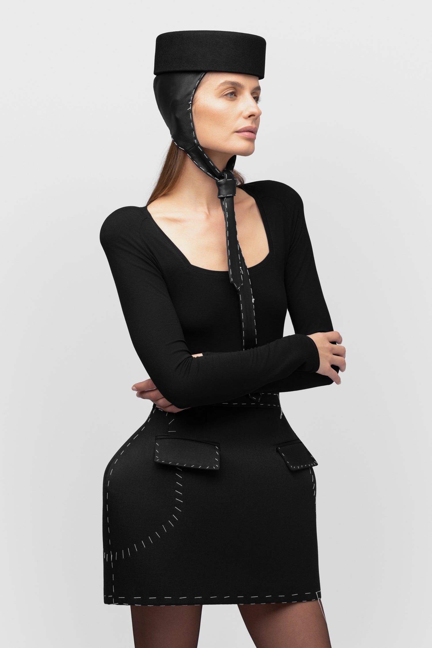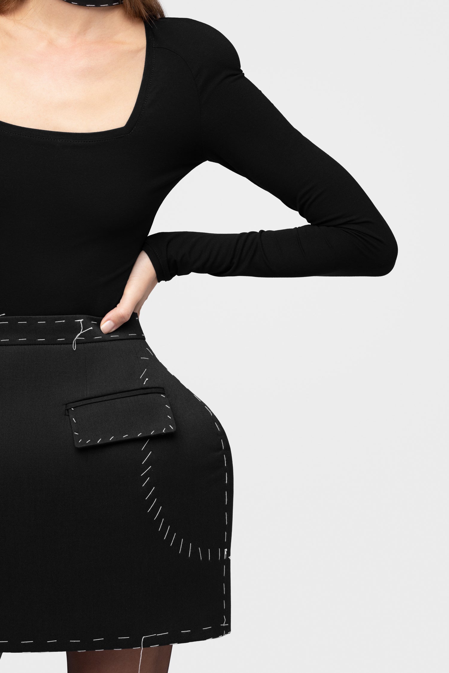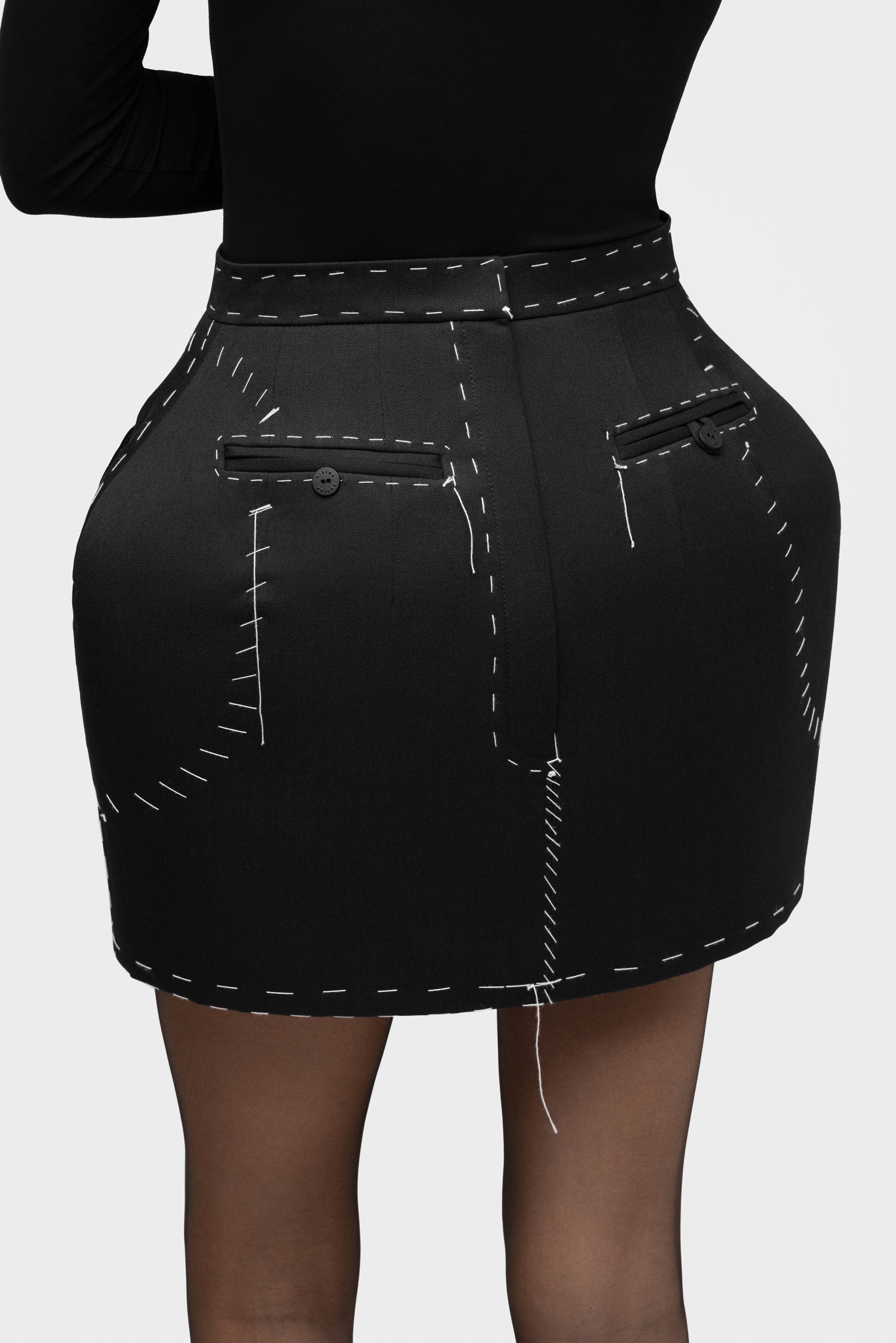Skulptūriškos formos tūrinis sijonas iš kietintos, klijuotos vilnos, su konstrukciniais įdėklais, leidžiančiais išlaikyti formą net dėvint. Matomos baltos siūlės išryškina konstrukcines linijas ir perteikia siuvimo proceso estetiką. Sijonas optiškai lieknina siluetą, pabrėžia liemenį ir tinka įvairioms figūroms.