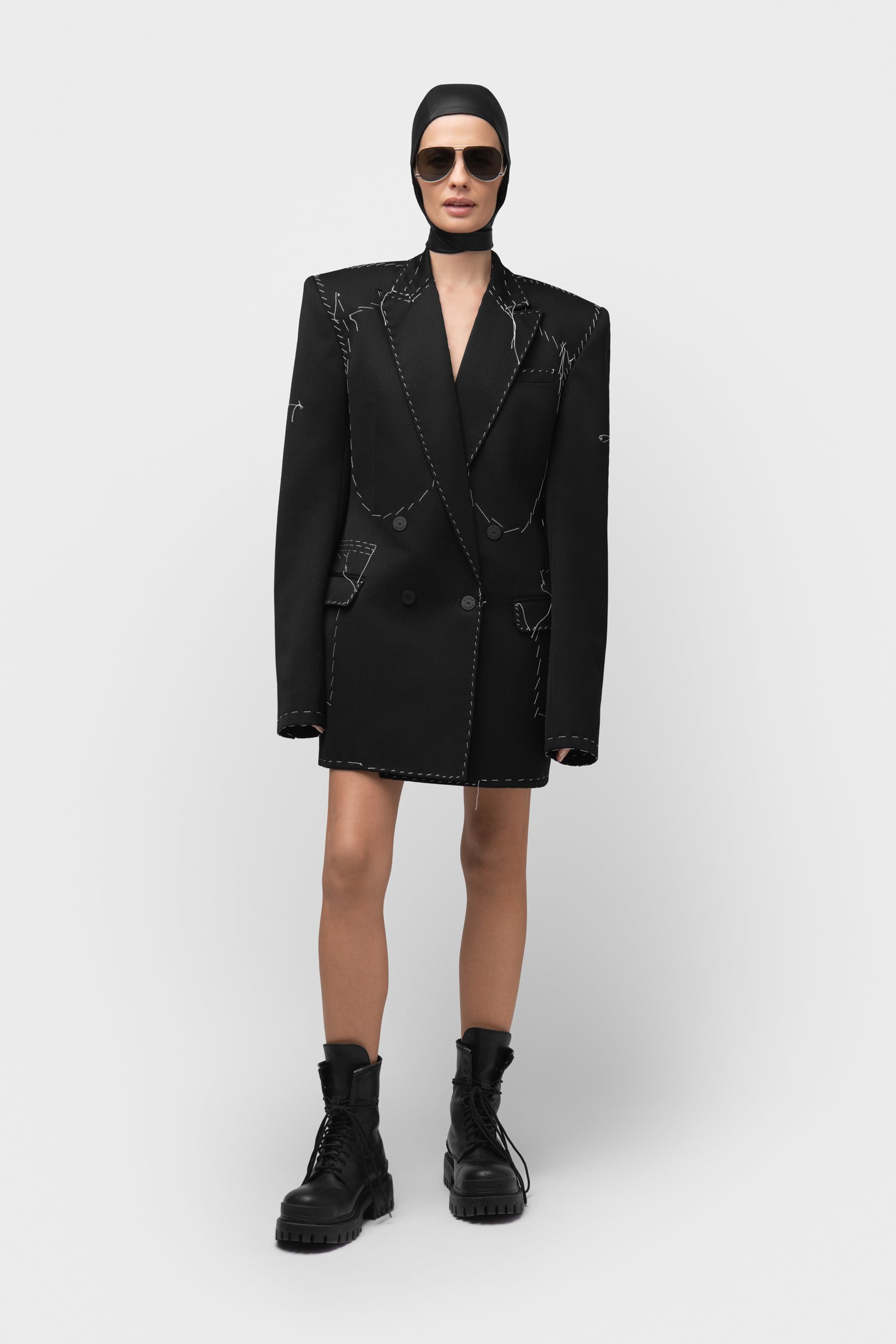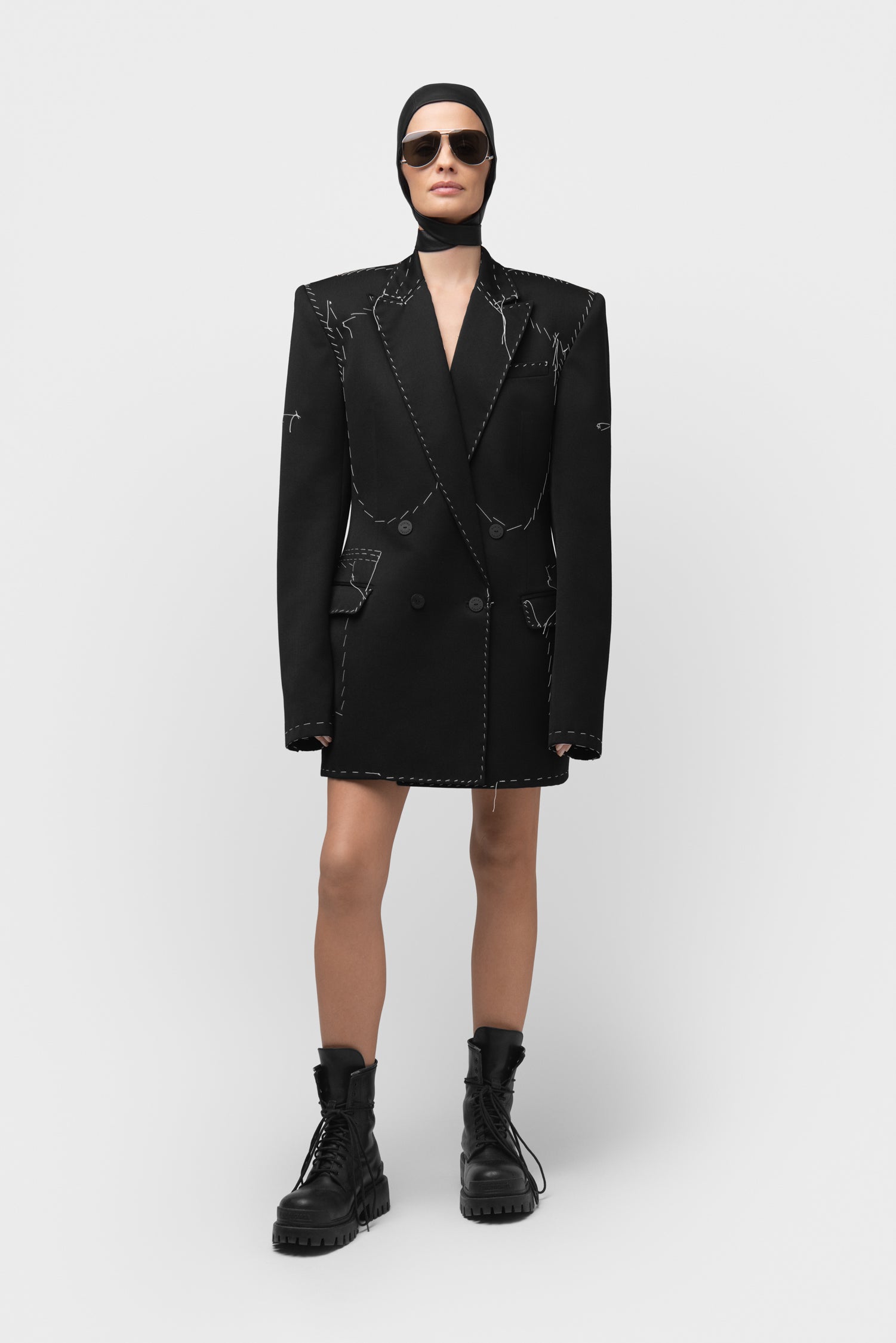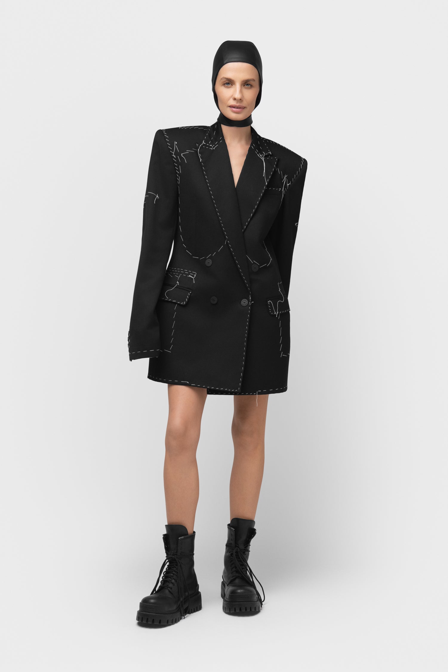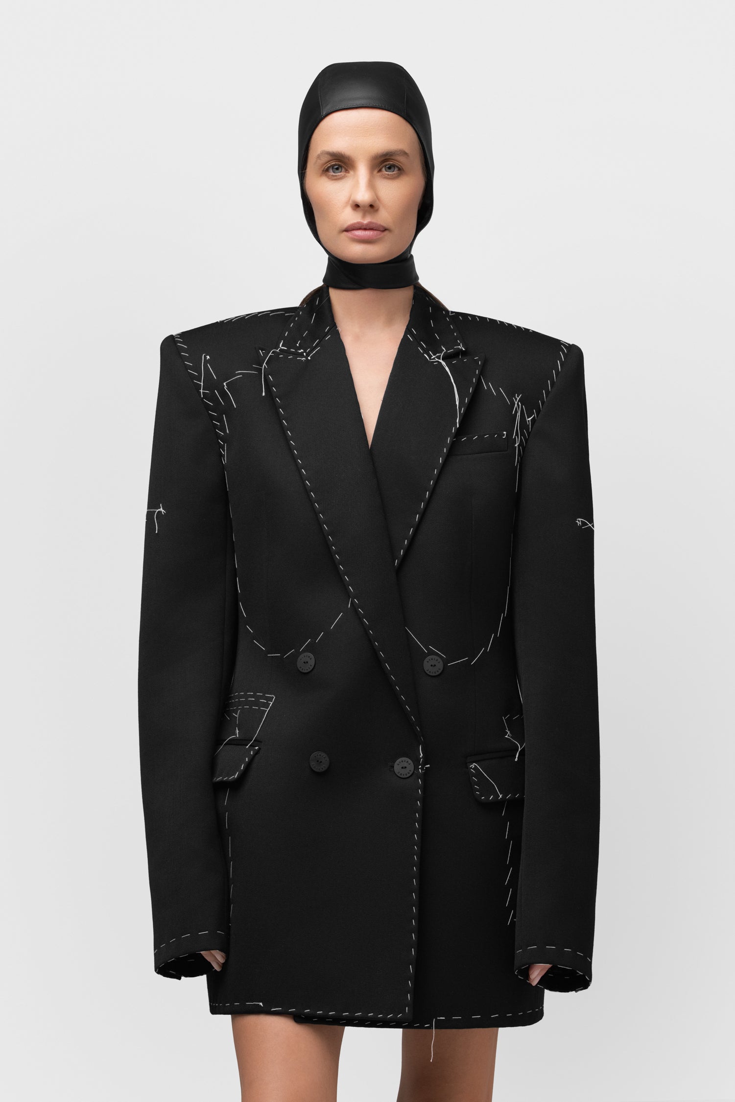 Struktūriškas, unisex, oversize silueto švarkas su įdėklais klubų srityje, suteikiančiais tūrinę, skulptūrišką formą. Kietintas, klijuotas flizelinu, išlaiko aiškias linijas ir formą. Matomos baltos siūlės – konceptuali nuoroda į siuvimo procesą.