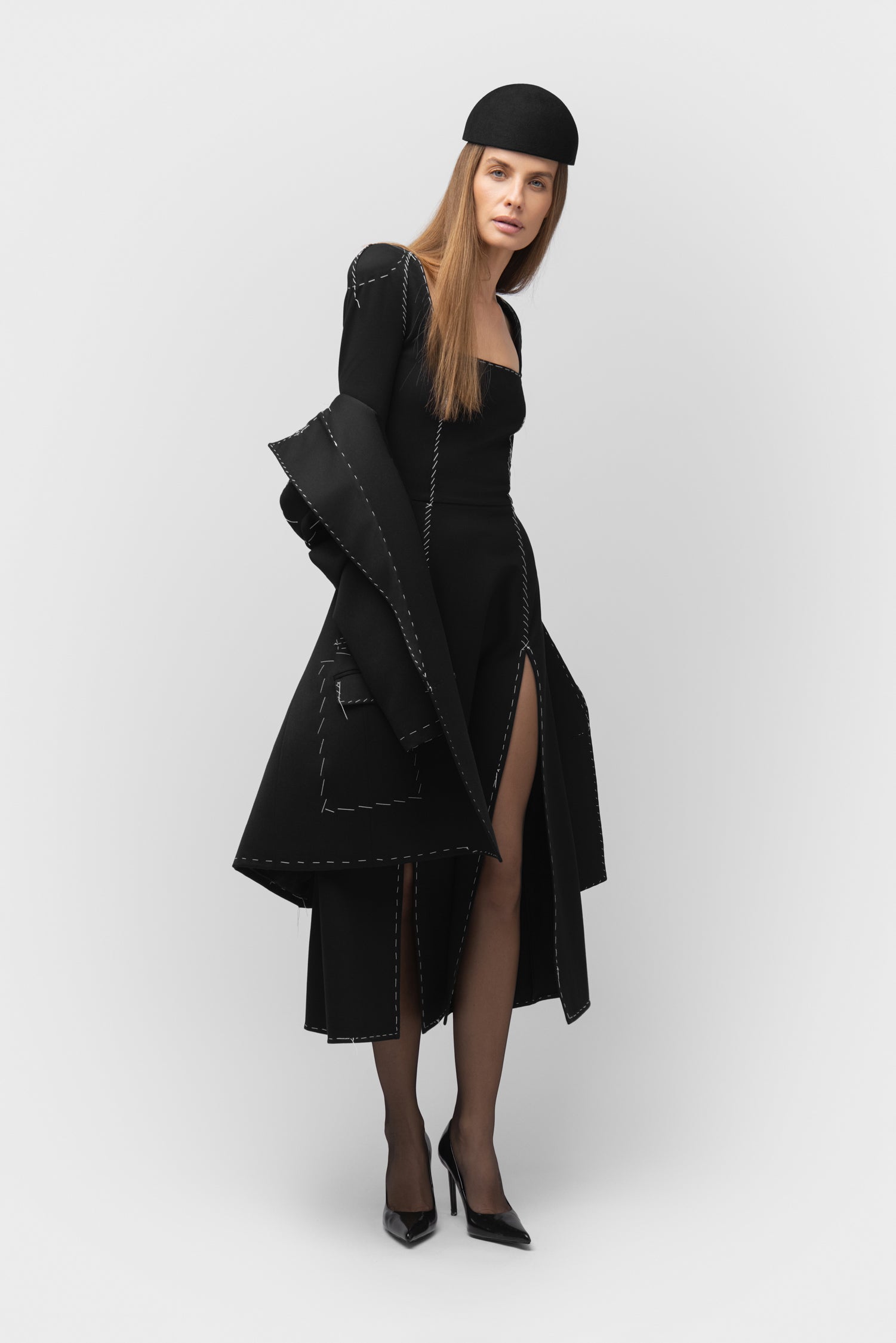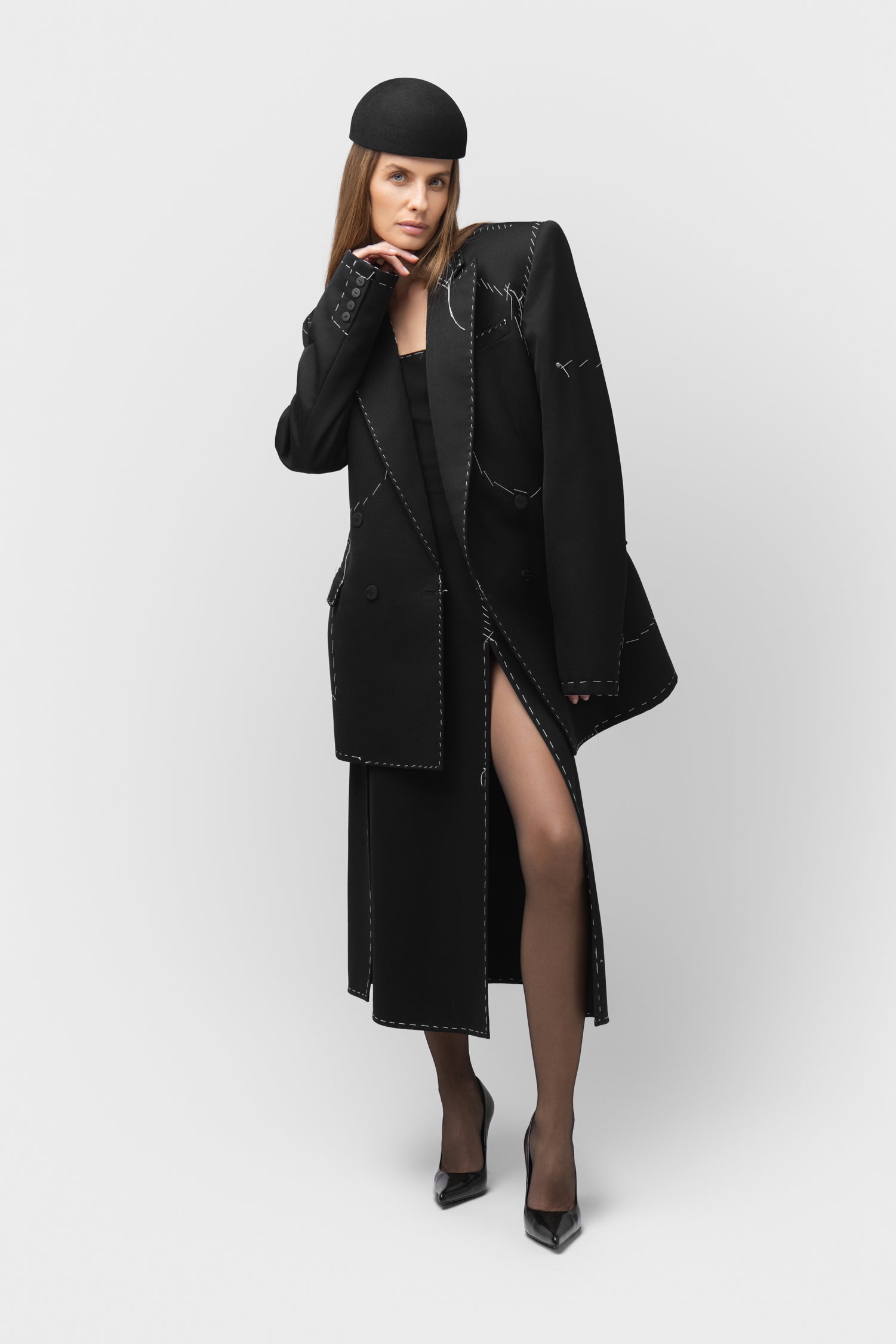 Prigludusi viršutinė dalis su kvadratine atvira iškirpte išryškina pečių ir kaklo liniją. Ilgos rankovės su reglano siūlėmis ir akcentuotais peteliais kuria modernų, galingą siluetą. Du gilūs skeltukai priekyje suteikia laisvės judesiui, o išryškintos siūlės drąsiai atskleidžia kolekcijos idėją – kūrinys, kuriame procesas tampa estetika.