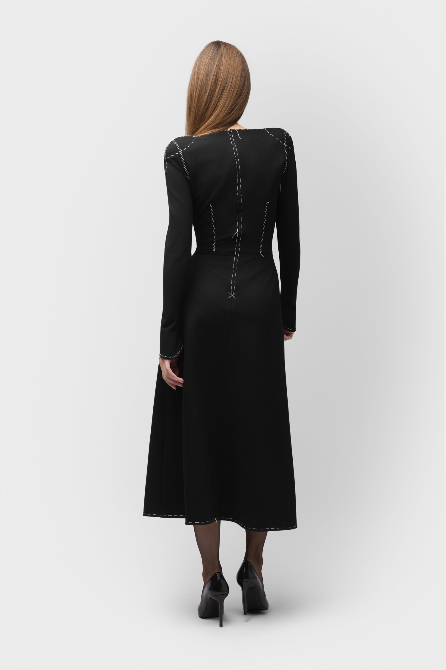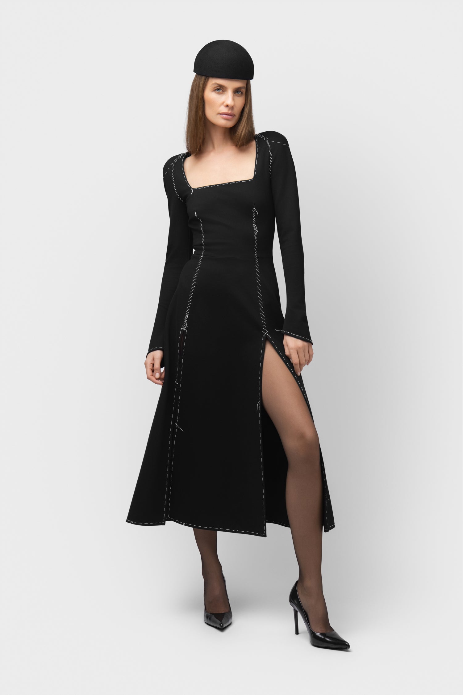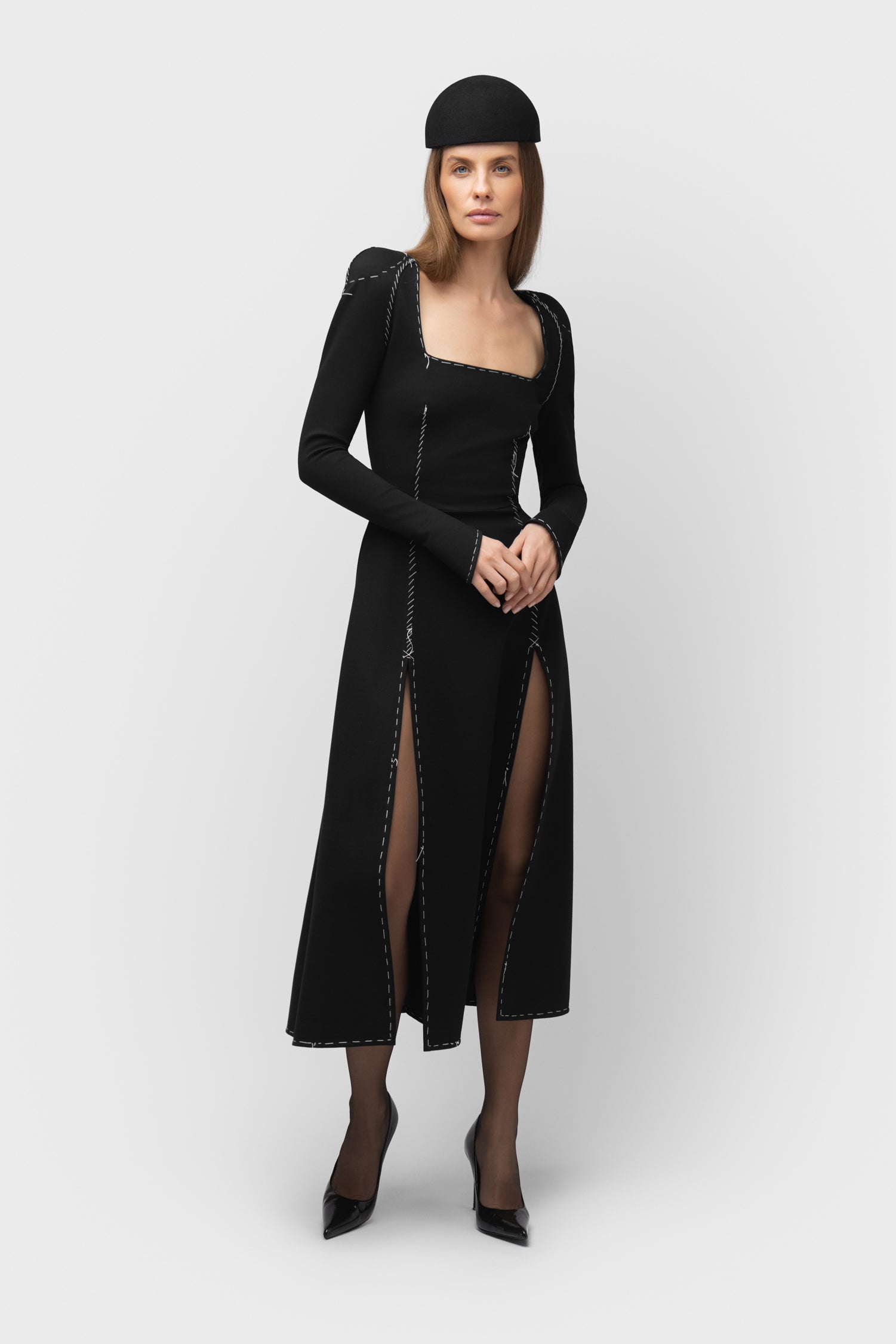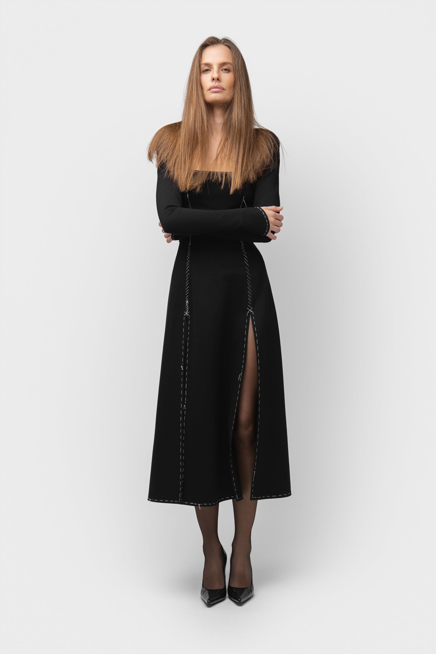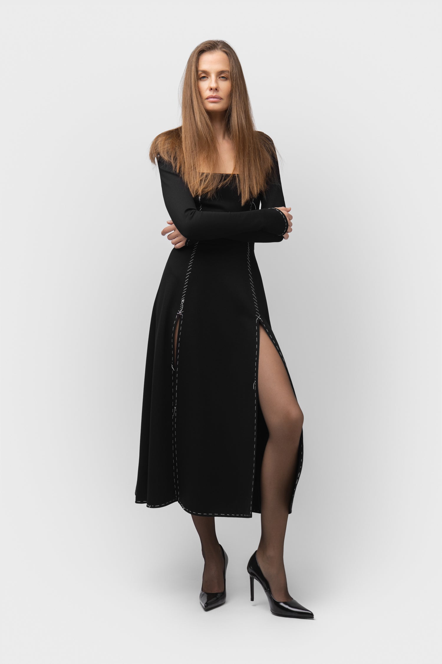 EBONE juoda midi suknelė su giliais skeltukais – BASTED kolekcija, rankomis dekoruotos, baltais daigstais, konstrukcinės siūlės.