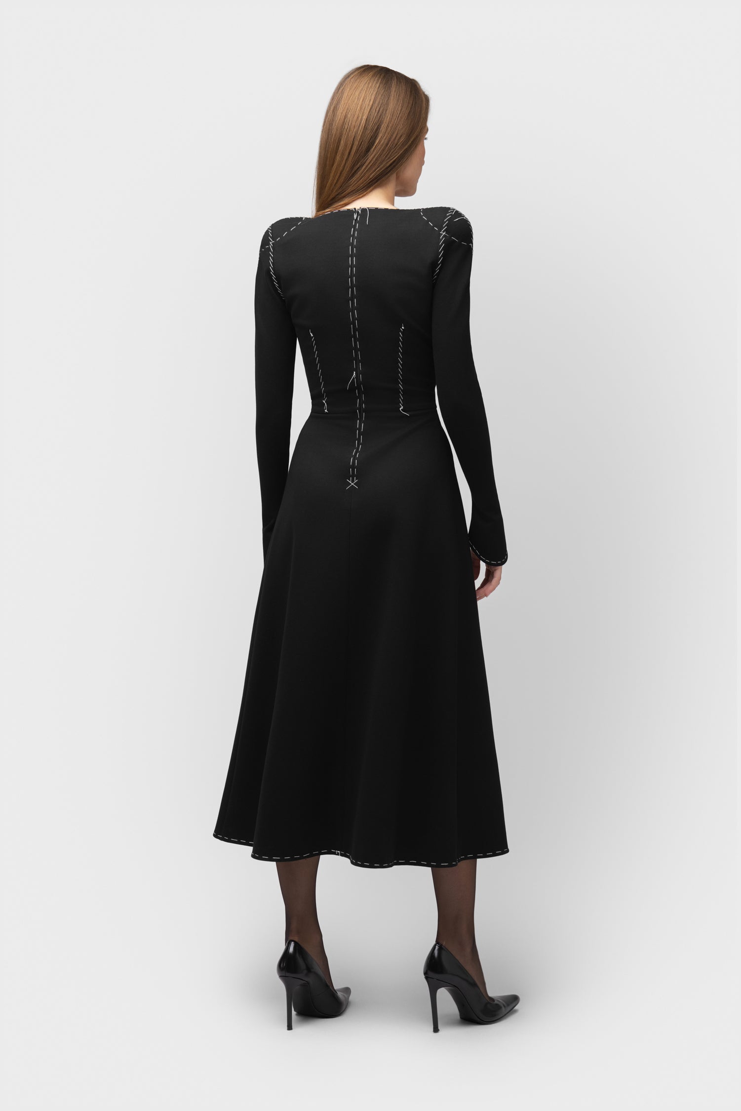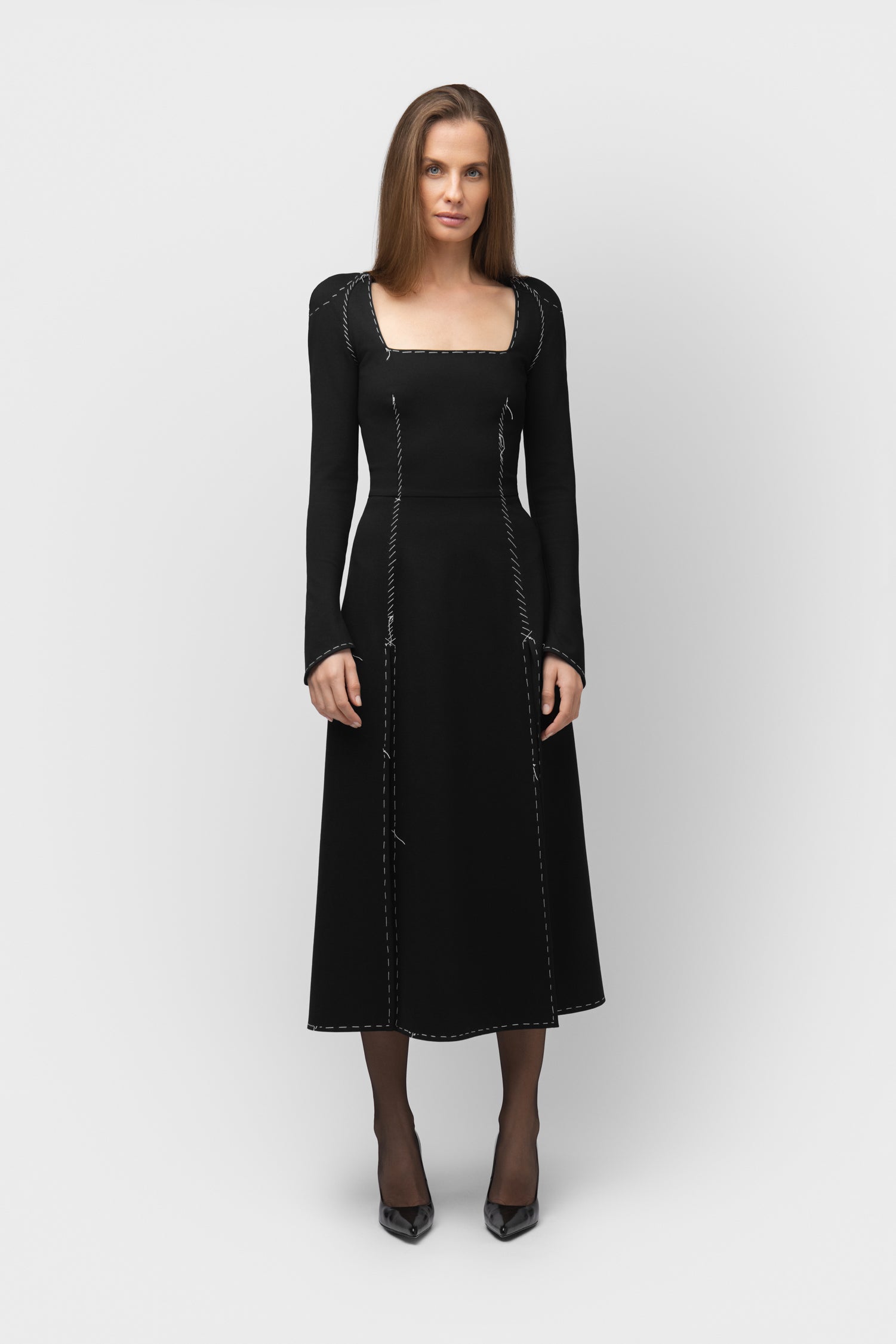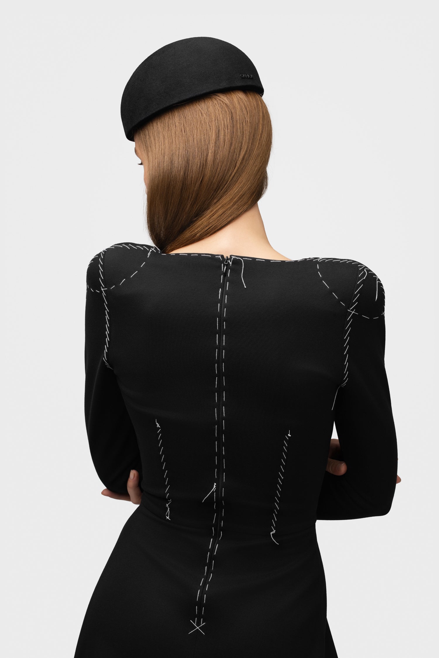 Struktūruota, drąsi ir su išskirtiniu charakteriu – ši juoda midi ilgio suknelė iš BASTED kolekcijos traukia akį kontrastingais baltos spalvos rankų darbo dygsniais, imituojančiais siuvimo proceso estetiką. Sukurta iš standaus trikotažo, išlaiko savo formą ir puikiai krenta.