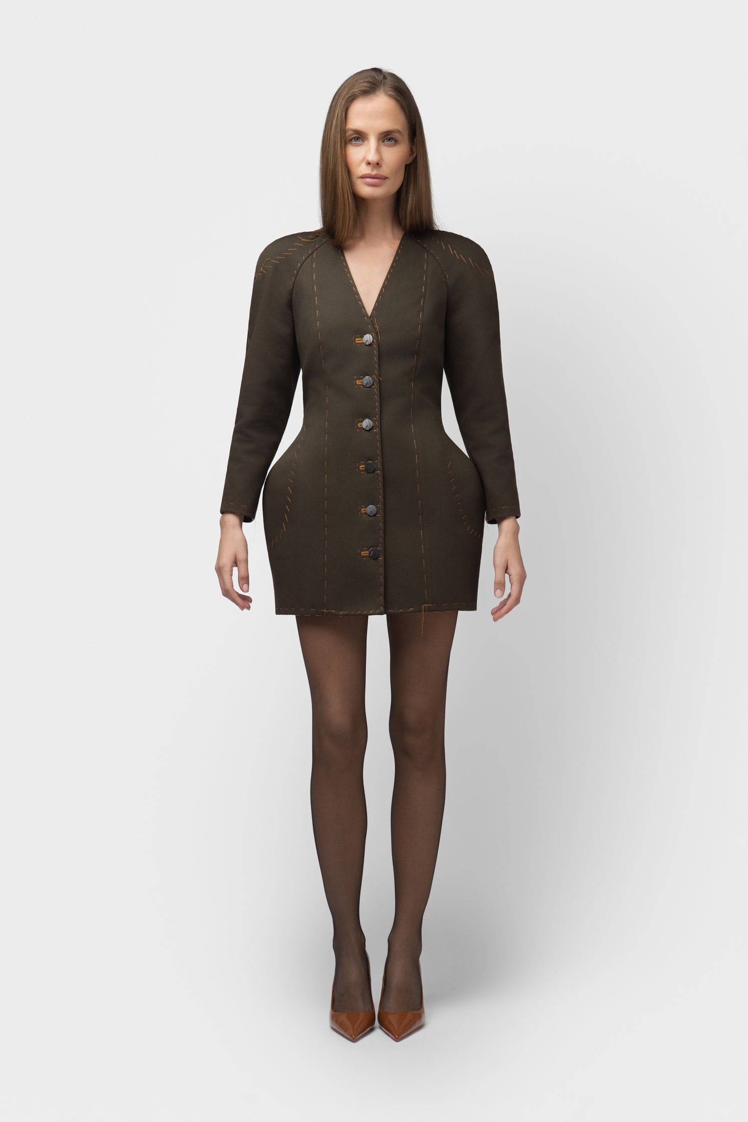 Skulptūriška BASTED kolekcijos, chaki spalvos, suknelė su masyviais reglano pečiais, formuotais klubais ir V formos iškirpte. Suknelės priekis užsegamas sagomis. Su siaurėjančiomis, patrumpinto ilgio rankovėmis. Rankomis siuvinėtos kontrastinės linijos ir tamsinto metalo sagos su logotipu pabrėžia išskirtinį konstrukcijos charakterį.
