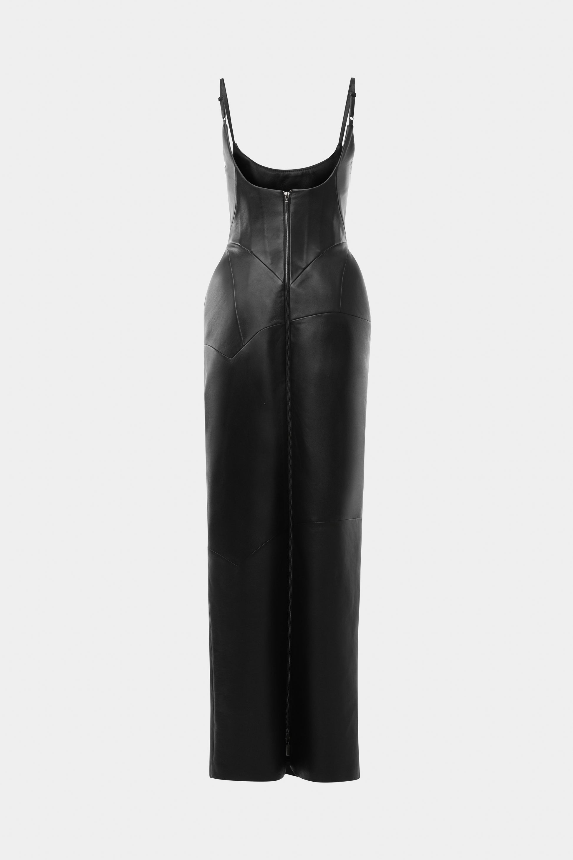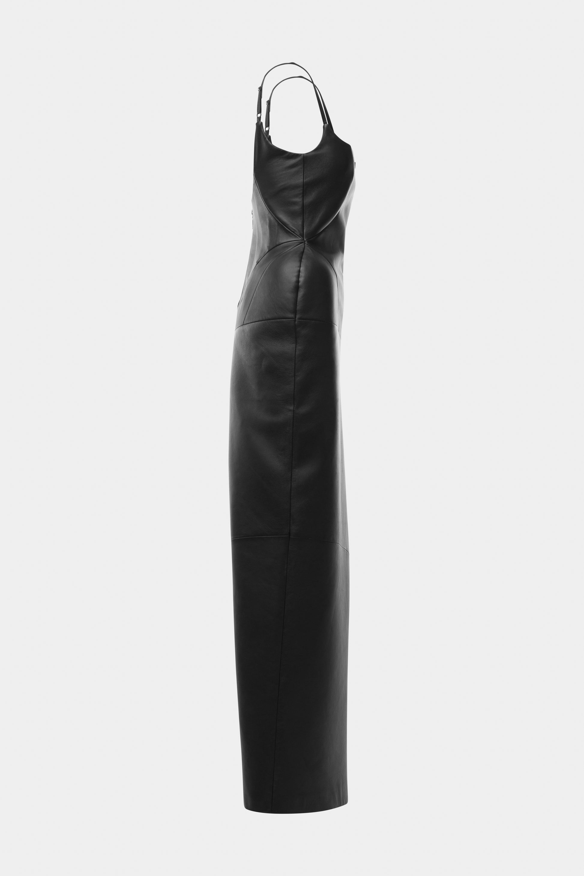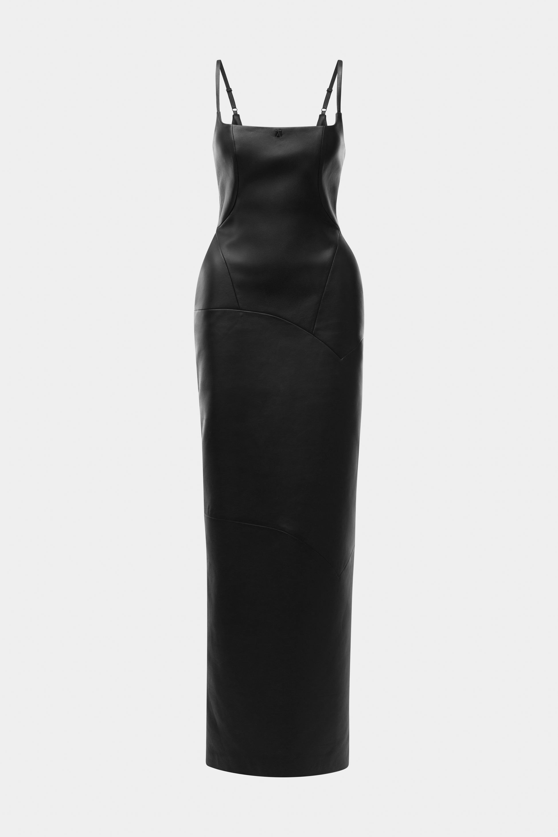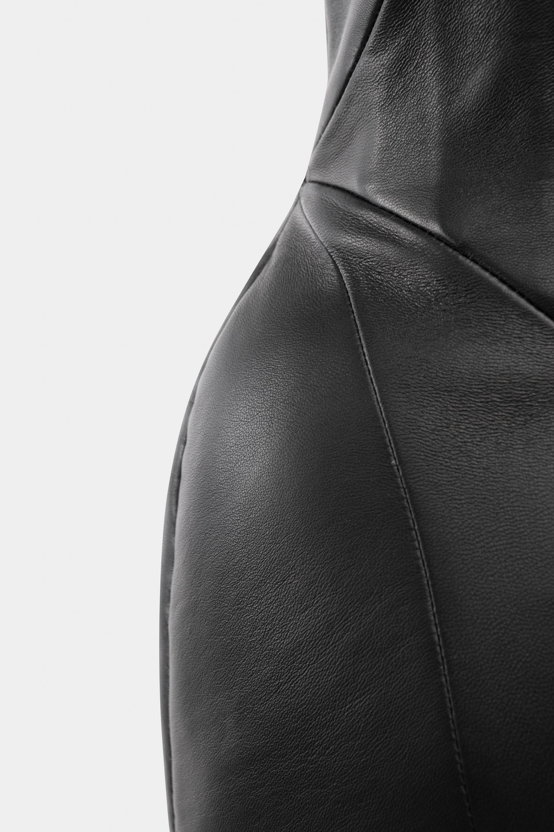 Ilga, skulptūriška suknelė, pasiūta iš aukštos kokybės natūralios odos.