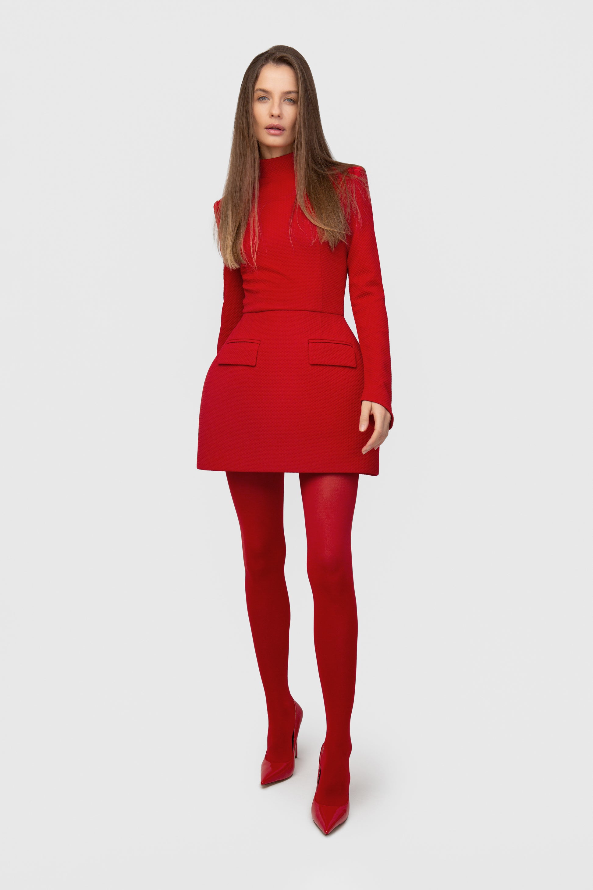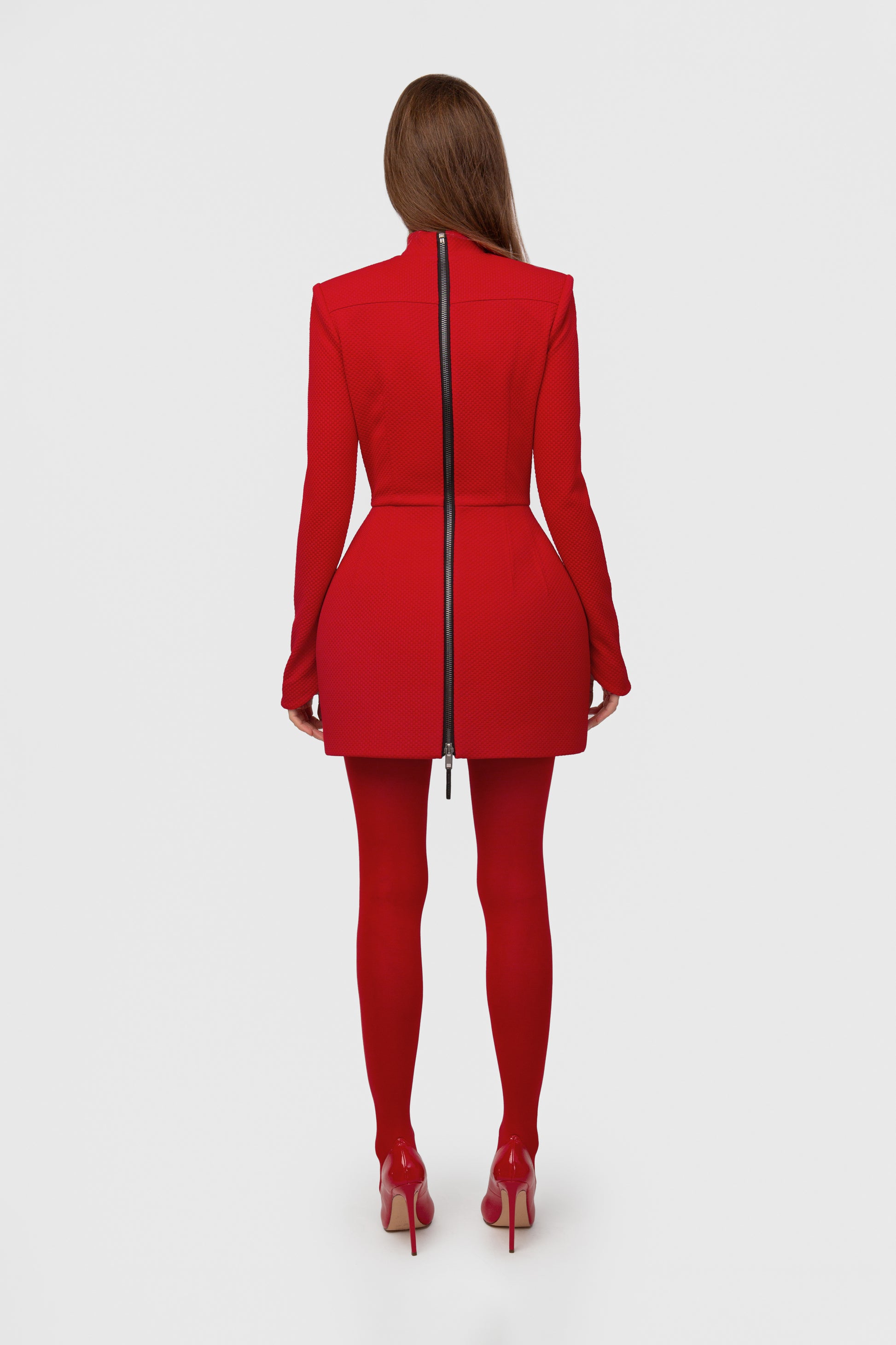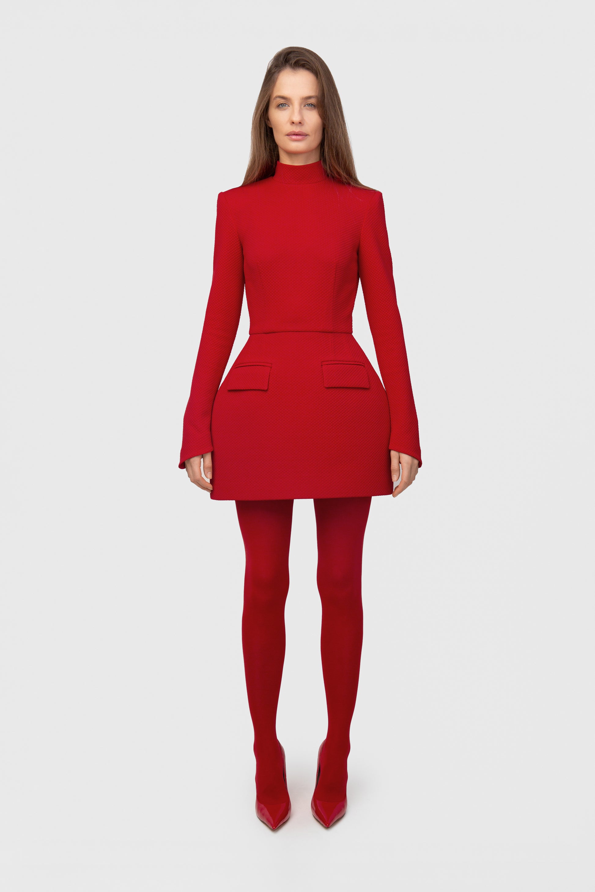 Raudona tūrinė KONE suknelė su stačia apykakle. Standaus trikotažo su reljefo raštu, viršutinė dalis turi elastano, kiek tempiasi krūtinės srityje, apatinė dalis kieta, išformuota, išlaikanti tūrinę formą. Priekyje yra dvi kišenes su antkišeniais. Statytos rankovės, įsiūti statūs, kietinti peteliai. Nugaros centre, per visą ilgį, tamsinto nikelio atidaromas užtrauktukas, galvutė dekoruota natūralios odos juostele su AIRIDA SKRICK įspaudu.