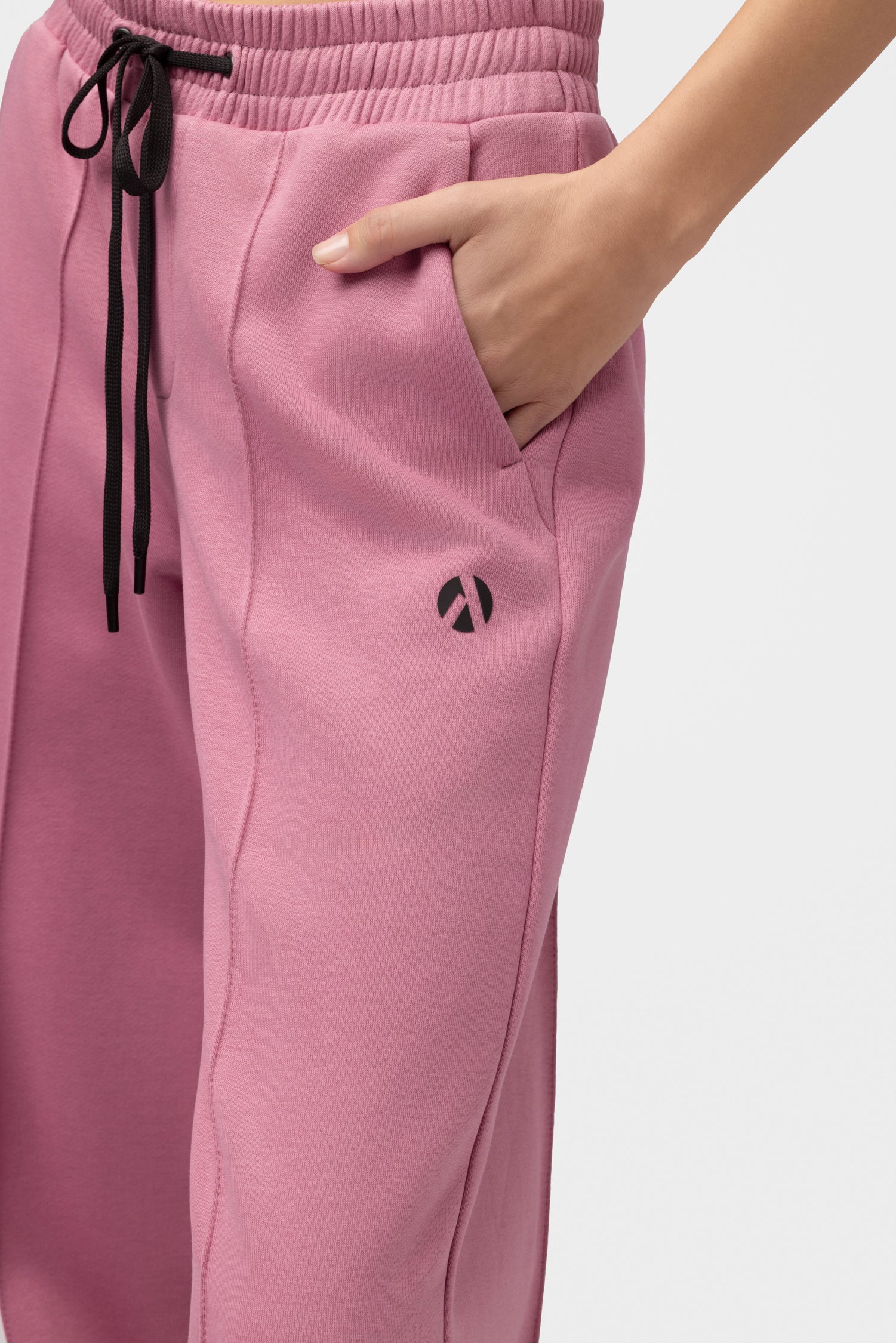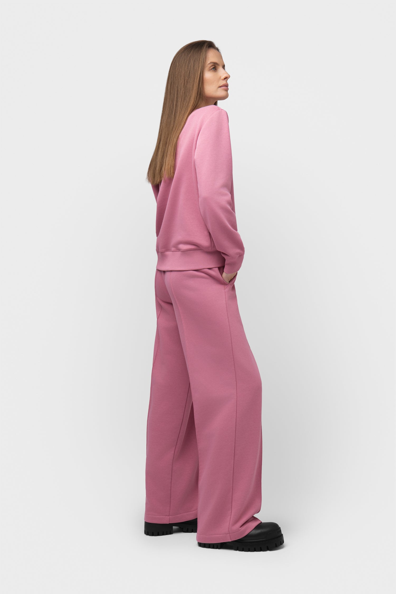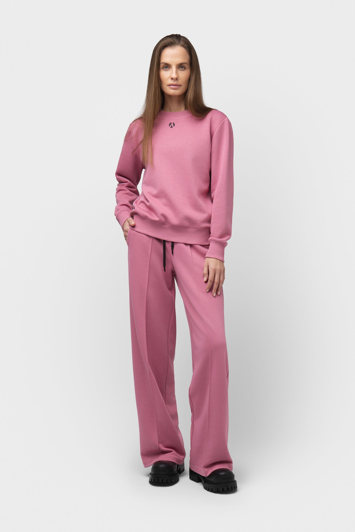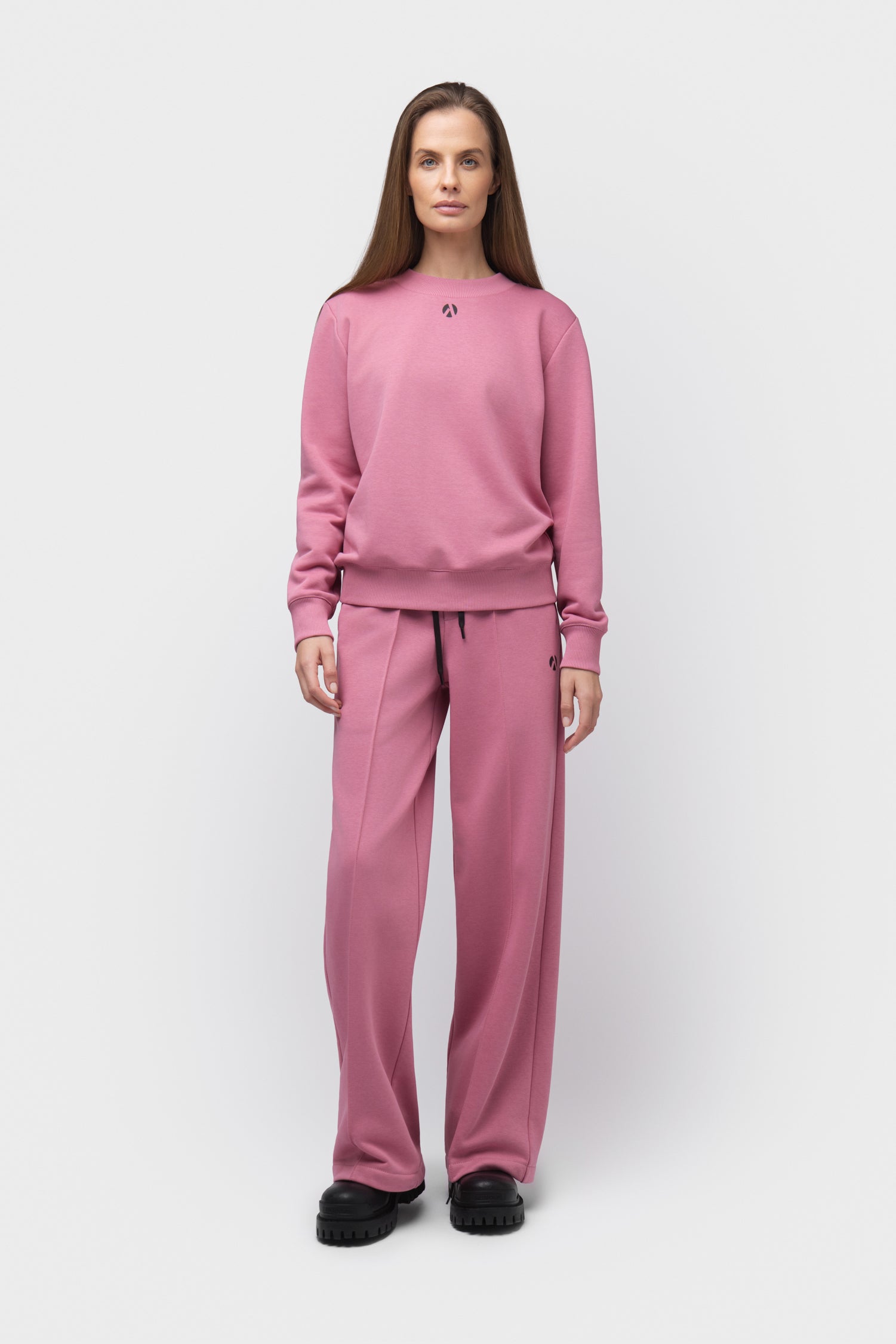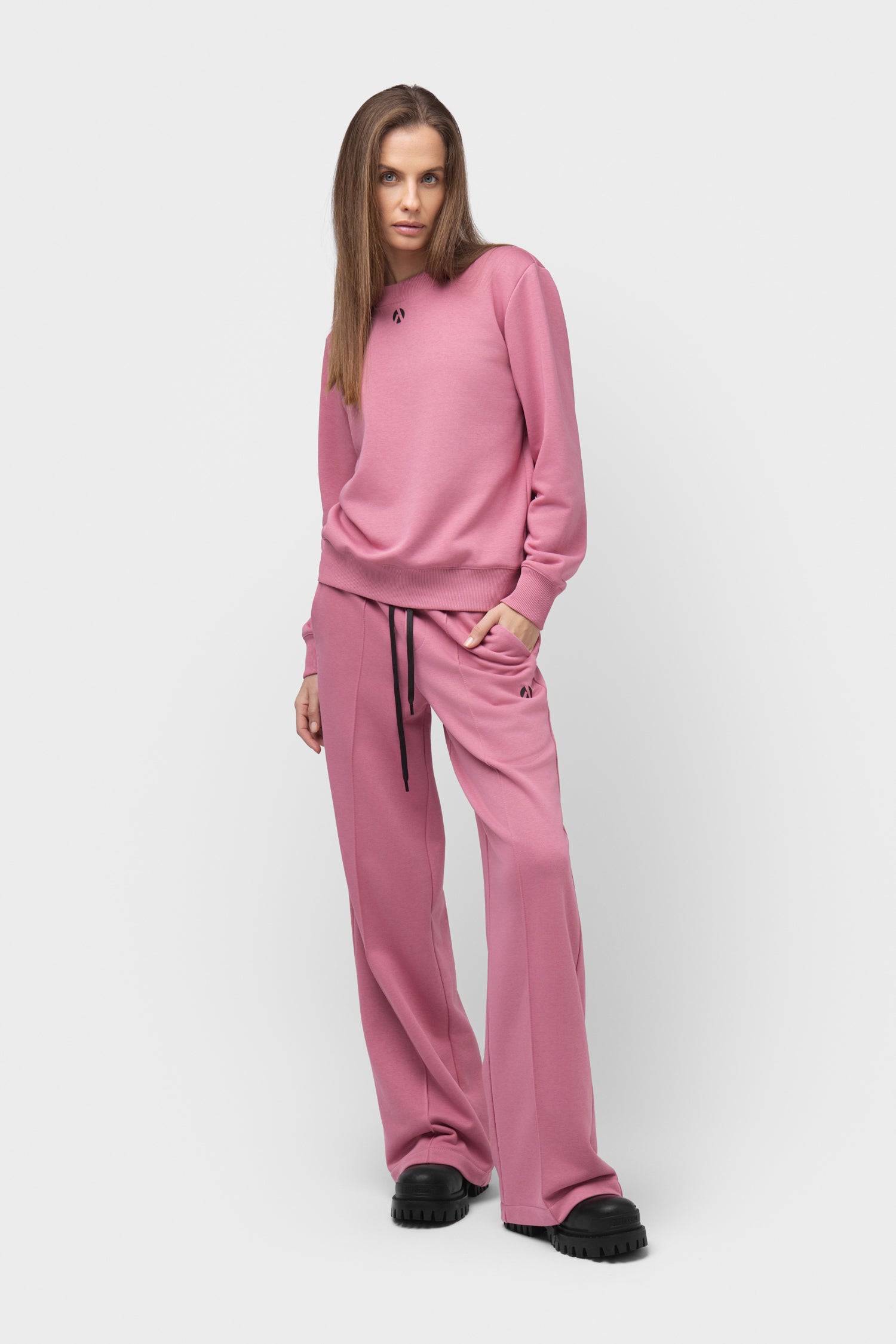 Dviejų dalių laisvalaikio kostiumas, pelenų rožės spalvos, dekoruotas juodais 3D logotipo transferais.