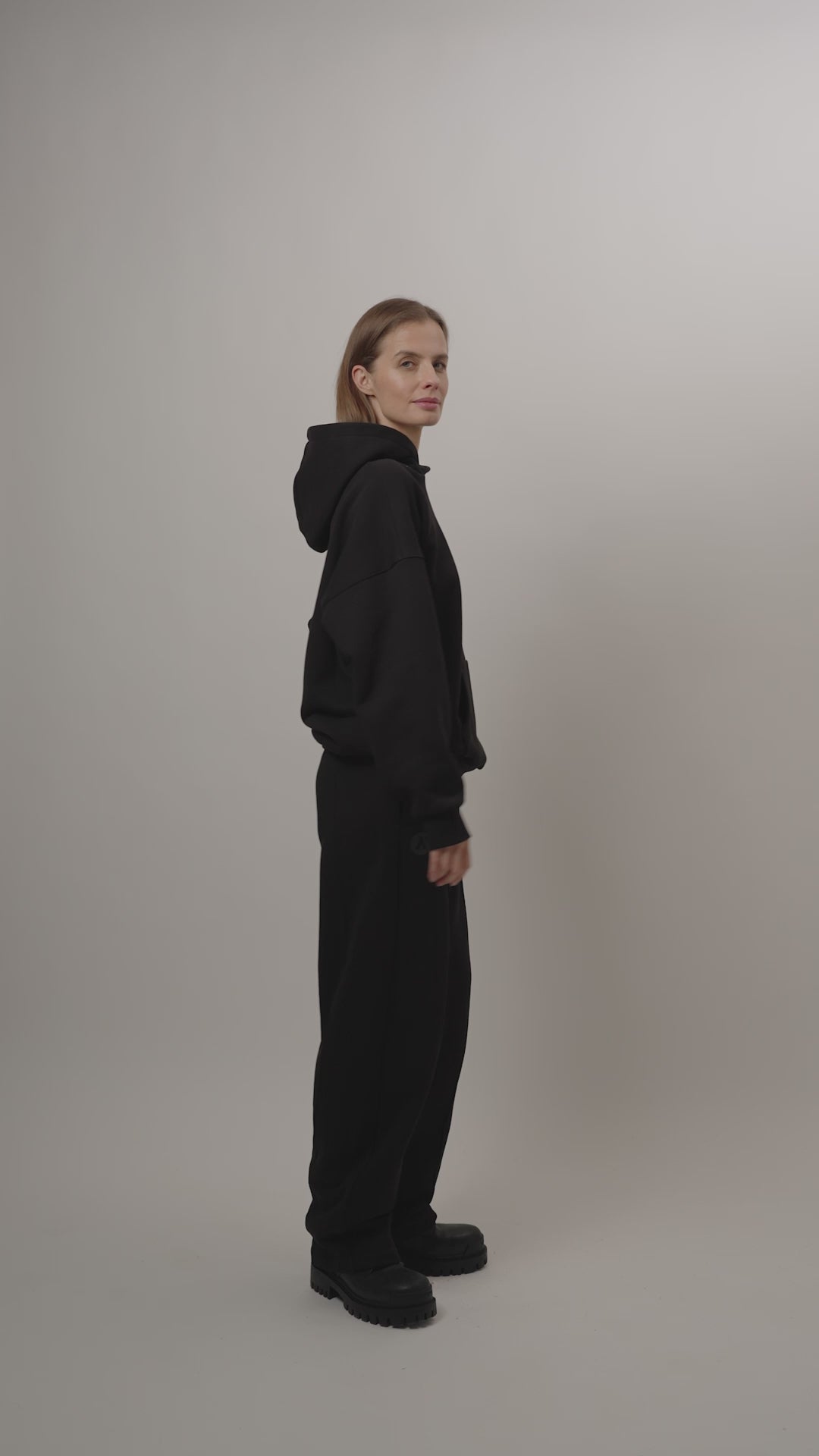 Dviejų dalių laisvalaikio kostiumas, dekoruotas juodais 3D logotipo transferais.