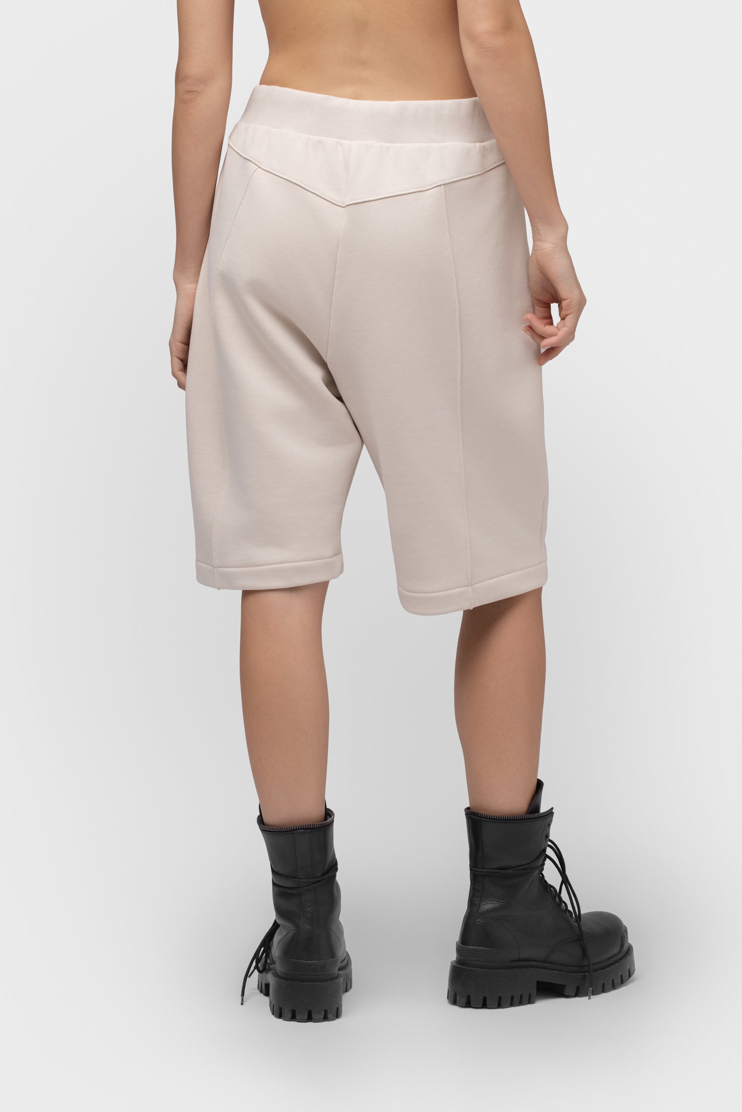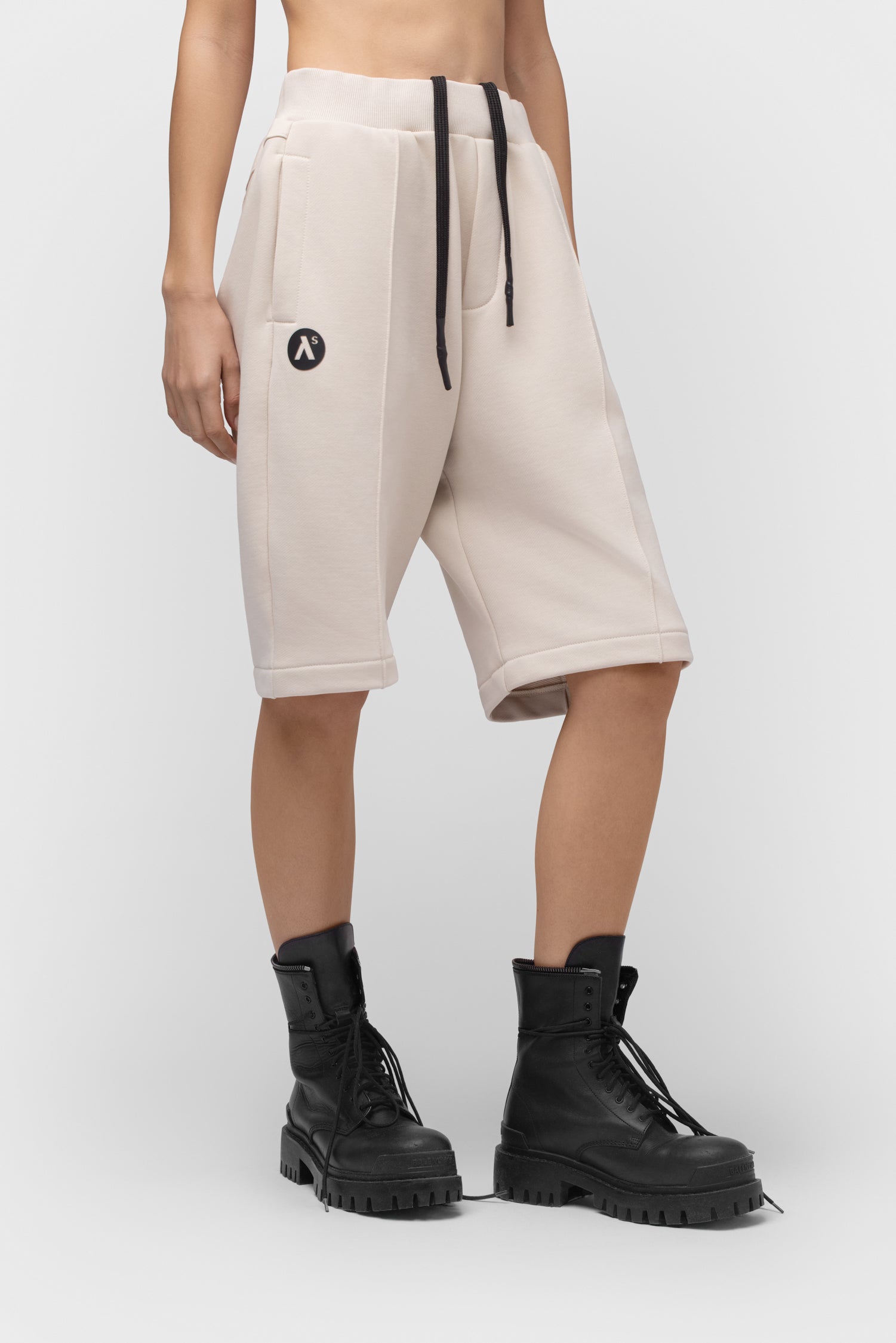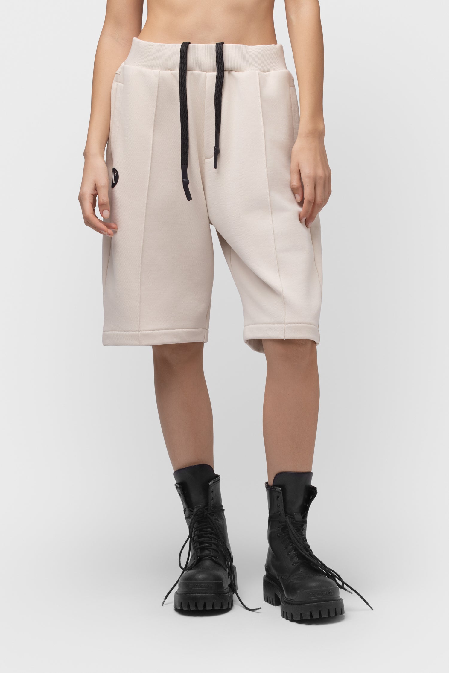 Platūs, lenkto kirpimo, iki kelių ilgio. Priekio ir nugaros dalyse – nusiūti kantai, suteikiantys struktūros. Liemuo su megztu juosmeniu, guma ir vidiniais raišteliais pločio reguliavimui. Šonuose – dvi kišenės. Dešinėje pusėje, po kišene – juodas 3D logotipo dekoras.