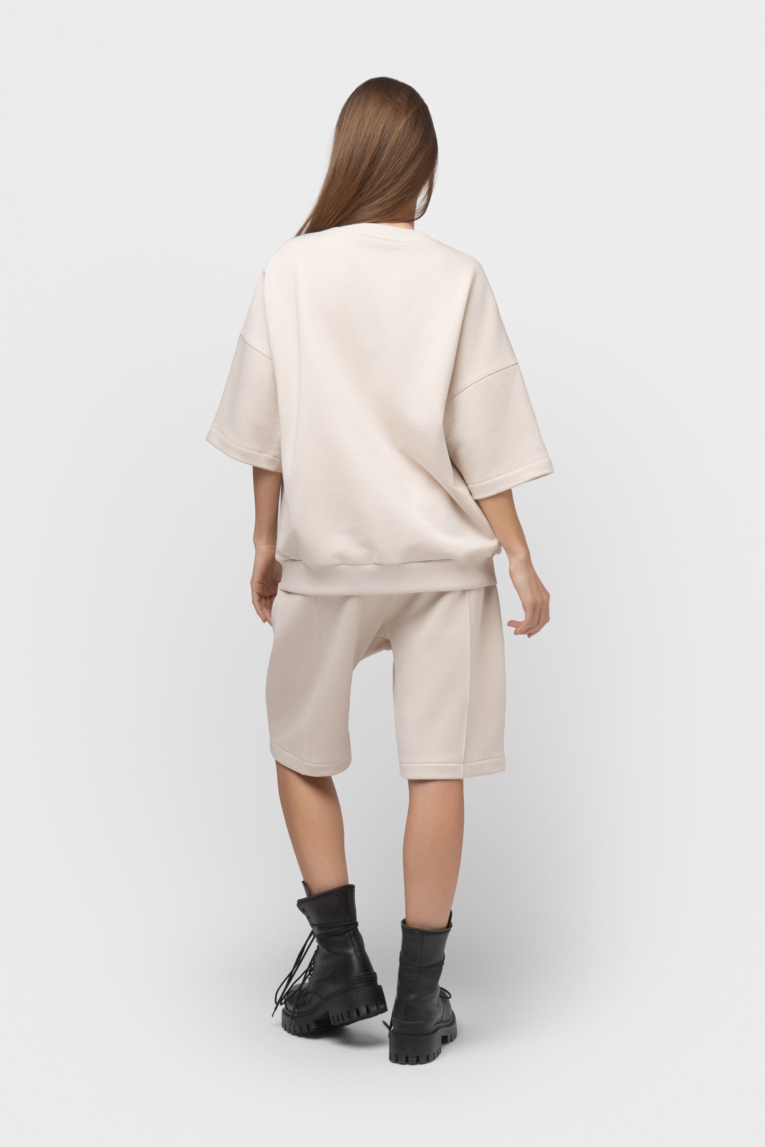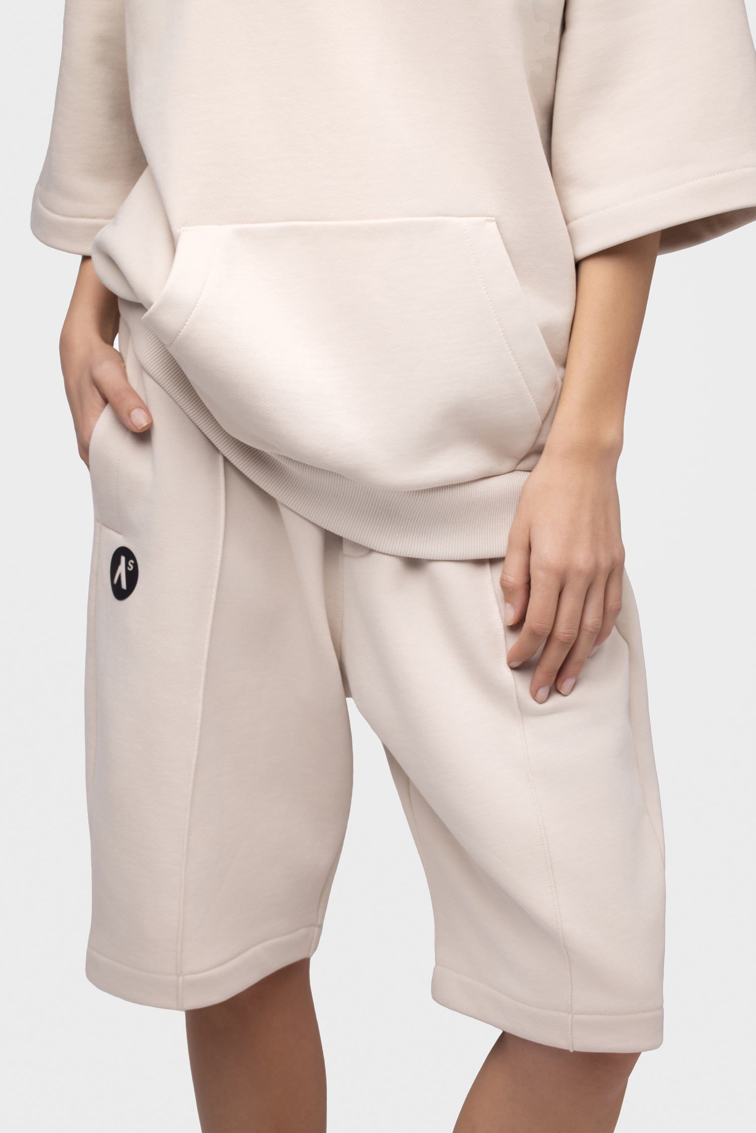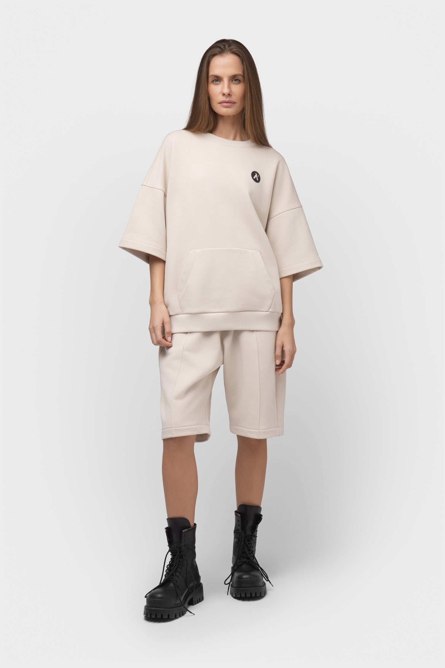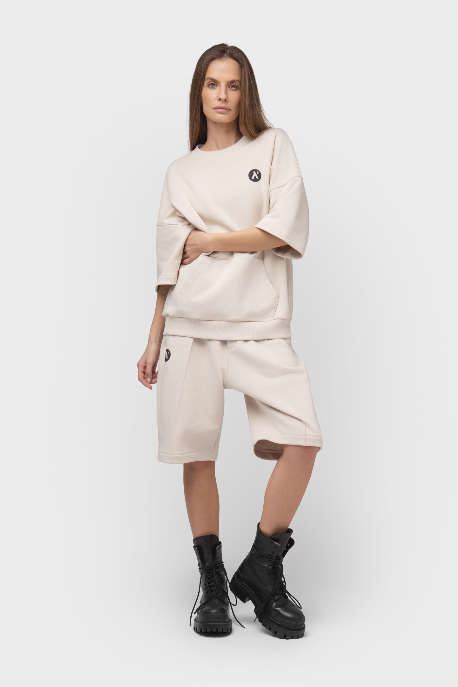 Platūs, lenkto kirpimo, iki kelių ilgio. Priekio ir nugaros dalyse – nusiūti kantai, suteikiantys struktūros. Liemuo su megztu juosmeniu, guma ir vidiniais raišteliais pločio reguliavimui. Šonuose – dvi kišenės. Dešinėje pusėje, po kišene – juodas 3D logotipo dekoras.