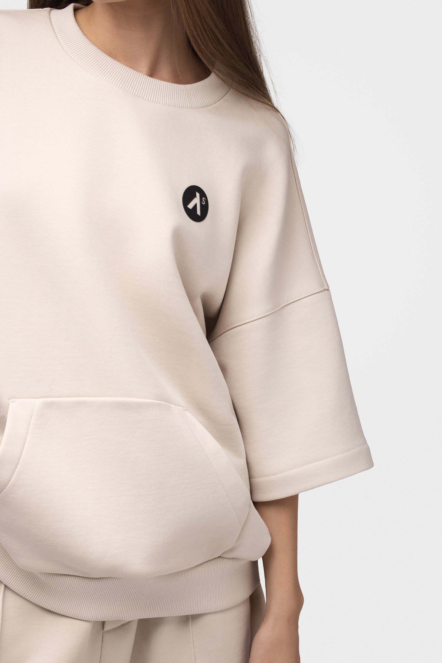 Laisvo silueto modelis su nuleistomis rankovėmis iki alkūnių. Priekyje – kengūros tipo kišenė. Kairėje pusėje – juodas 3D logotipo dekoras.