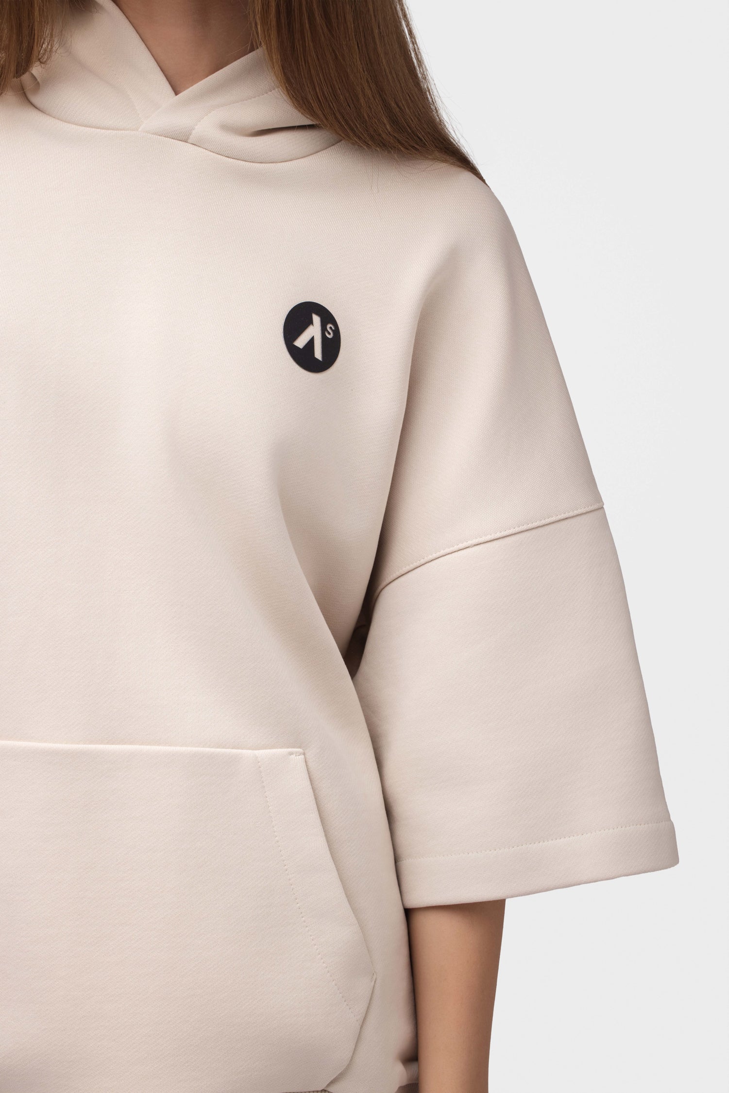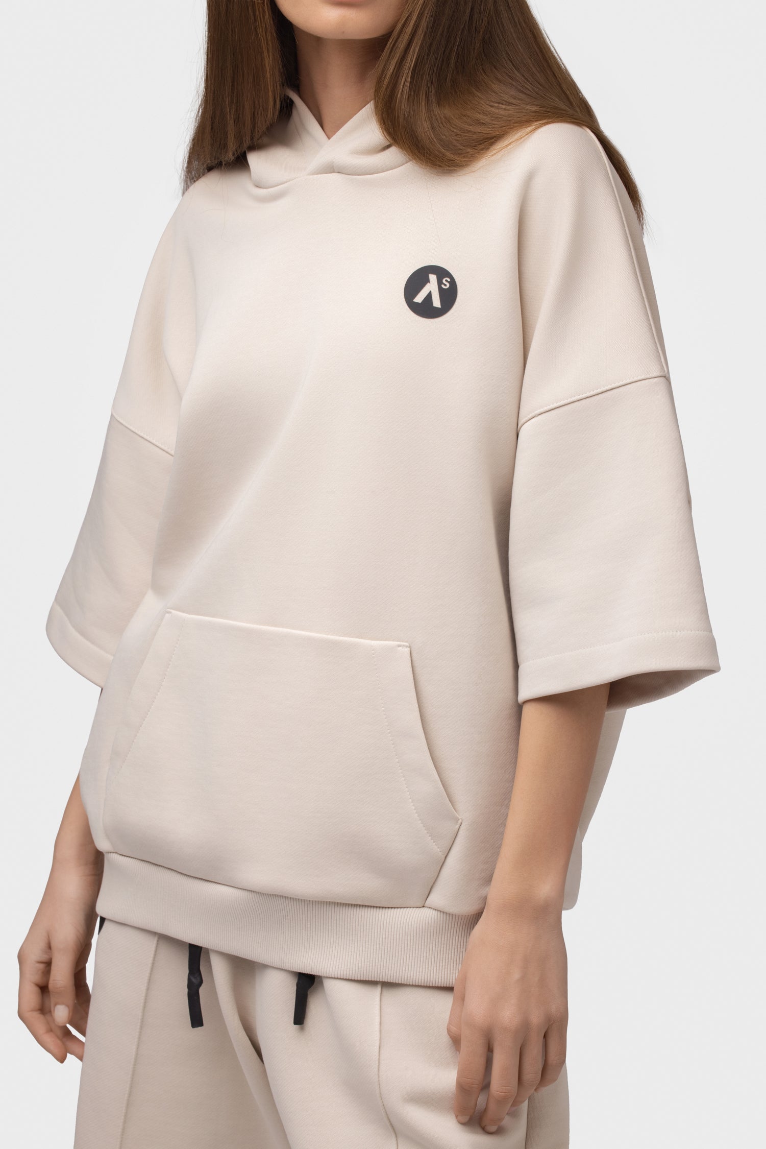 Laisvo silueto modelis su kapišonu ir nuleistomis rankovėmis iki alkūnių. Priekyje – kengūros tipo kišenė. Kairėje pusėje – juodas 3D logotipo dekoras.