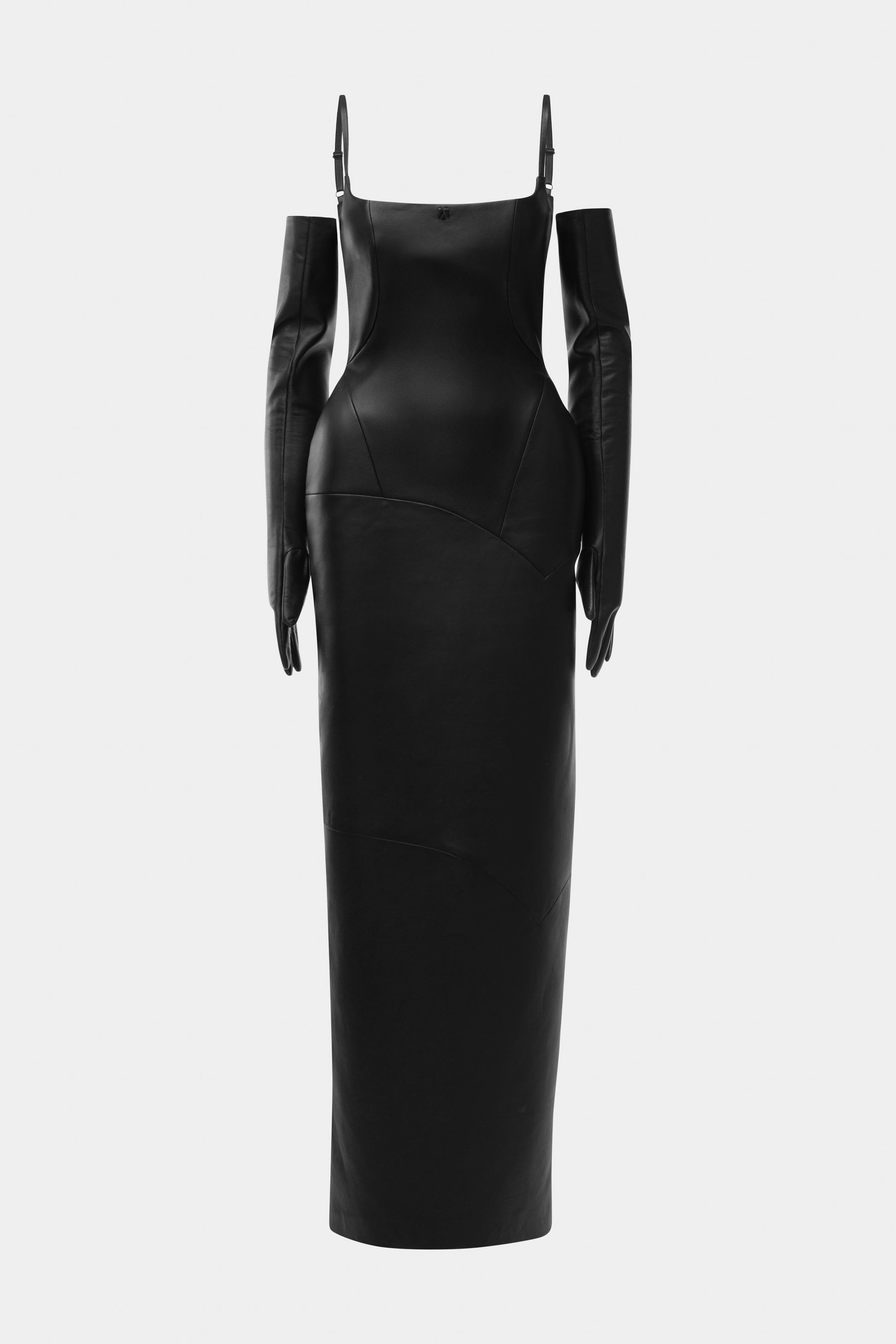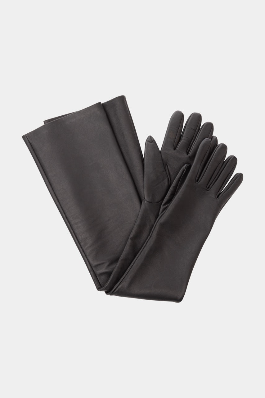 Juodos, Ilgos, iš natūralios odos pasiūtos pirštuotos pirštinės.