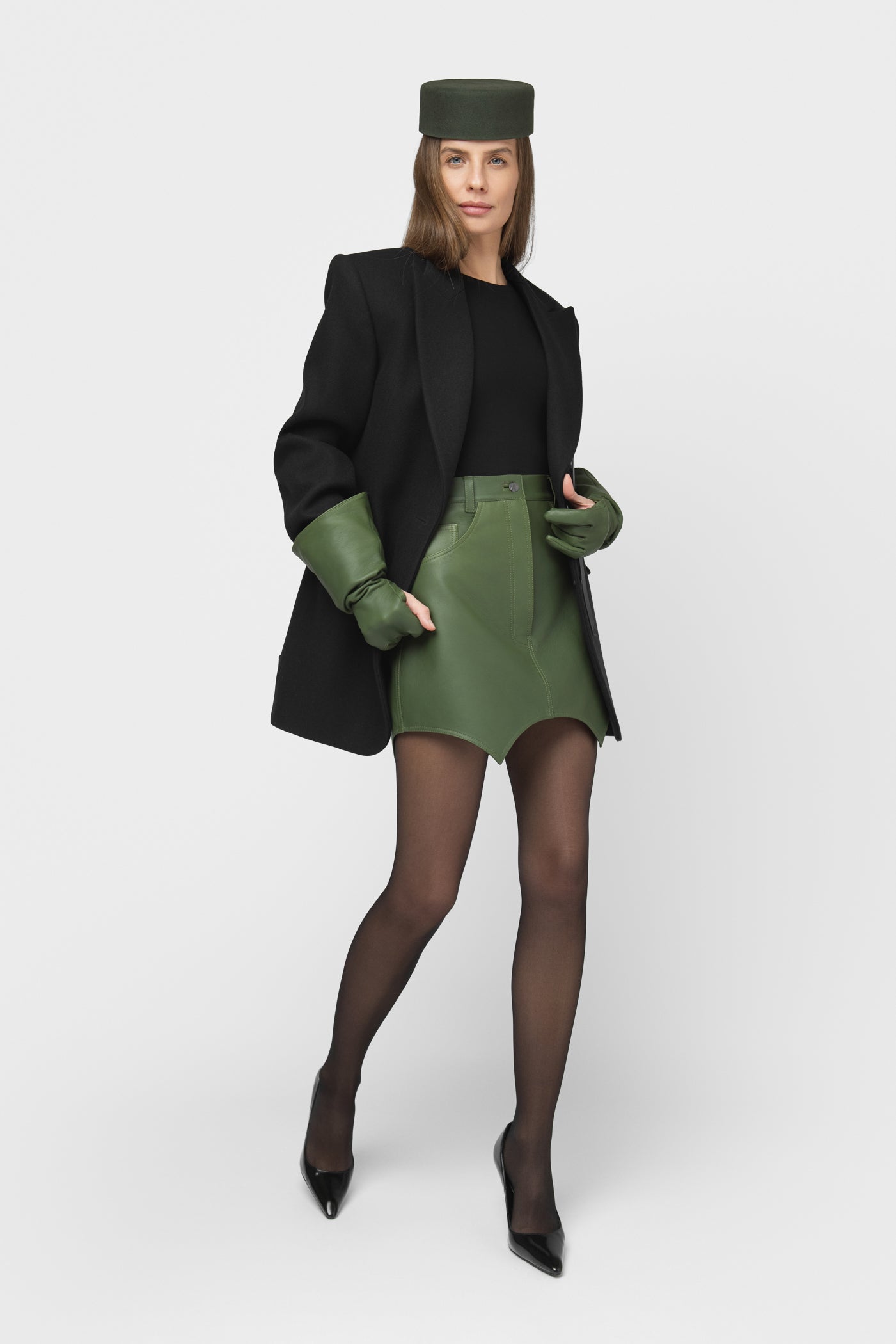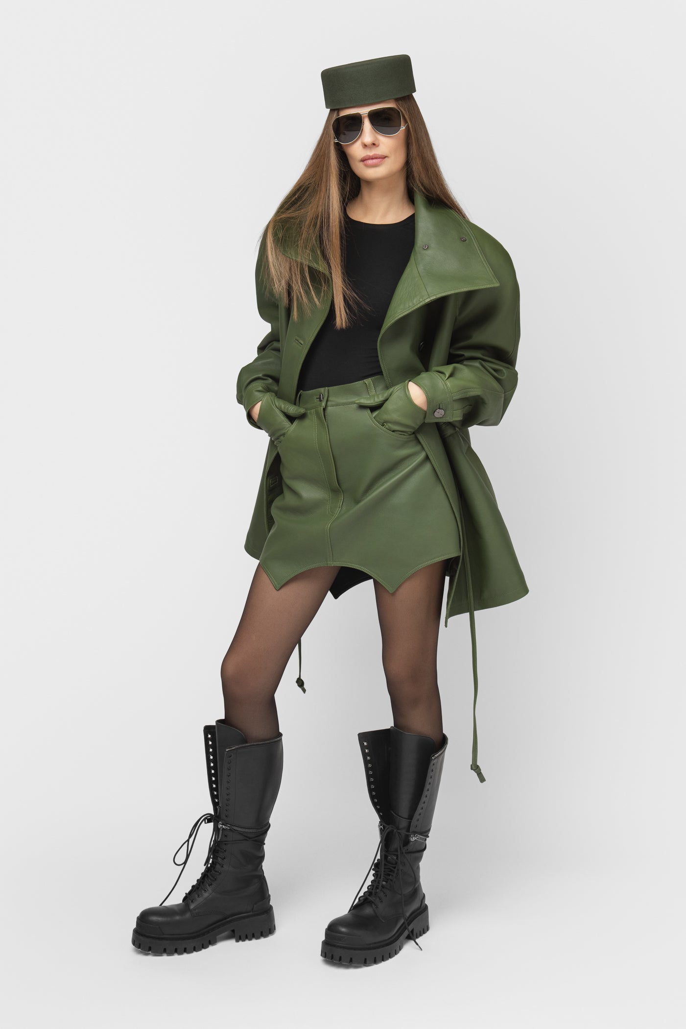 Elegantiškas ir modernus natūralios odos sijonas su aukštu juosmeniu ir išskirtiniu trikampio akcentu priekyje. Sijonas turi užtrauktuką priekyje, kilpas diržui, taip pat šonuose dvi kišenes ir gale su vardinėmis sagutėmis. Dekoruotas natūralios odos detale. Pamušalas suteikia komfortą, o audinys, pagamintas Lietuvoje, puikiai laiko formą ir išsiskiria aukšta kokybe. Tinka tiek kasdieniam, tiek elegantiškesniam įvaizdžiui.