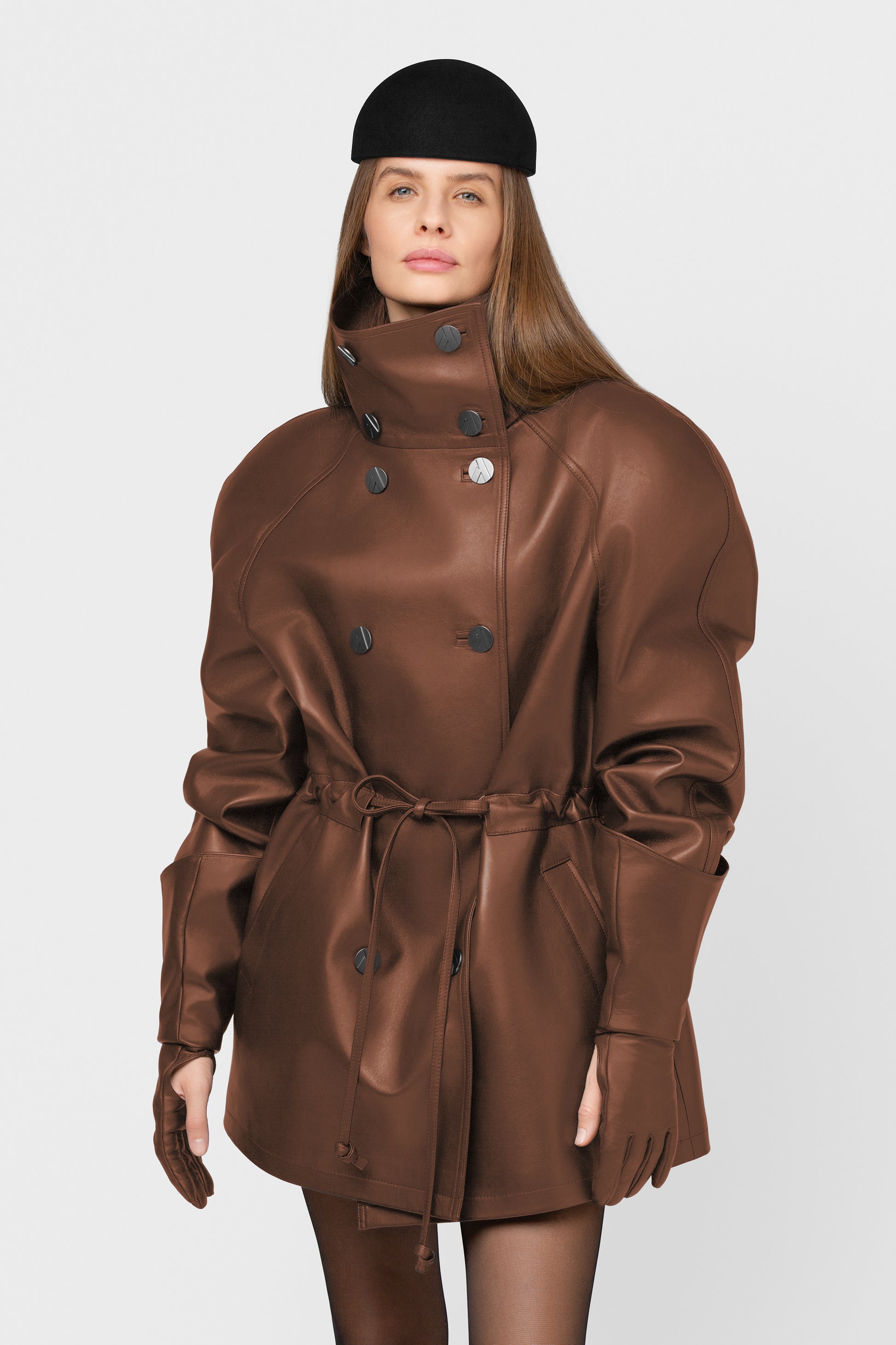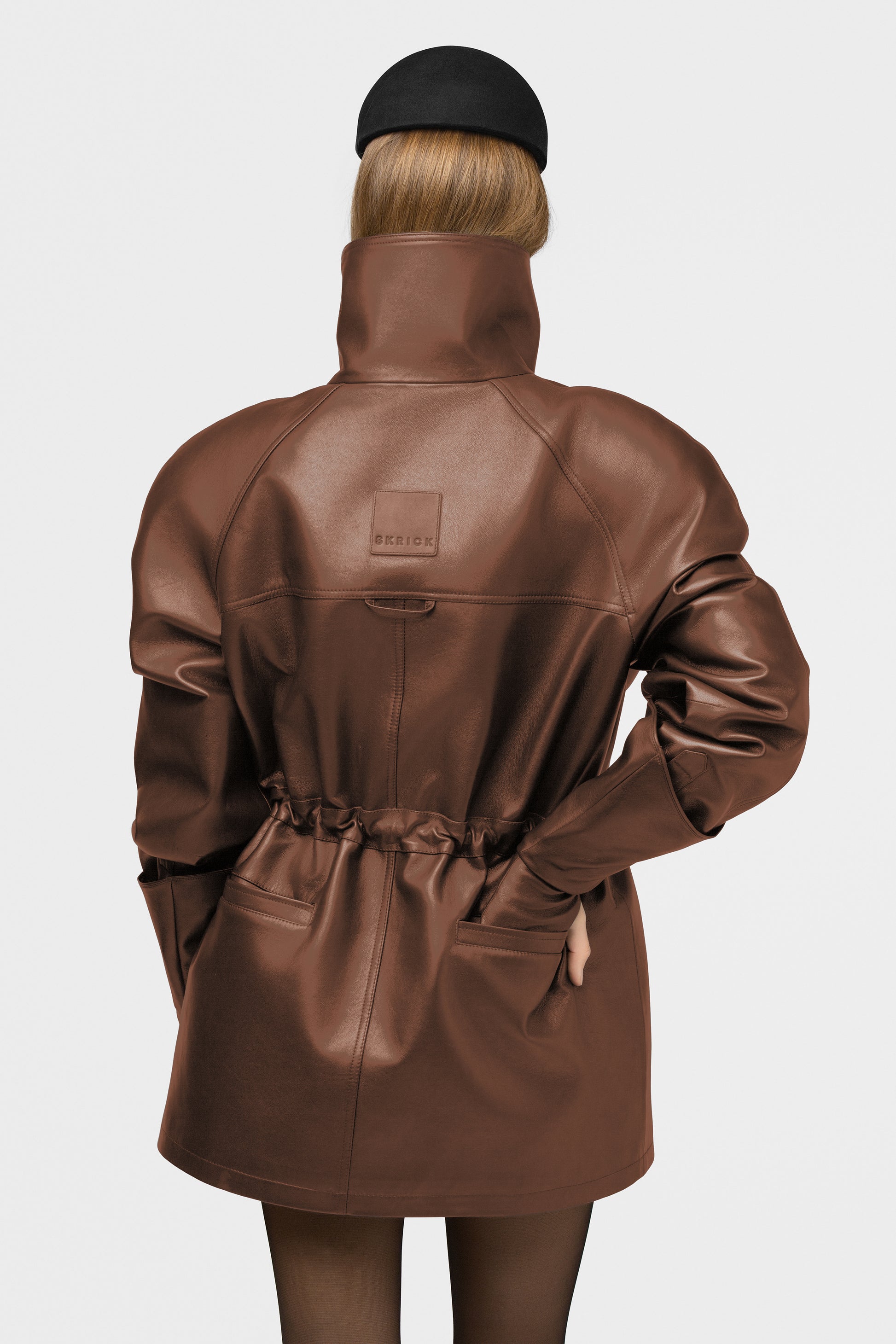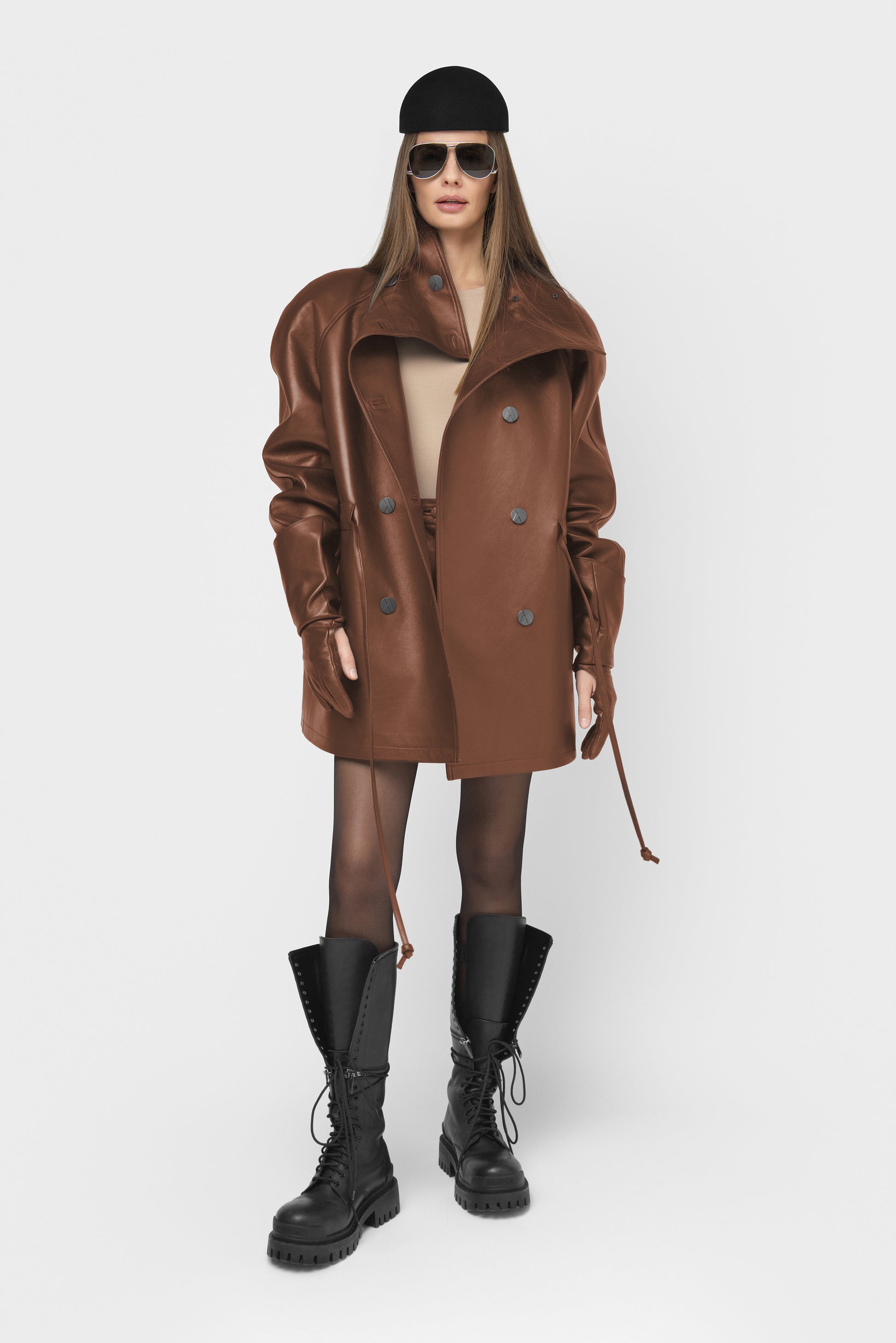 Moderni ir struktūruota pašiltinta striukė, pasiūta iš aukštos kokybės natūralios itališkos odos. Kaštono spalvos modelis su dvigubu užsegimu, aukšta apykakle ir dekoratyvinėmis vardinėmis sagomis. Vidus pašiltintas komfortui vėsesniu oru, pamušale – subtiliai išsiuvinėtas logotipas, liudijantis išskirtinį dėmesį detalėms. Paslėpti raišteliai ir šoninės kišenės užbaigia švarų, modernų siluetą. FORMA – tai tvirtas miesto stiliaus pareiškimas kasdienai ir ypatingoms progoms.