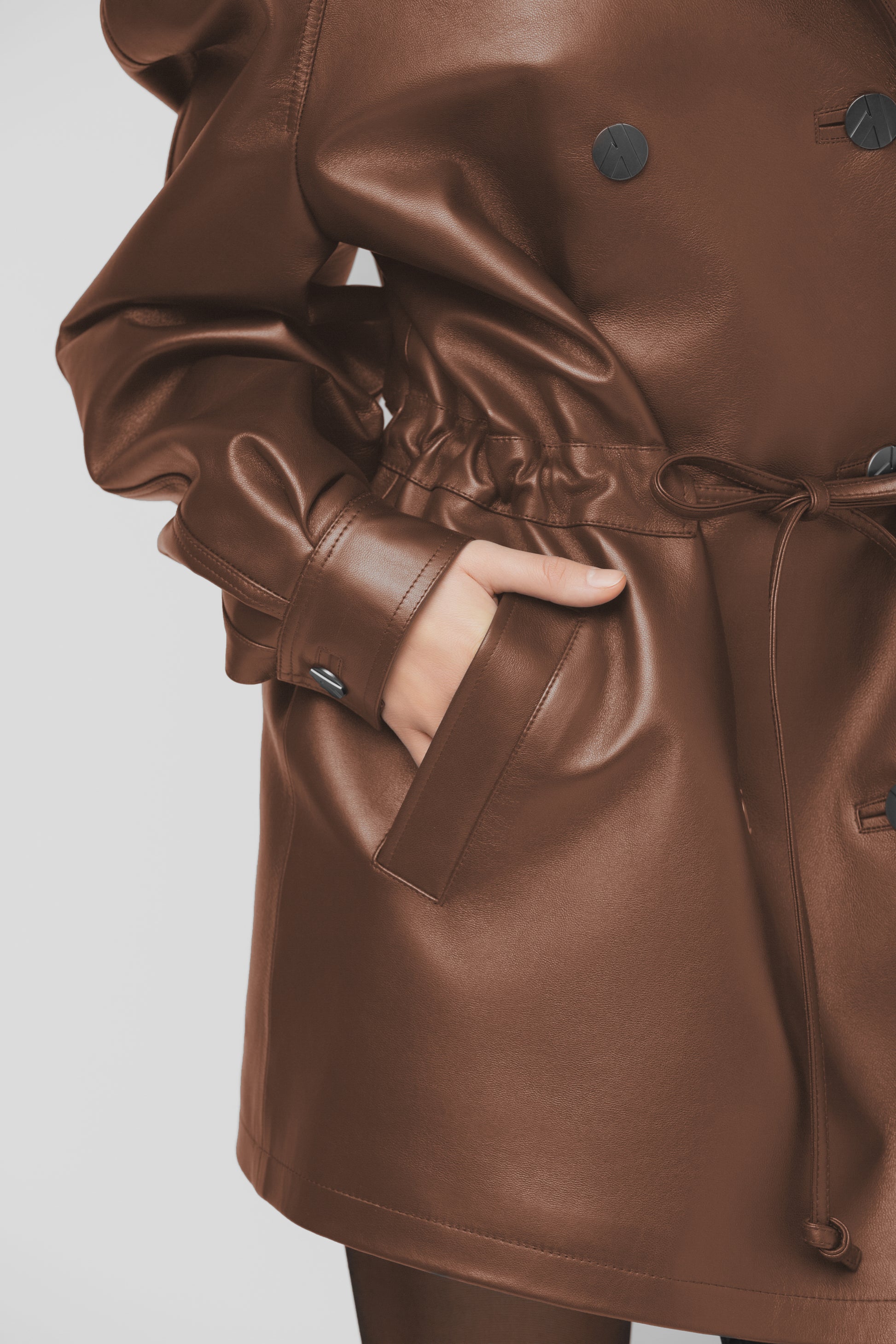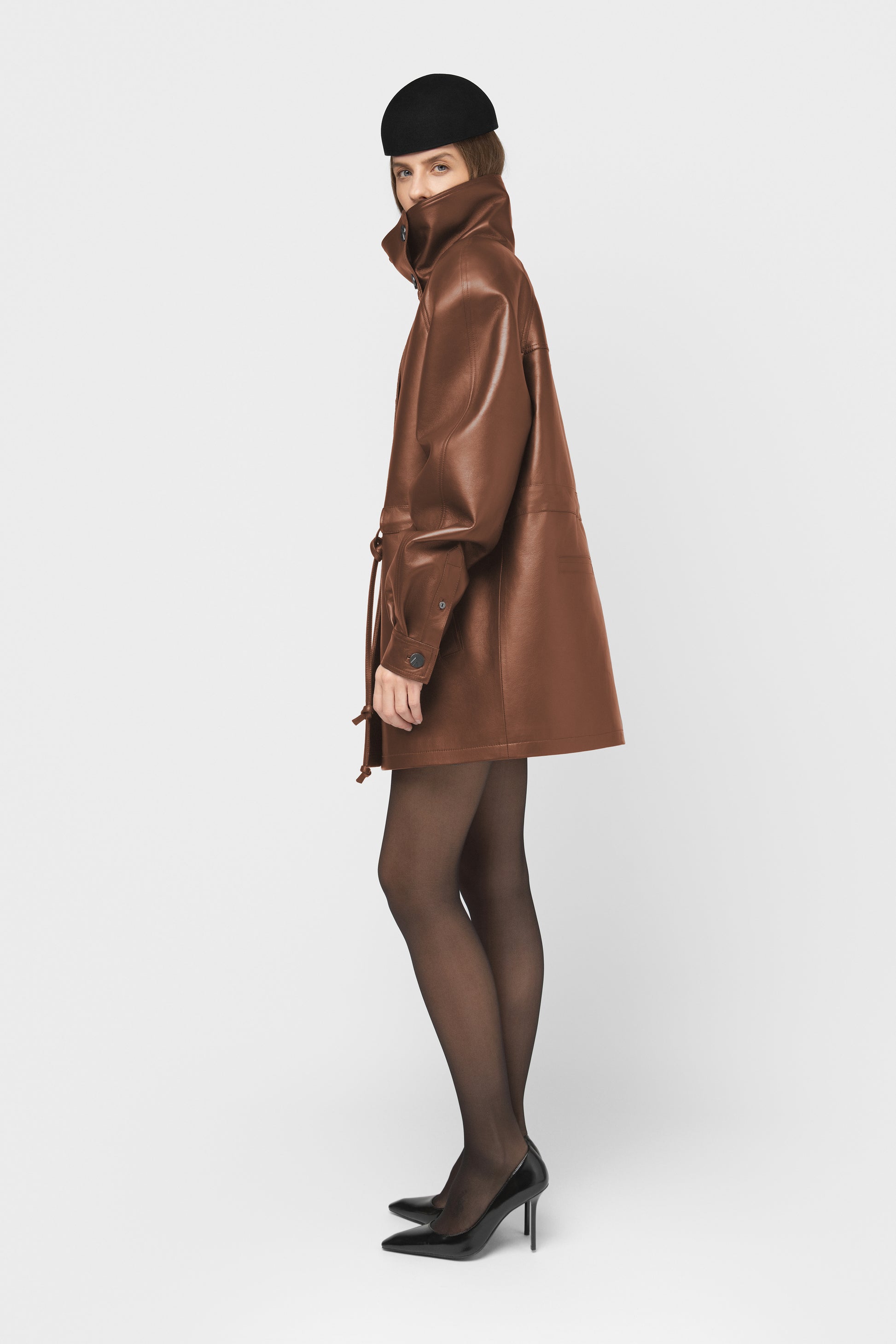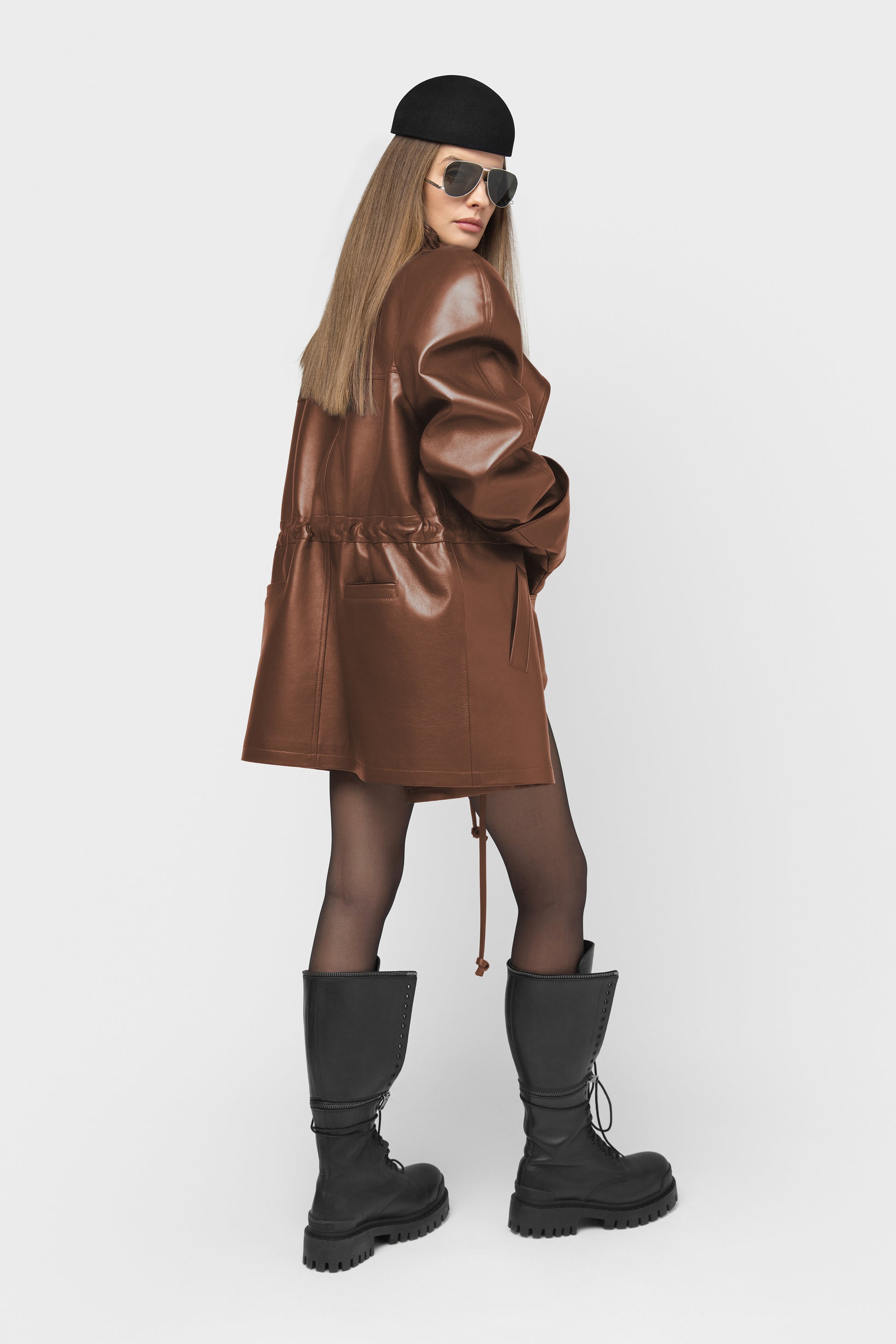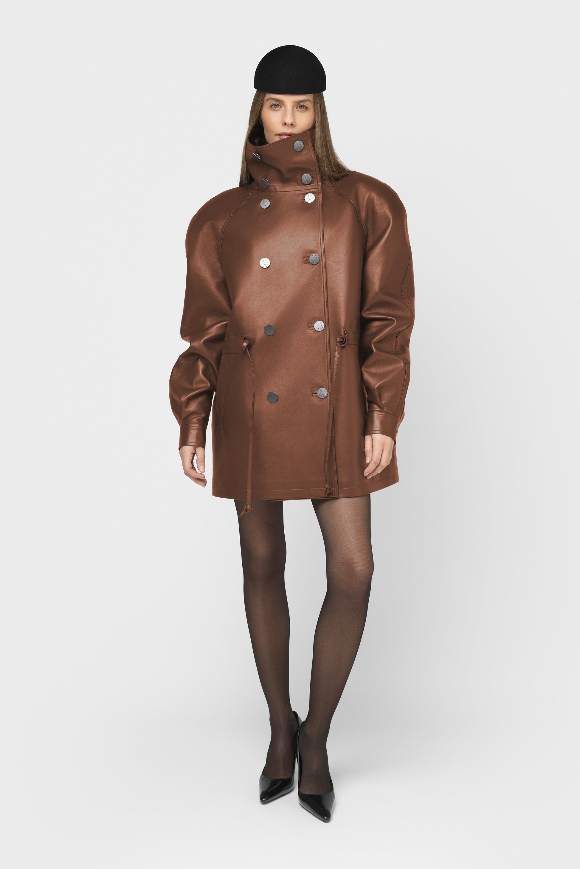 Moderni ir struktūruota pašiltinta striukė, pasiūta iš aukštos kokybės natūralios itališkos odos. Kaštono spalvos modelis su dvigubu užsegimu, aukšta apykakle ir dekoratyvinėmis vardinėmis sagomis. Vidus pašiltintas komfortui vėsesniu oru, pamušale – subtiliai išsiuvinėtas logotipas, liudijantis išskirtinį dėmesį detalėms. Paslėpti raišteliai ir šoninės kišenės užbaigia švarų, modernų siluetą. FORMA – tai tvirtas miesto stiliaus pareiškimas kasdienai ir ypatingoms progoms.