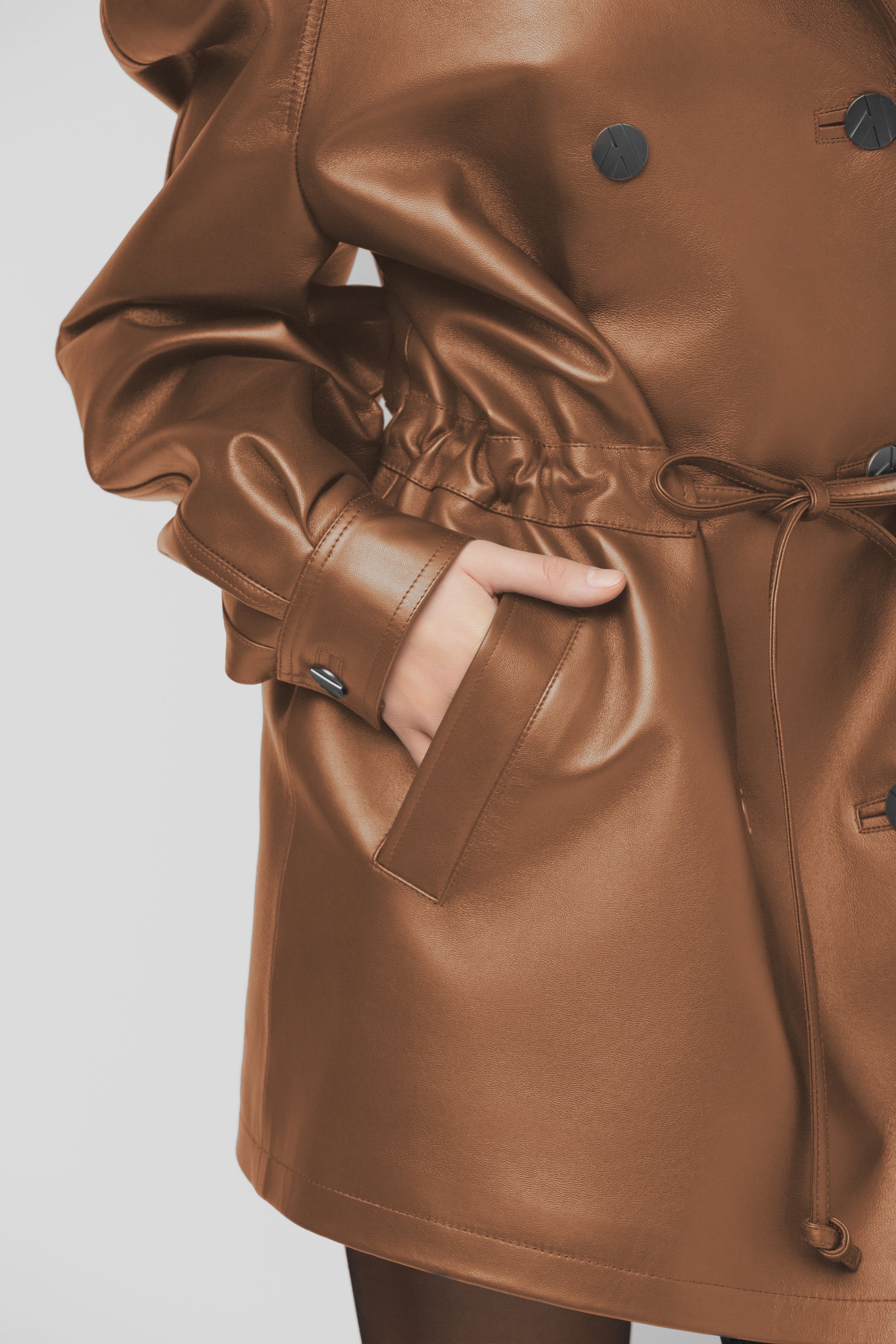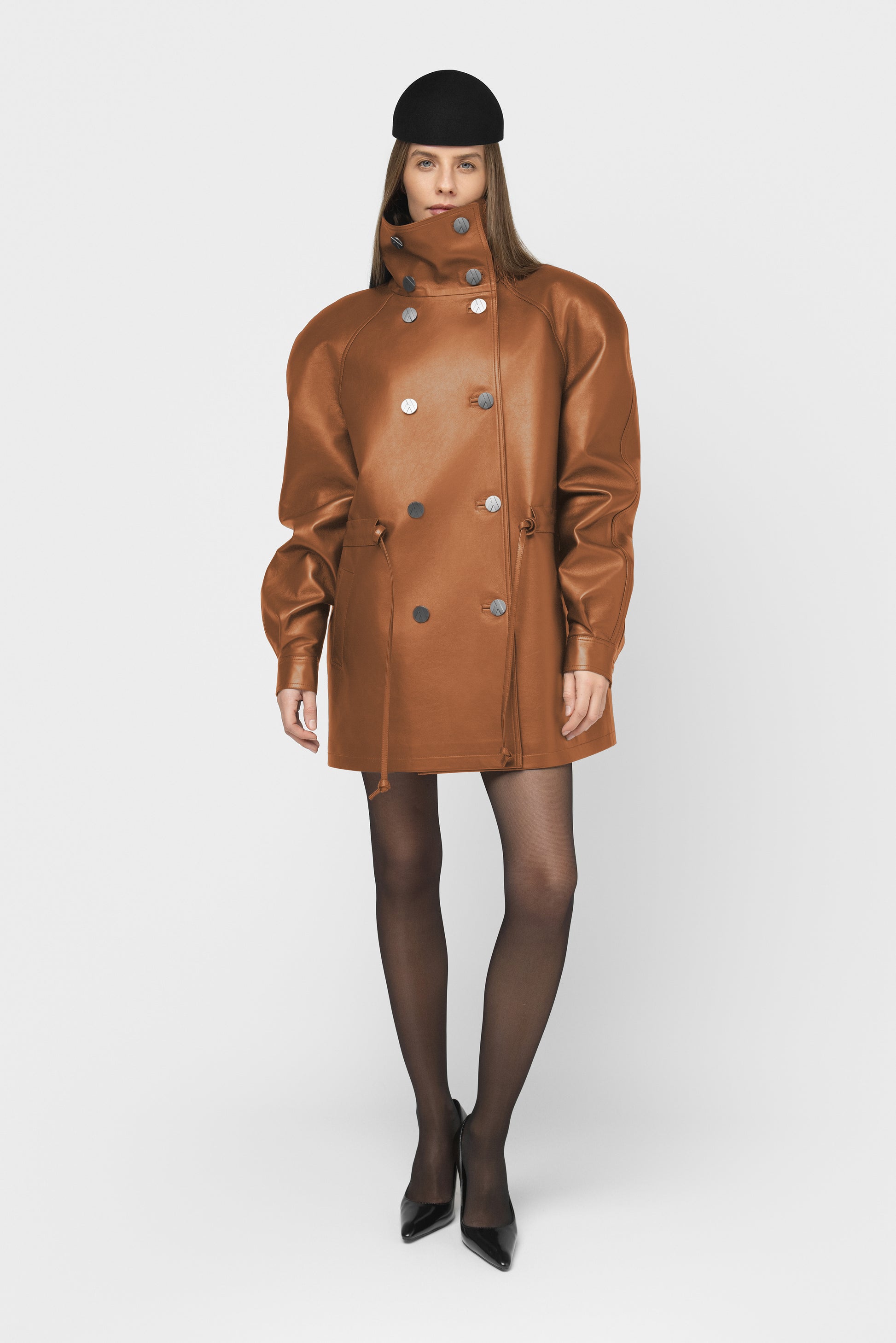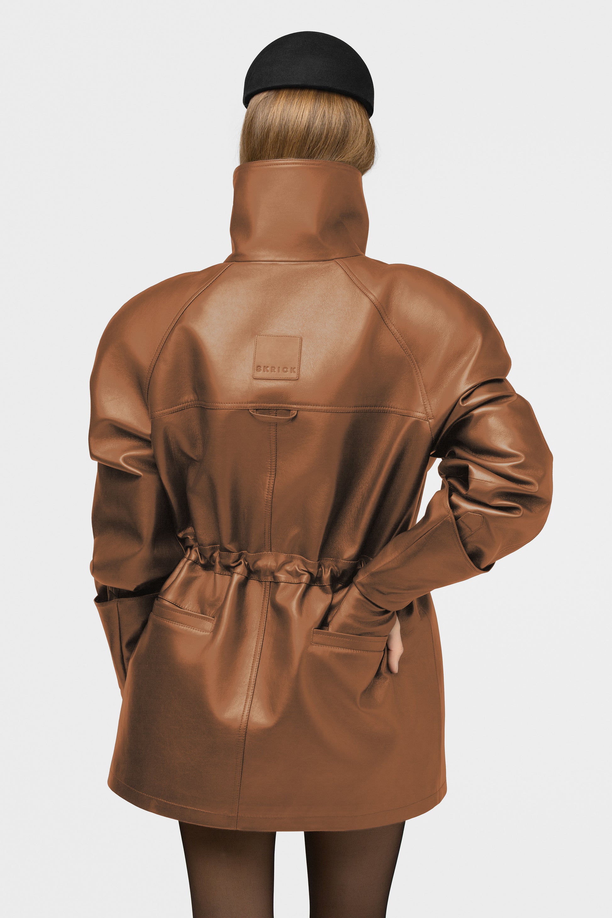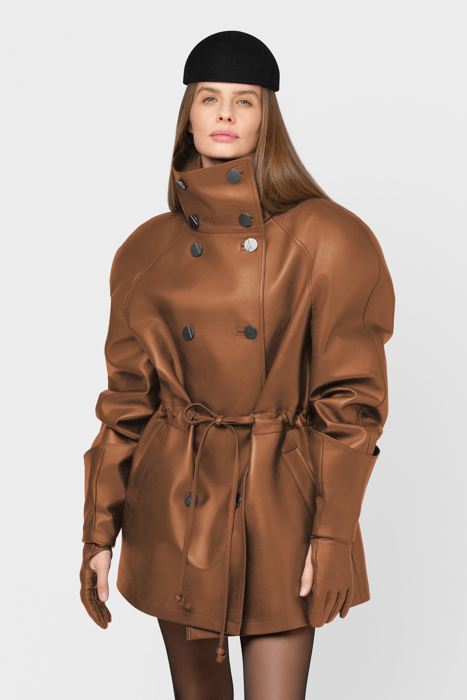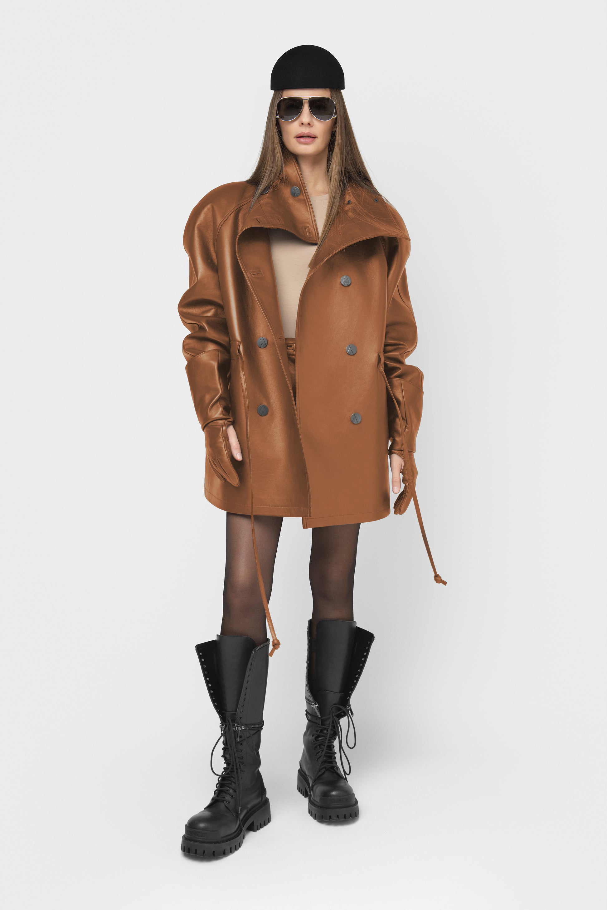 Moderni ir struktūruota pašiltinta striukė, pasiūta iš aukštos kokybės natūralios itališkos odos. Konjako spalvos modelis su dvigubu užsegimu, aukšta apykakle ir dekoratyvinėmis vardinėmis sagomis. Vidus pašiltintas komfortui vėsesniu oru, pamušale – subtiliai išsiuvinėtas logotipas, liudijantis išskirtinį dėmesį detalėms. Paslėpti raišteliai ir šoninės kišenės užbaigia švarų, modernų siluetą. FORMA – tai tvirtas miesto stiliaus pareiškimas kasdienai ir ypatingoms progoms.