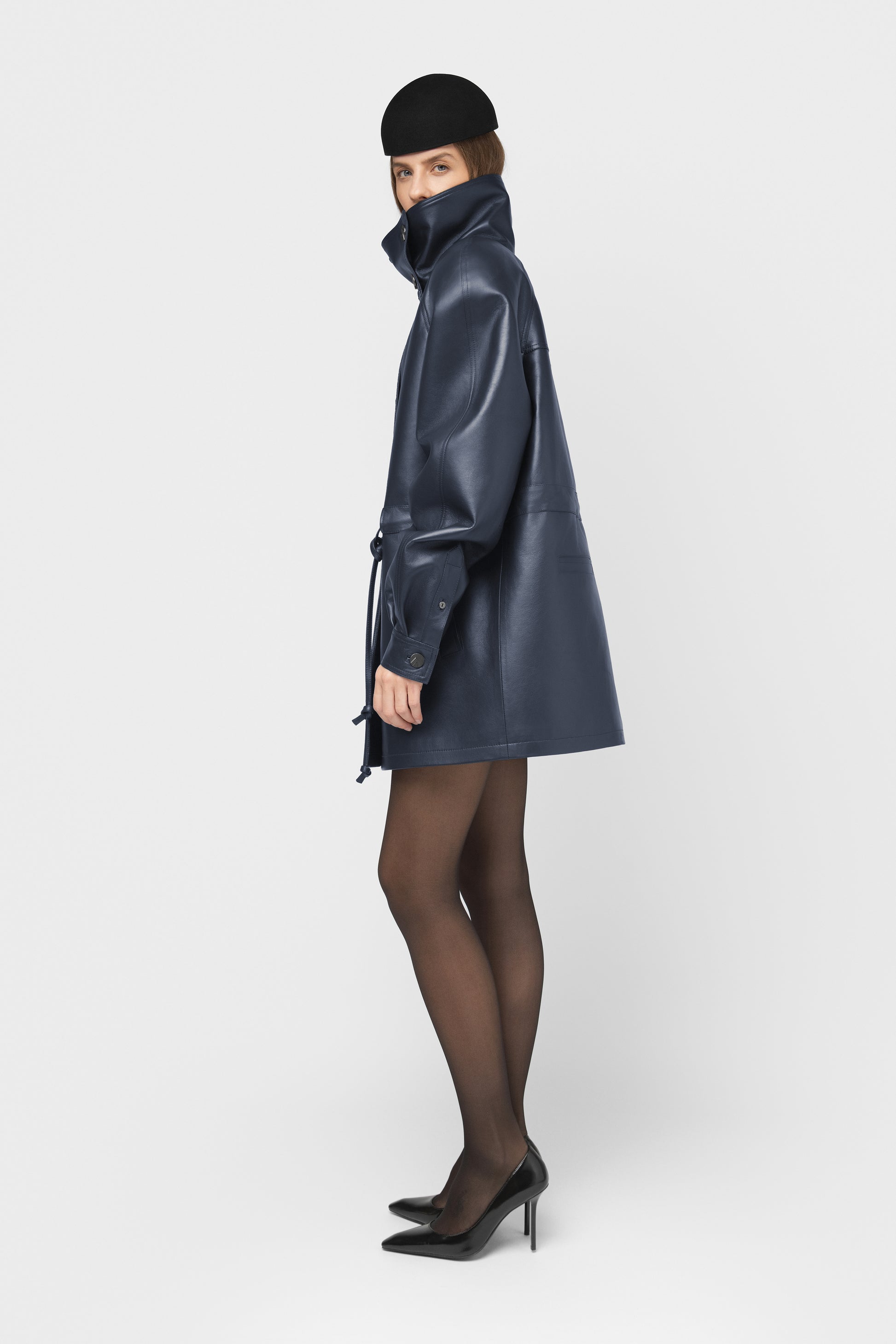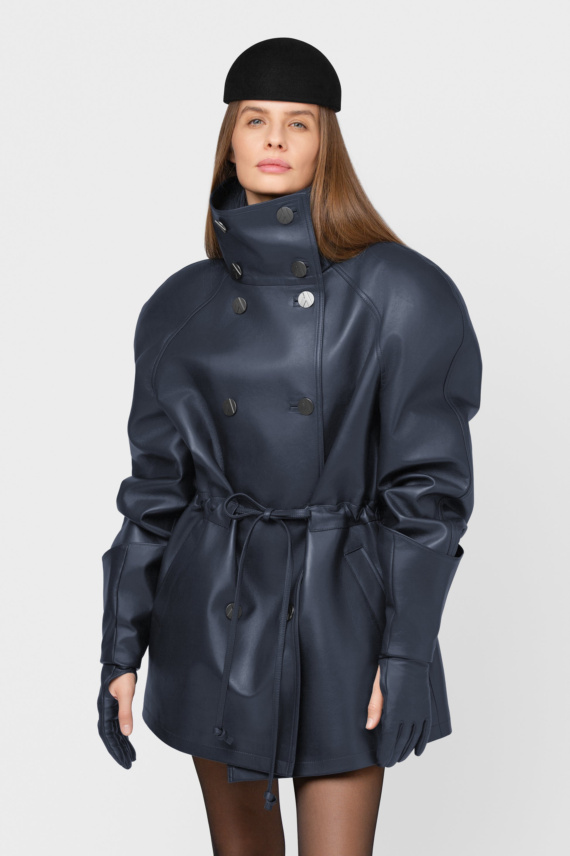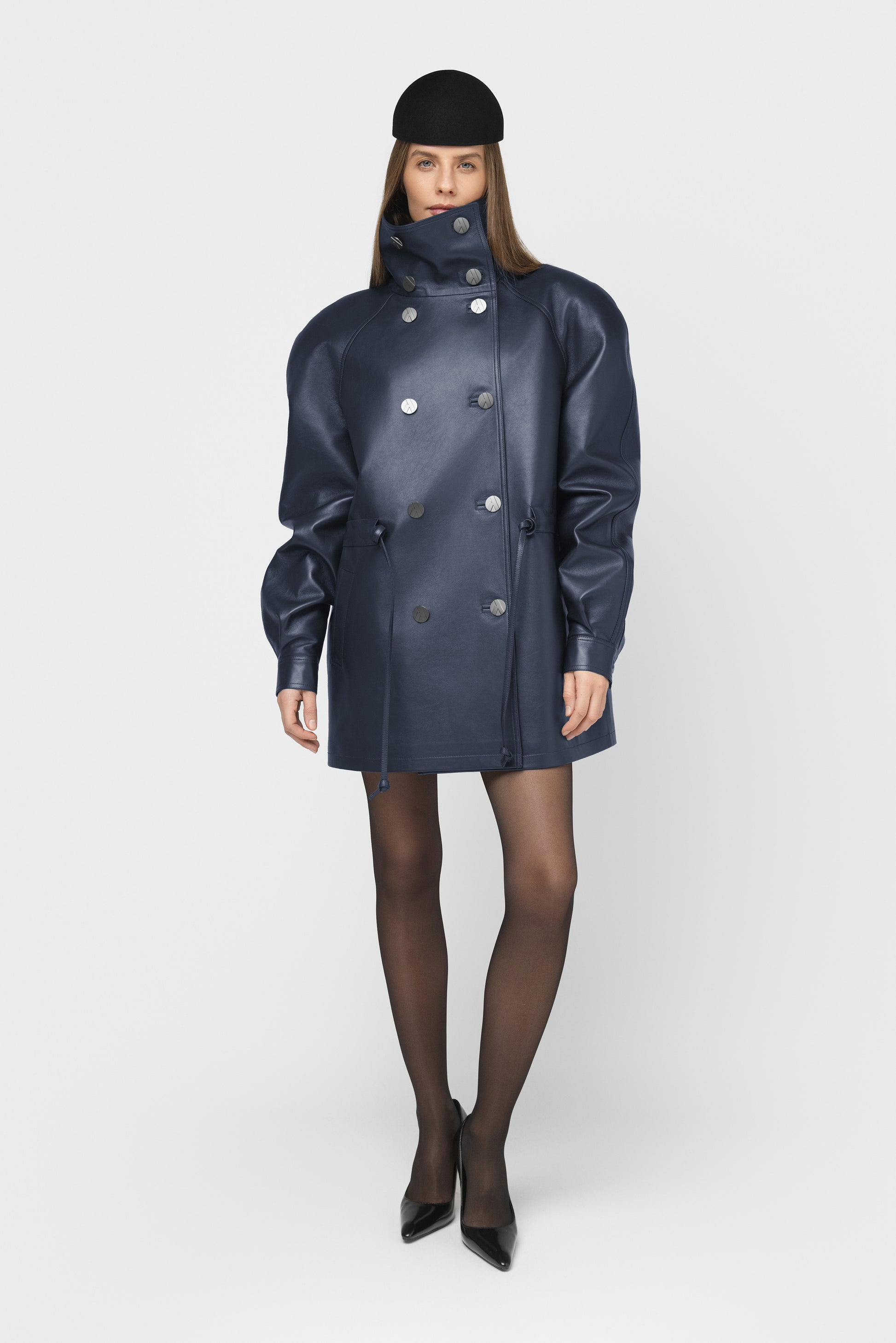 Moderni ir struktūruota pašiltinta striukė, pasiūta iš aukštos kokybės natūralios itališkos odos. Mėlynos spalvos modelis su dvigubu užsegimu, aukšta apykakle ir dekoratyvinėmis vardinėmis sagomis. Vidus pašiltintas komfortui vėsesniu oru, pamušale – subtiliai išsiuvinėtas logotipas, liudijantis išskirtinį dėmesį detalėms. Paslėpti raišteliai ir šoninės kišenės užbaigia švarų, modernų siluetą. FORMA – tai tvirtas miesto stiliaus pareiškimas kasdienai ir ypatingoms progoms.