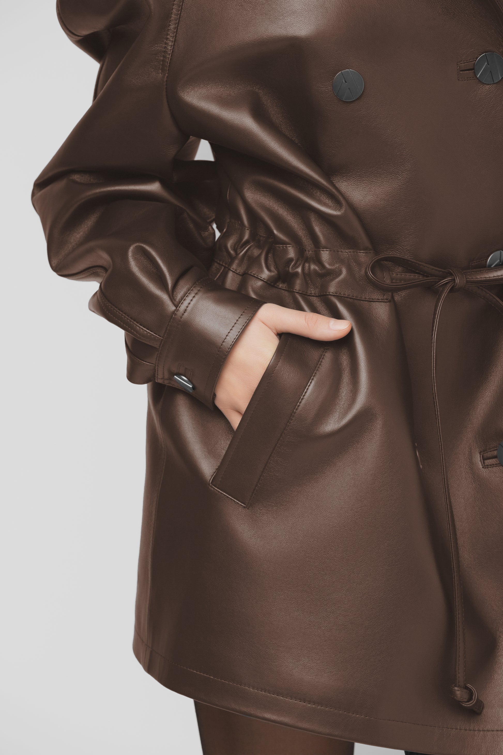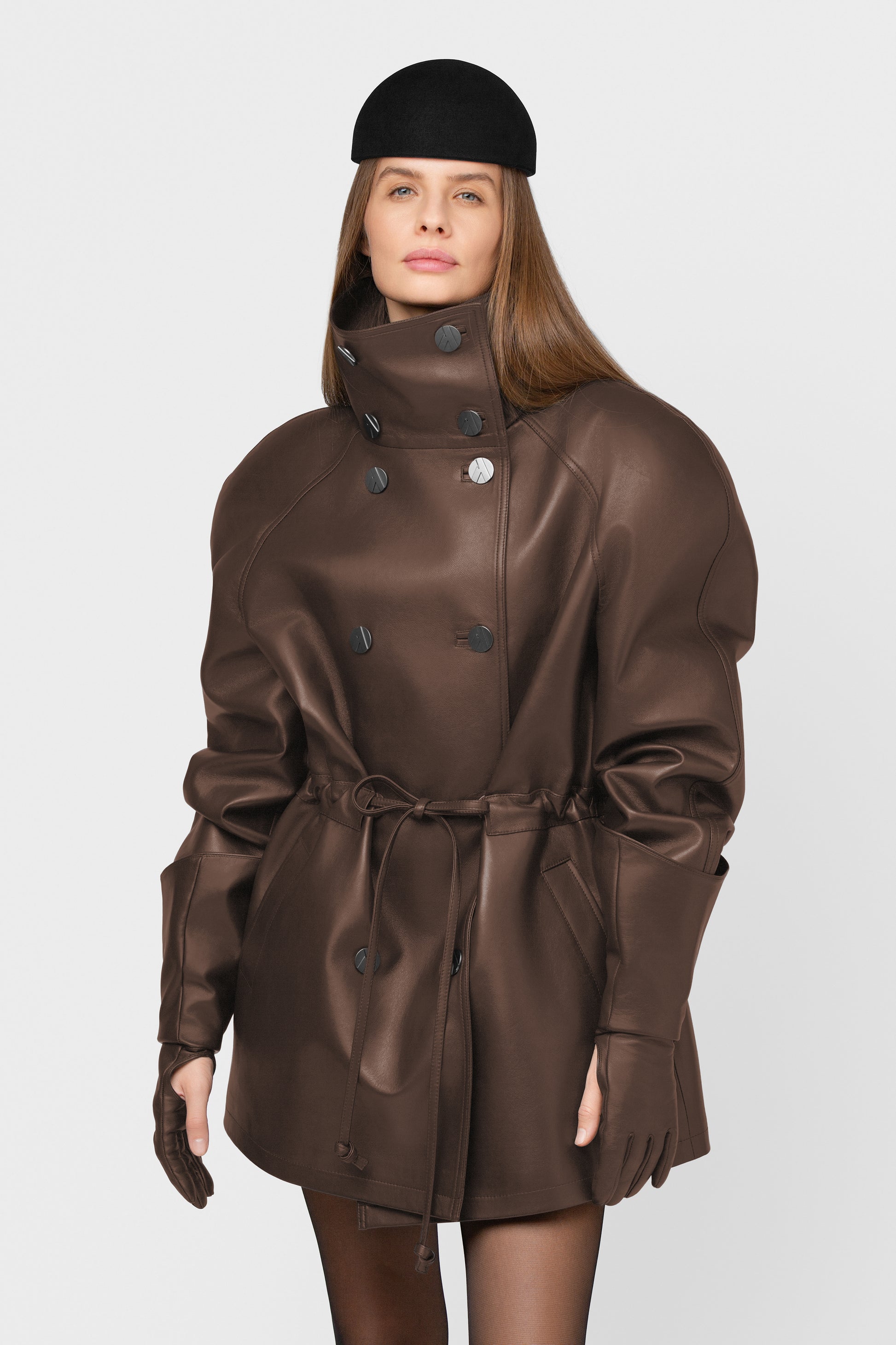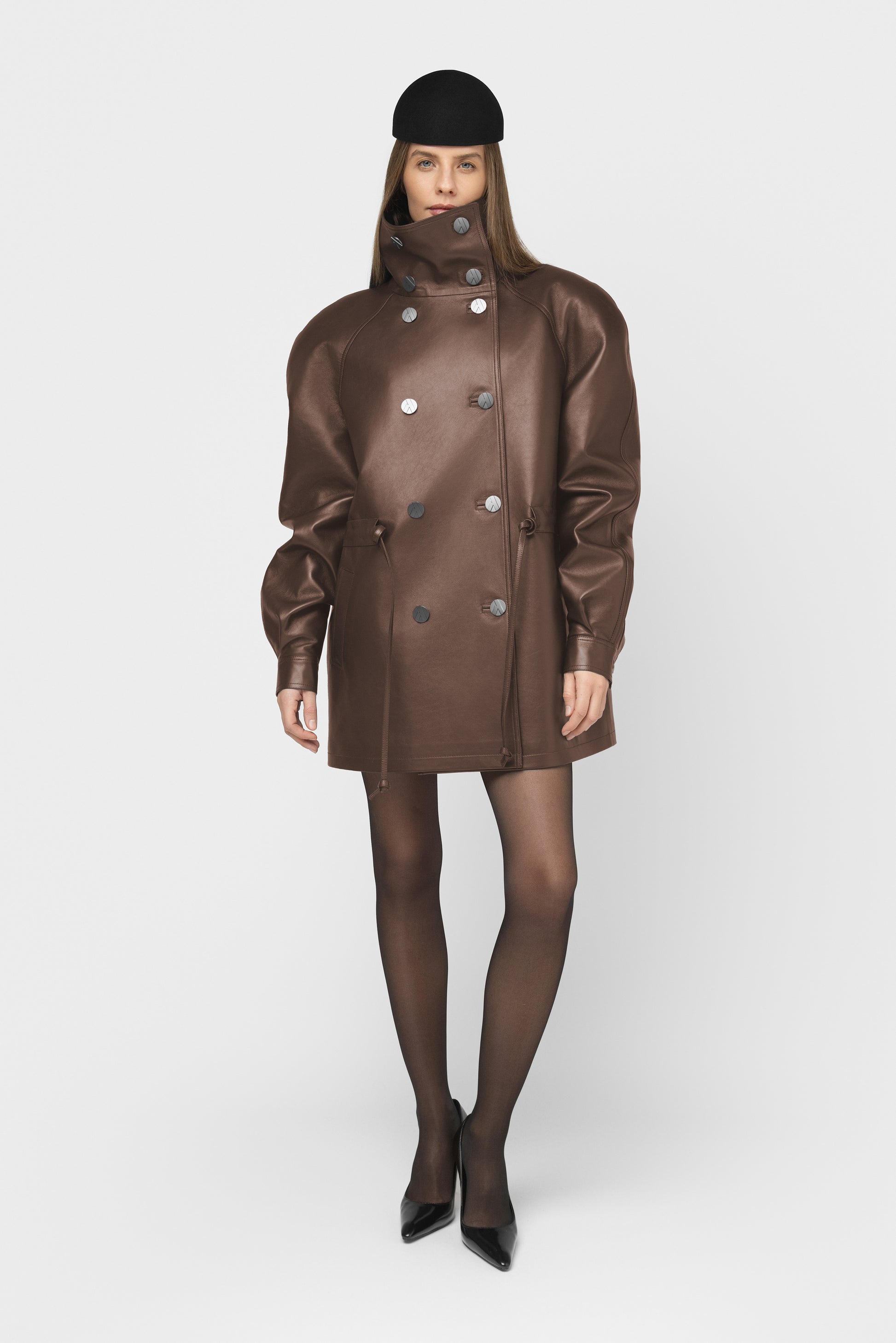 Moderni ir struktūruota pašiltinta striukė, pasiūta iš aukštos kokybės natūralios itališkos odos. Rudos spalvos modelis su dvigubu užsegimu, aukšta apykakle ir dekoratyvinėmis vardinėmis sagomis. Vidus pašiltintas komfortui vėsesniu oru, pamušale – subtiliai išsiuvinėtas logotipas, liudijantis išskirtinį dėmesį detalėms. Paslėpti raišteliai ir šoninės kišenės užbaigia švarų, modernų siluetą. FORMA – tai tvirtas miesto stiliaus pareiškimas kasdienai ir ypatingoms progoms.