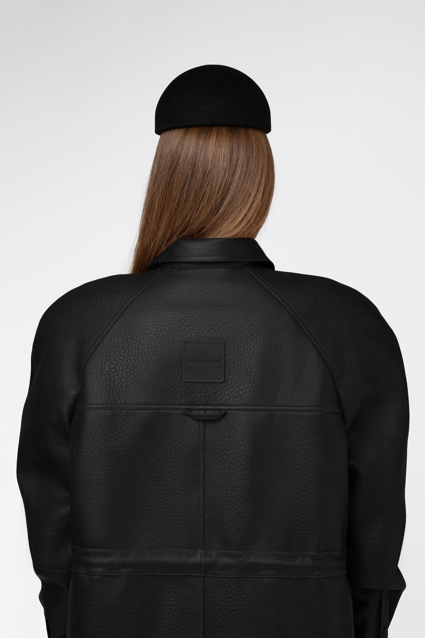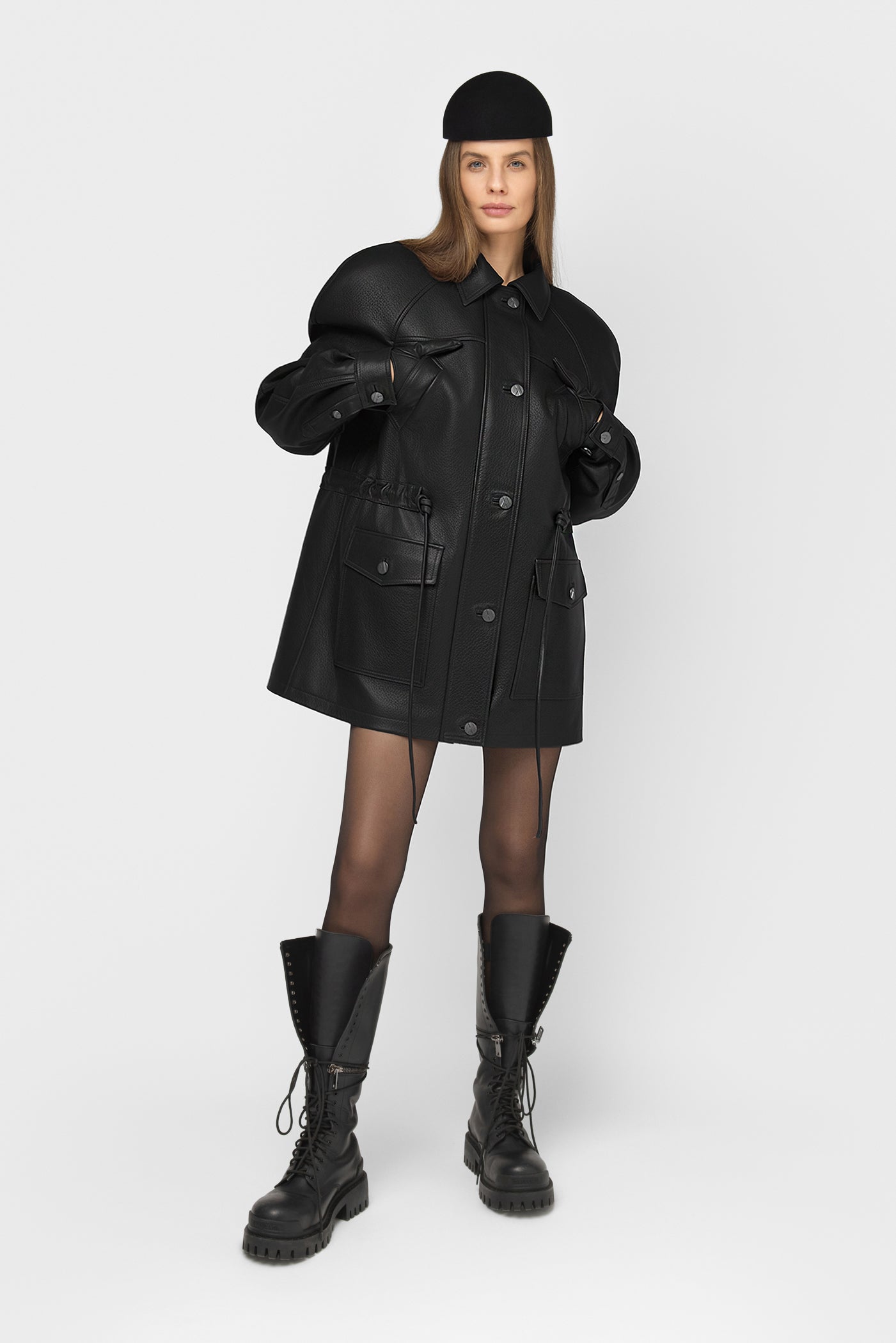 Moderni, struktūruota ir šiuolaikiška striukė, pasiūta iš natūralios odos. Juodos spalvos modelis su vienborčiu – paslėptu užsegimu, kuris sukuria švarų, estetišką vaizdą. Baltininė apykaklė ir dekoratyvinės vardinės metalinės sagos subtiliai pabrėžia išskirtinį modelio charakterį.