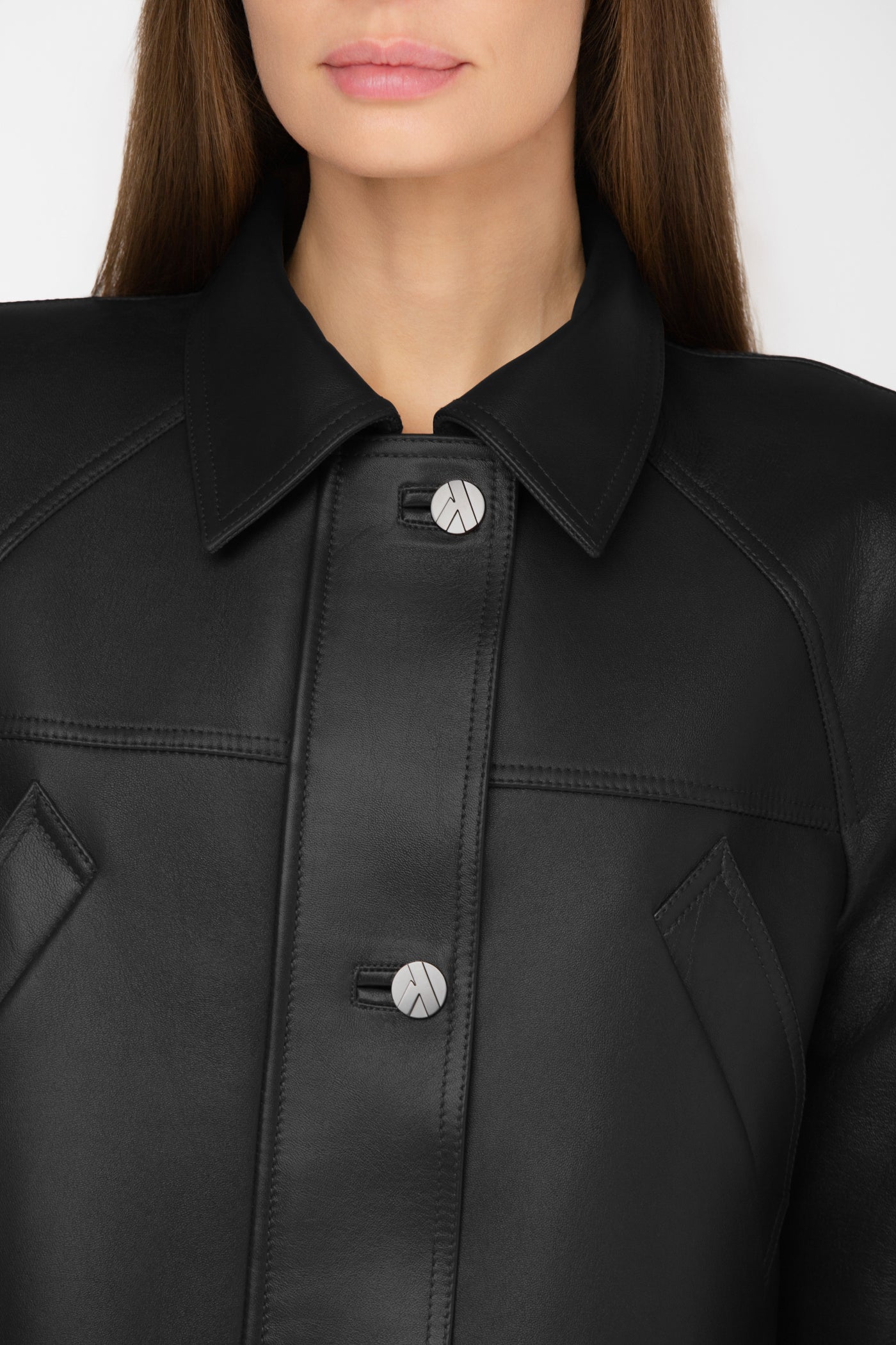 Moderni, struktūruota ir šiuolaikiška striukė, pasiūta iš natūralios odos. Juodos spalvos (oda lygi), modelis su vienborčiu – paslėptu užsegimu, kuris sukuria švarų, estetišką vaizdą. Baltininė apykaklė ir dekoratyvinės vardinės metalinės sagos subtiliai pabrėžia išskirtinį modelio charakterį.