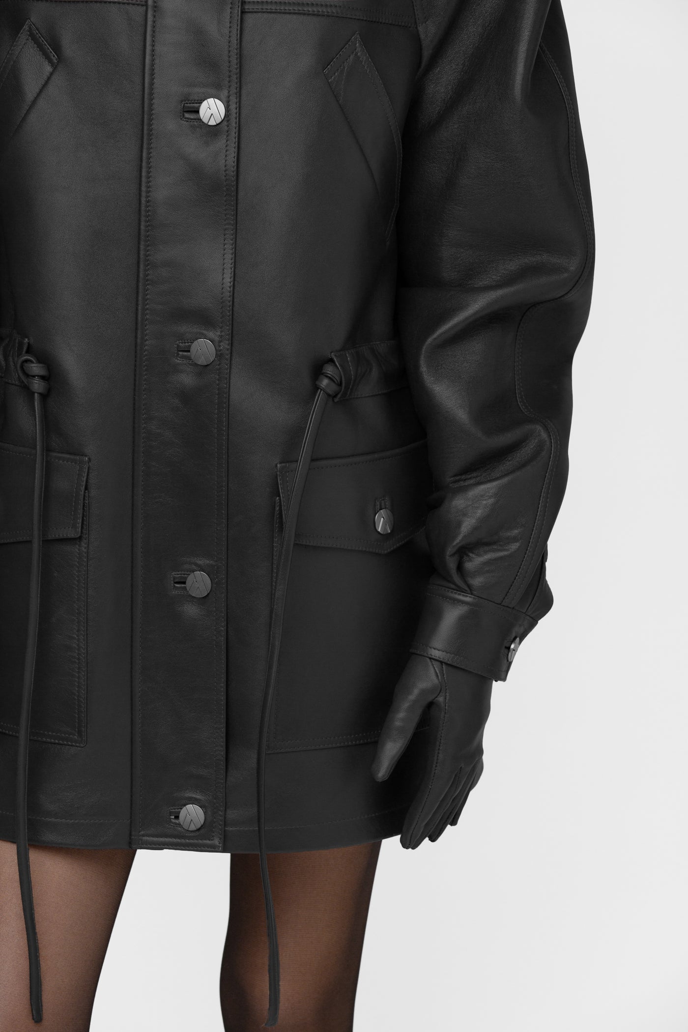 Striukės vidus su pamušalu, ant kurio subtiliai išsiuvinėtas logotipas – išskirtinio dėmesio detalėms ženklas. Paslėpti juosmens raišteliai leidžia reguliuoti siluetą, priekyje – dvi kišenės su listelėmis ir dvi uždėtinės kišenės su antkišeniais.
