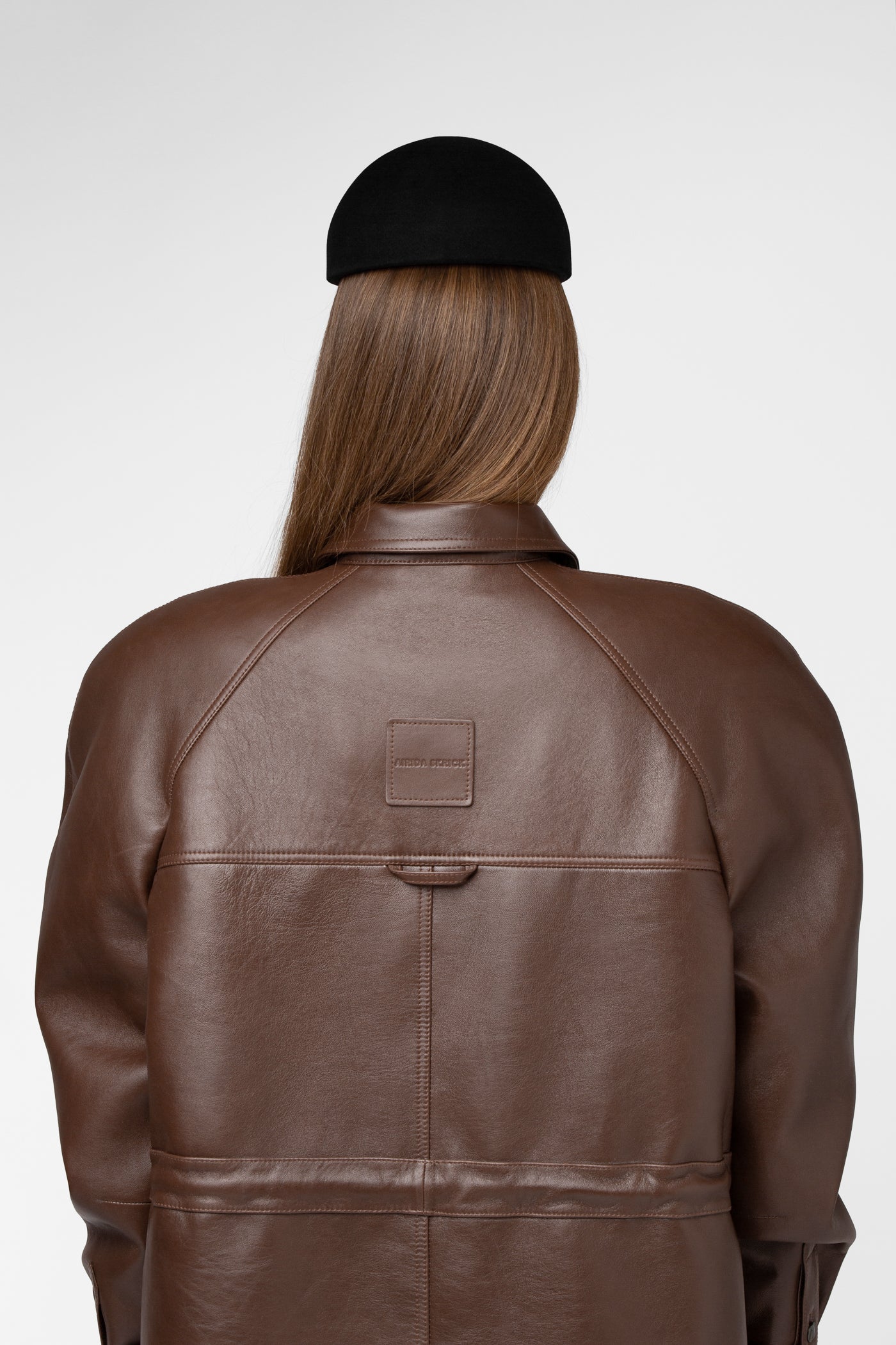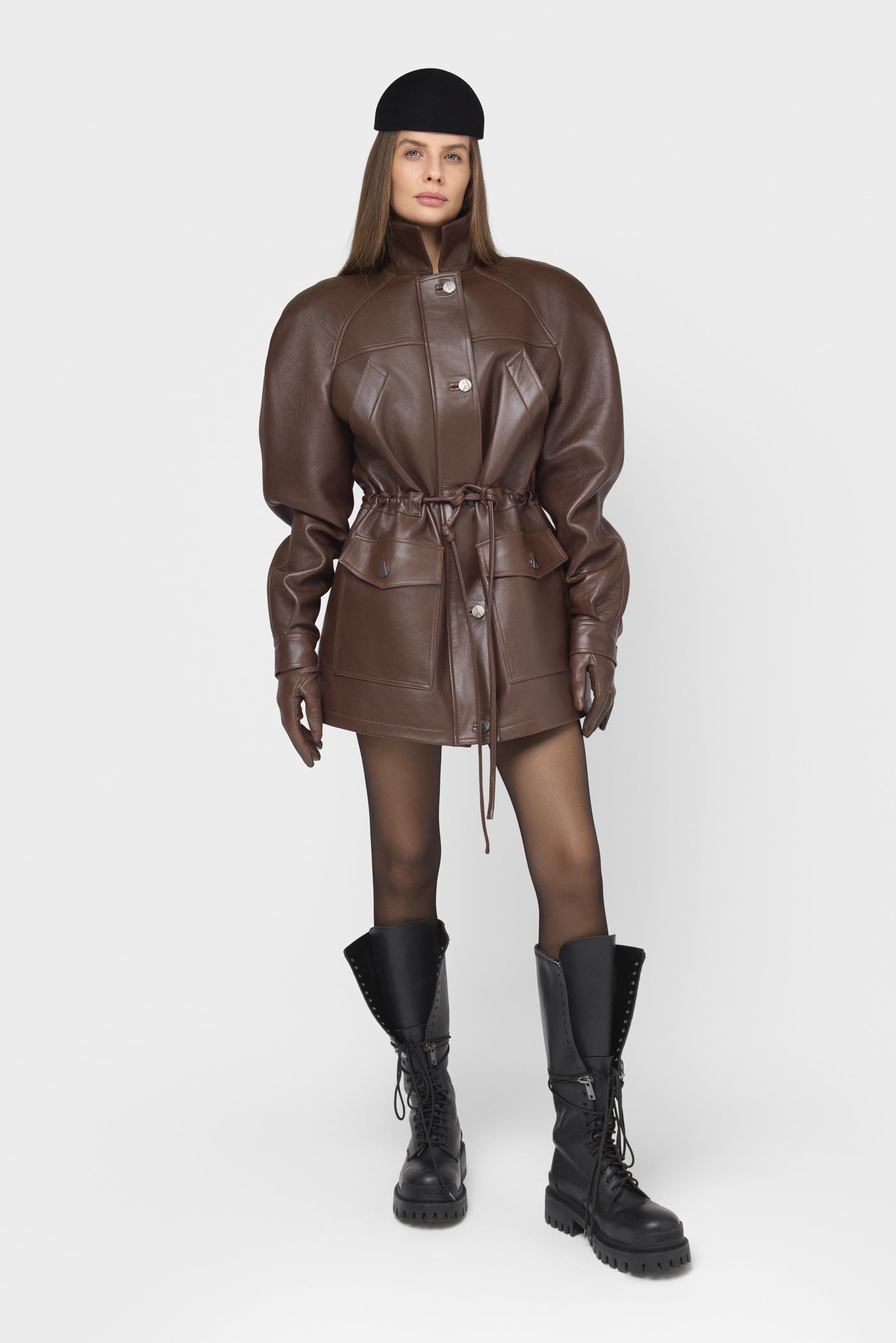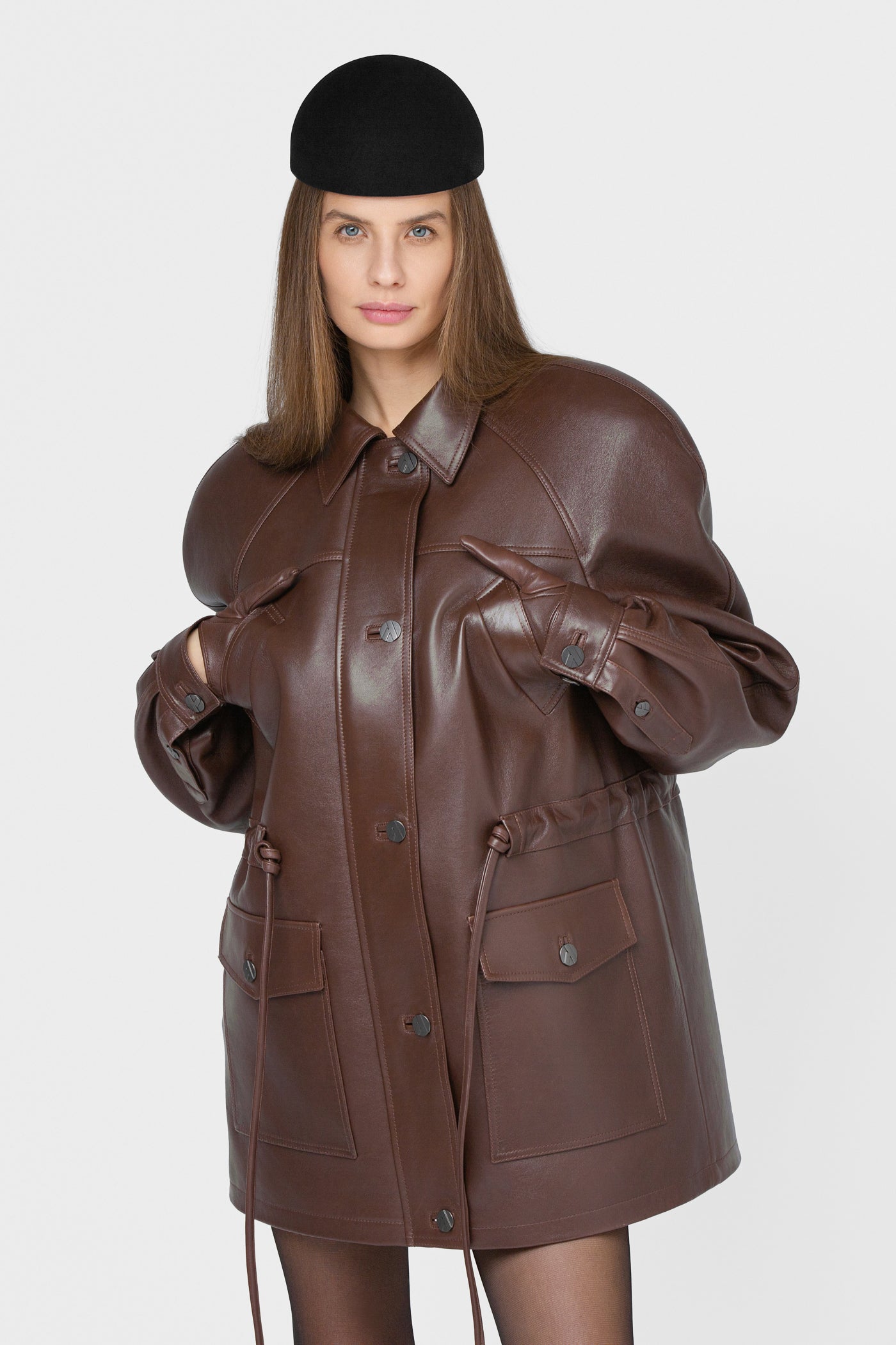 Moderni, struktūruota ir šiuolaikiška striukė, pasiūta iš natūralios odos. Rudos spalvos modelis su vienborčiu – paslėptu užsegimu, kuris sukuria švarų, estetišką vaizdą. Baltininė apykaklė ir dekoratyvinės vardinės metalinės sagos subtiliai pabrėžia išskirtinį modelio charakterį.
