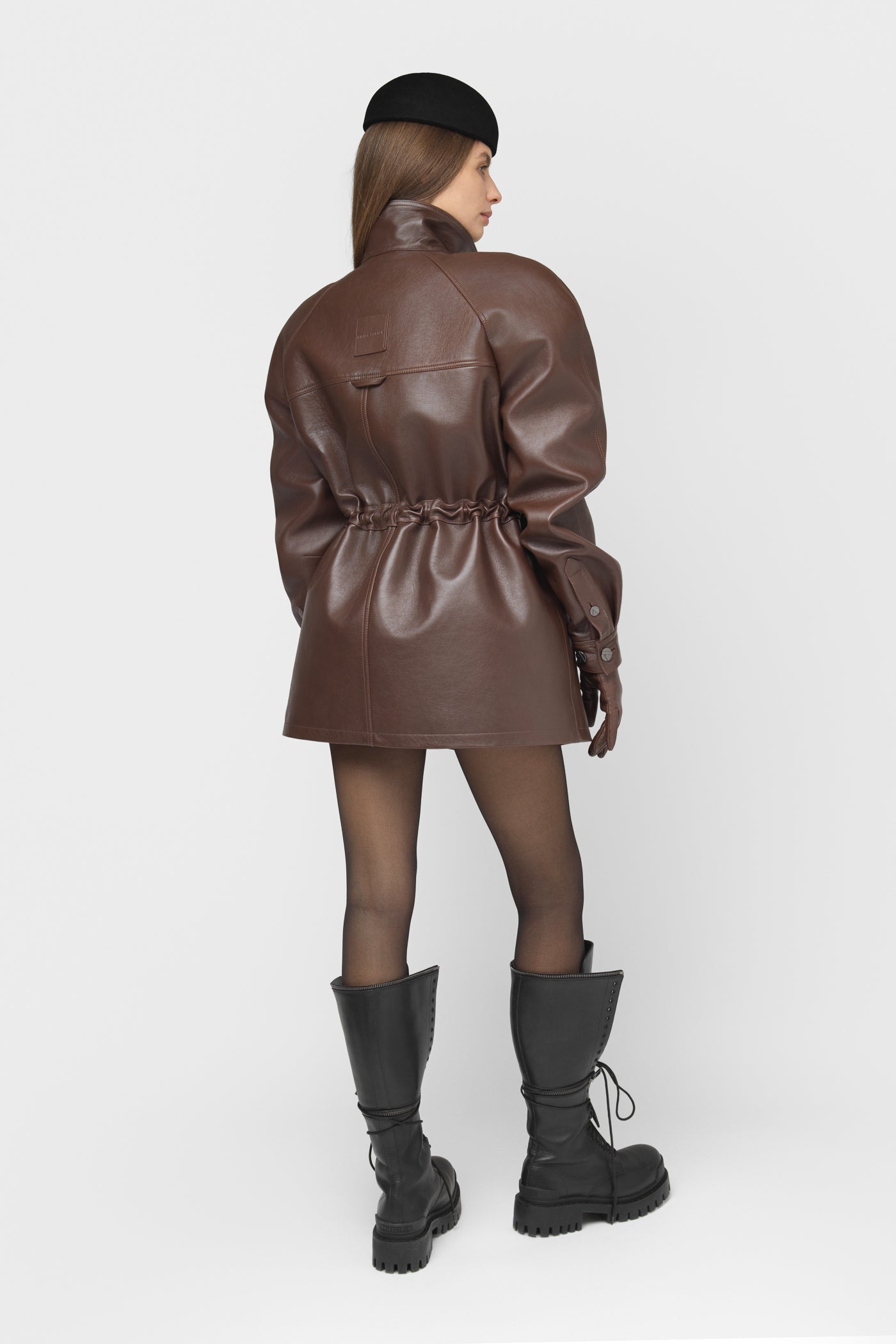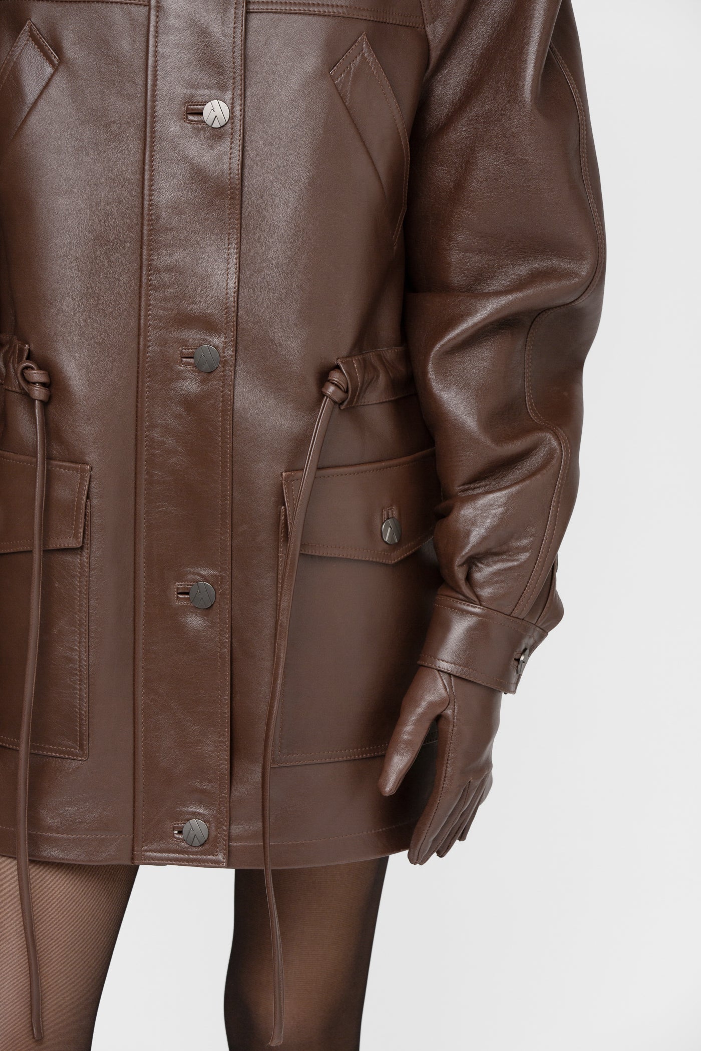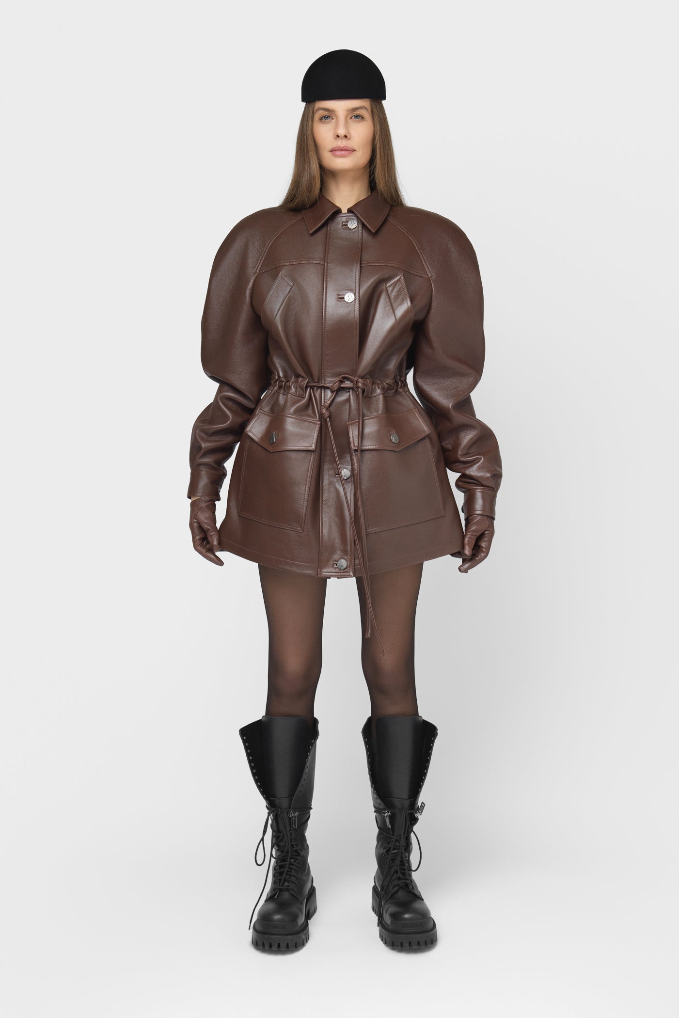 Moderni, struktūruota ir šiuolaikiška striukė, pasiūta iš natūralios odos. Rudos spalvos modelis su vienborčiu – paslėptu užsegimu, kuris sukuria švarų, estetišką vaizdą. Baltininė apykaklė ir dekoratyvinės vardinės metalinės sagos subtiliai pabrėžia išskirtinį modelio charakterį.